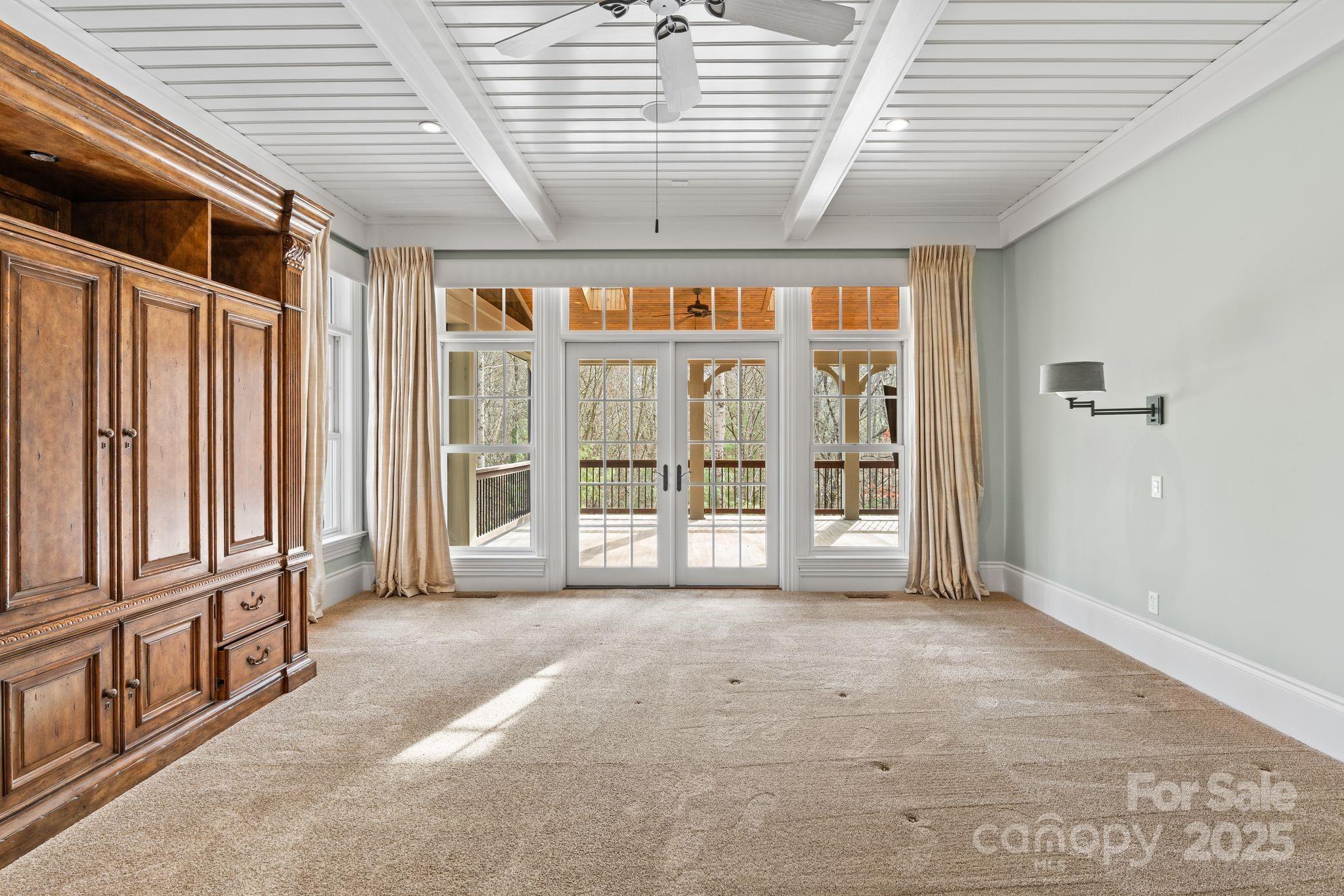 The heart of the home centers around a deluxe kitchen featuring custom cabinetry, a substantial center island, prep bar, and breakfast nook. This culinary space opens effortlessly to both the great room and the impressive 750-square-foot deck, creating an ideal environment for entertaining and daily living. The covered portion of this expansive deck includes high-end phantom screens, allowing you to customize your outdoor experience. The primary bedroom stands as a true retreat, featuring painted wood and beamed ceilings with direct access to a covered, screened deck. Radiant heating warms all bathroom floors throughout the home, while three stone gas fireplaces provide cozy gathering spots during cooler months.