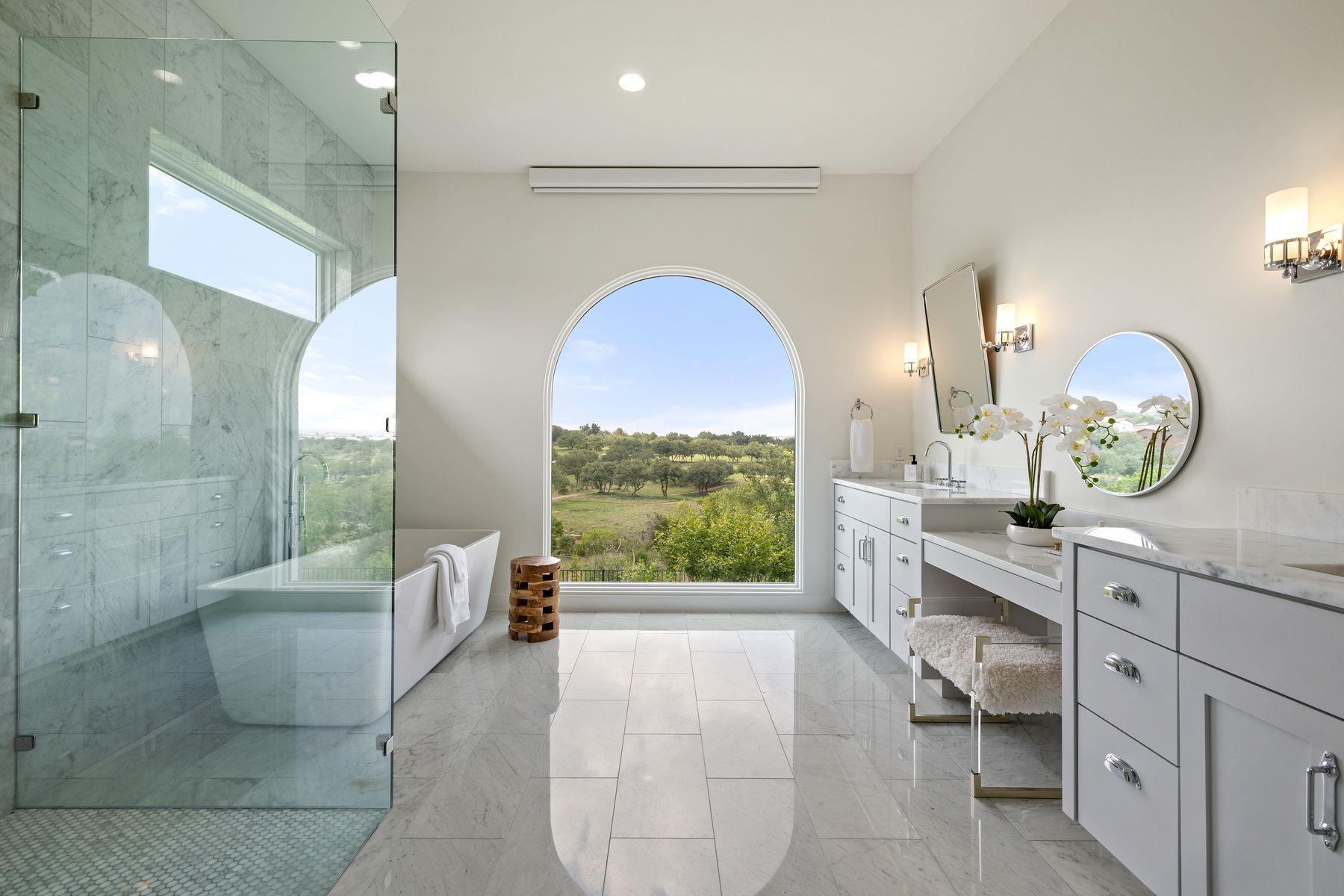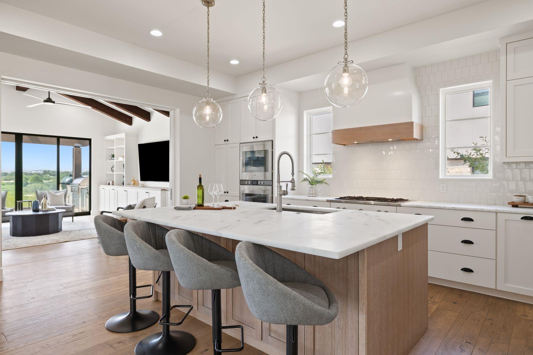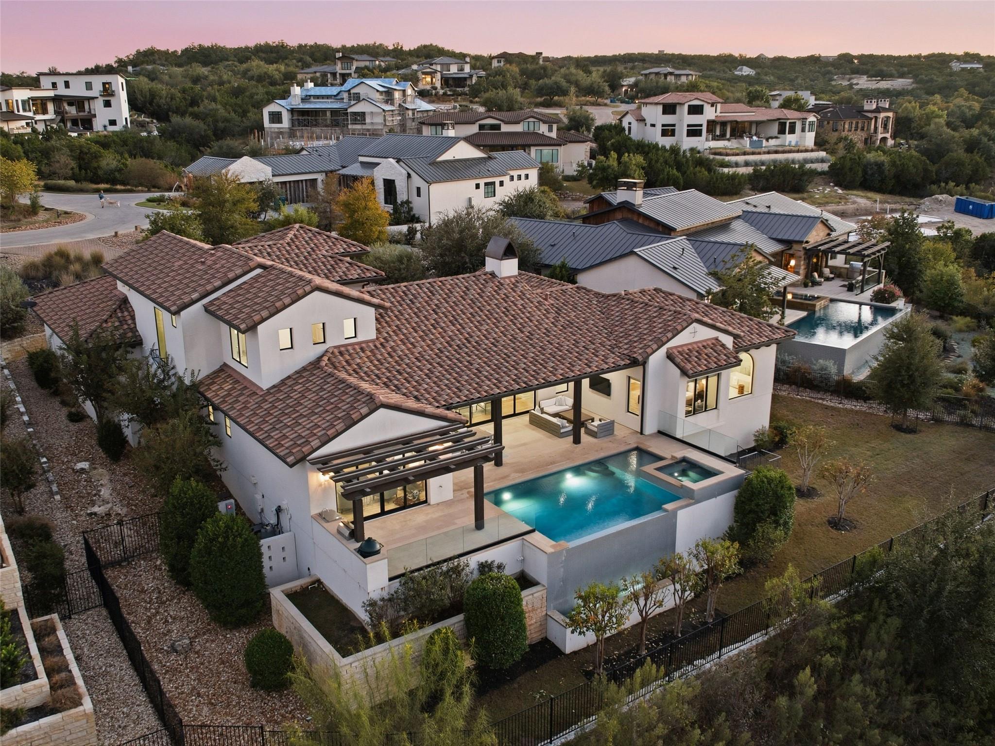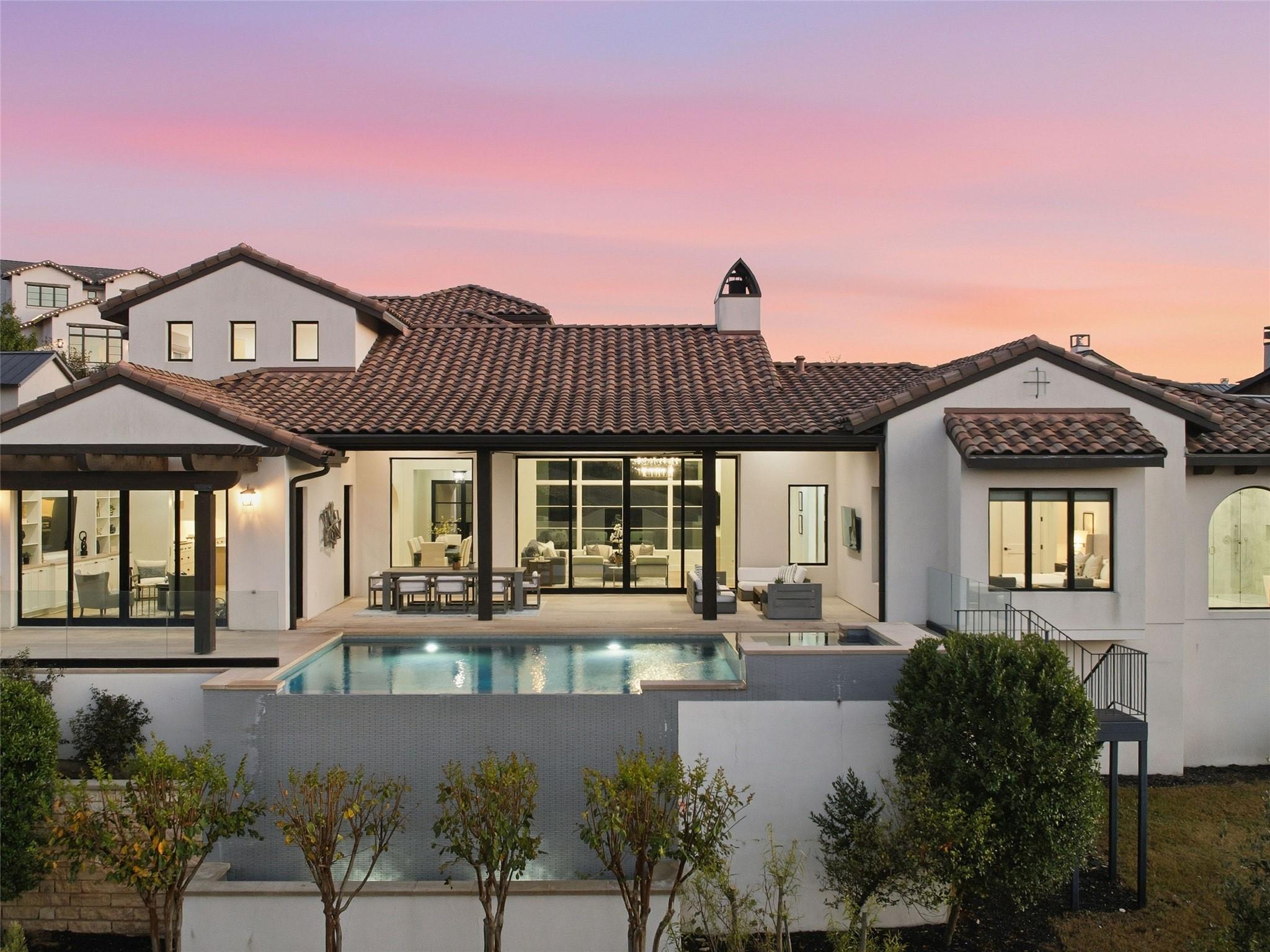 Set above the 5th hole of the Private Spanish Oaks Golf Club, this Santa Barbara–style luxury residence offers sweeping fairway views that define resort-style living in one of Austin’s most exclusive guard-gated communities. Designed for an elevated yet effortless lifestyle, the home is filled with natural light, delivering privacy, and timeless architecture. Located at the end of a quiet cul-de-sac within the 24/7 guard-gated Spanish Oaks community, the home lives primarily on the main level—featuring the primary suite, a secondary bedroom, laundry room, main living areas, garage, and all outdoor entertaining spaces on one floor. Exceptional craftsmanship is showcased throughout, including wide-plank white oak floors, premium Gaggenau appliances, and an open-concept design that flows seamlessly to expansive outdoor living. The gourmet kitchen is thoughtfully appointed with a large center island, double ovens, gas cooktop, and walk-in pantry, ideal for both everyday living and entertaining. The main-level primary suite is a serene retreat with breathtaking views, a spa-inspired bath with soaking tub and oversized walk-in shower, and a generous custom closet. A secondary main-level ensuite bedroom with private courtyard access offers flexibility for guests or a home office. Upstairs, a spacious loft provides a comfortable retreat, accompanied by two additional ensuite bedrooms. Outdoor living is truly exceptional, highlighted by an infinity-edge pool and spa, multiple covered lounging areas, and a full outdoor kitchen complete with two grills—including a Green Egg—refrigerator, and sink. A lower-level lawn adds space for play and pets. Residents of Spanish Oaks enjoy world-class amenities including a private championship golf course, resort-style pool, scenic trails, fish camp, and access to the Austin Tennis Academy. Located in highly acclaimed Lake Travis ISD, just minutes from Hill Country Galleria, fine dining, and approximately 15 miles to Downtown Austin.