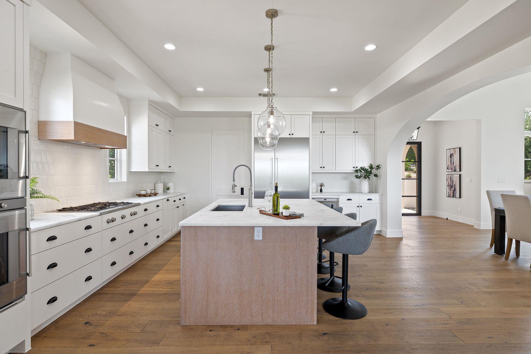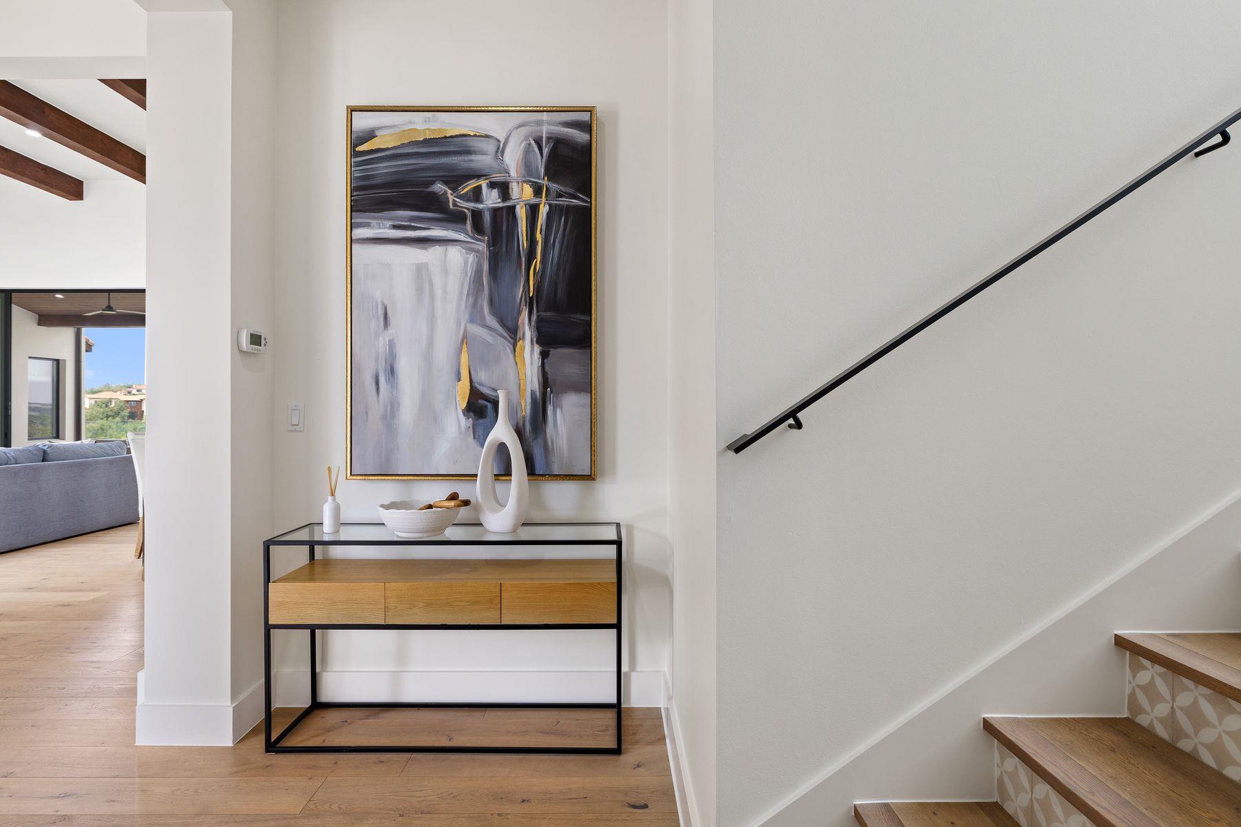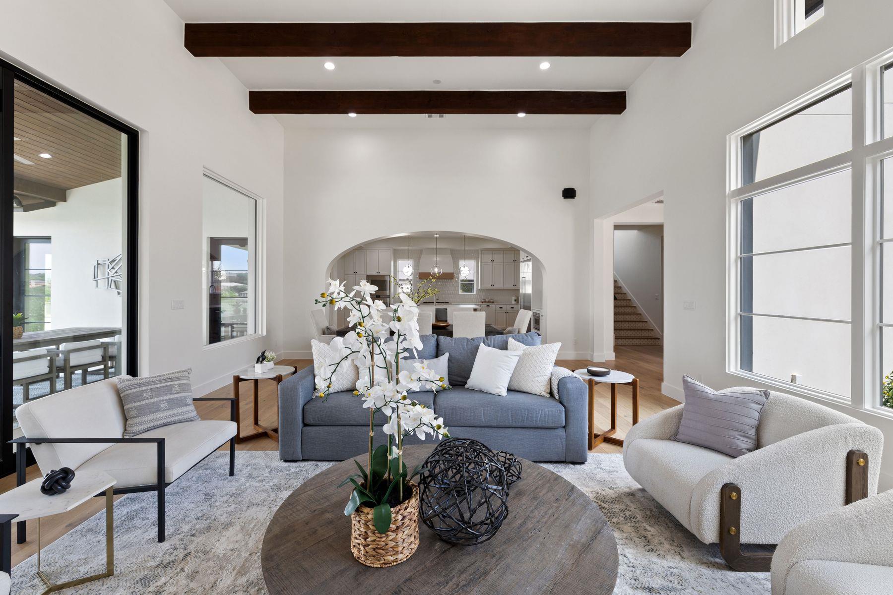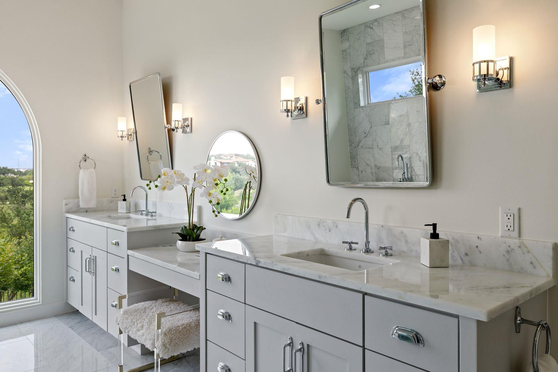 Set above the 5th hole of the Private Spanish Oaks Golf Club, this Santa Barbara–style luxury residence offers sweeping fairway views that define resort-style living in one of Austin’s most exclusive guard-gated communities. Designed for an elevated yet effortless lifestyle, the home is filled with natural light, delivering privacy, and timeless architecture. Located at the end of a quiet cul-de-sac within the 24/7 guard-gated Spanish Oaks community, the home lives primarily on the main level—featuring the primary suite, a secondary bedroom, laundry room, main living areas, garage, and all outdoor entertaining spaces on one floor. Exceptional craftsmanship is showcased throughout, including wide-plank white oak floors, premium Gaggenau appliances, and an open-concept design that flows seamlessly to expansive outdoor living. The gourmet kitchen is thoughtfully appointed with a large center island, double ovens, gas cooktop, and walk-in pantry, ideal for both everyday living and entertaining. The main-level primary suite is a serene retreat with breathtaking views, a spa-inspired bath with soaking tub and oversized walk-in shower, and a generous custom closet. A secondary main-level ensuite bedroom with private courtyard access offers flexibility for guests or a home office. Upstairs, a spacious loft provides a comfortable retreat, accompanied by two additional ensuite bedrooms. Outdoor living is truly exceptional, highlighted by an infinity-edge pool and spa, multiple covered lounging areas, and a full outdoor kitchen complete with two grills—including a Green Egg—refrigerator, and sink. A lower-level lawn adds space for play and pets. Residents of Spanish Oaks enjoy world-class amenities including a private championship golf course, resort-style pool, scenic trails, fish camp, and access to the Austin Tennis Academy. Located in highly acclaimed Lake Travis ISD, just minutes from Hill Country Galleria, fine dining, and approximately 15 miles to Downtown Austin.