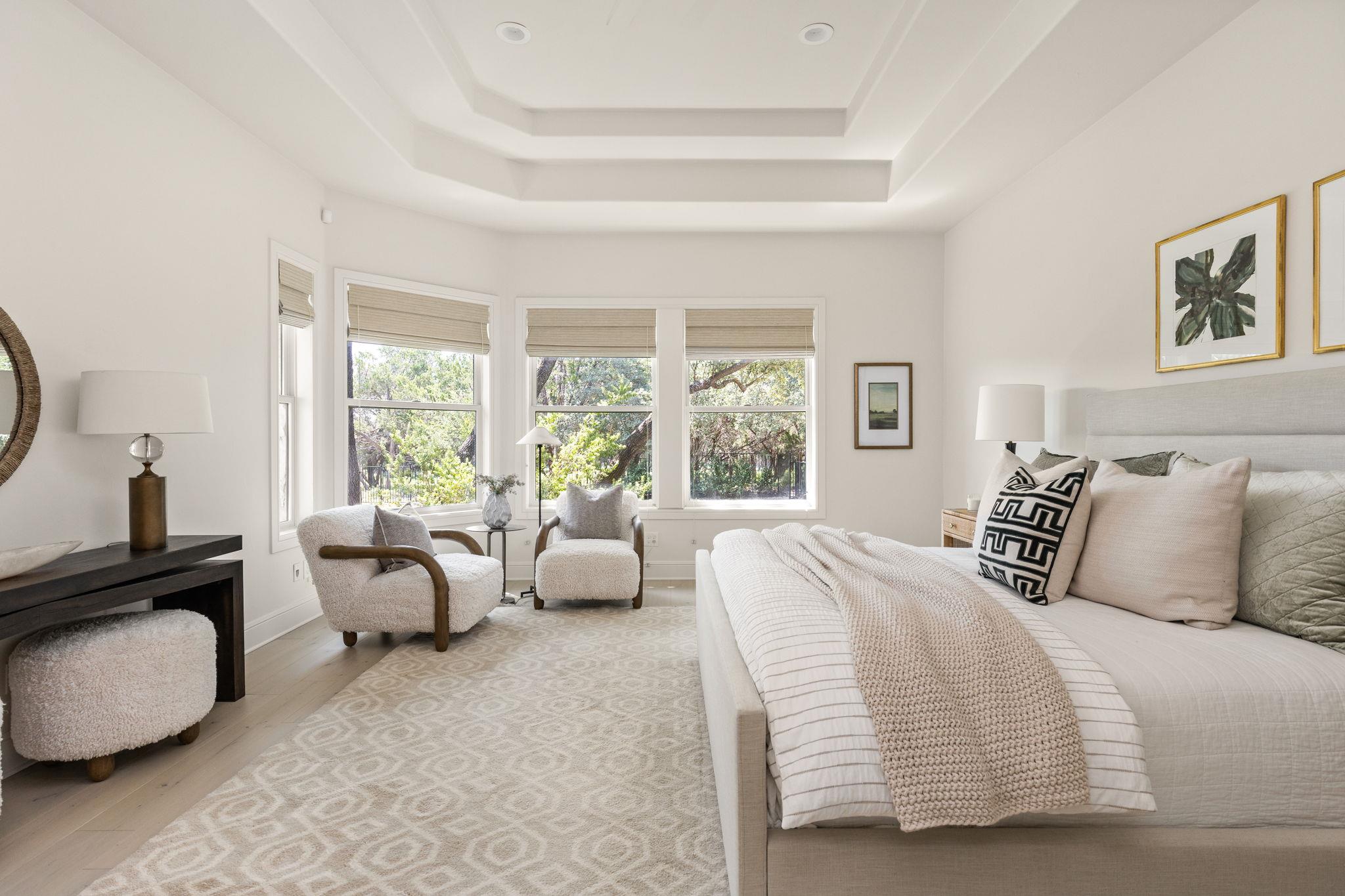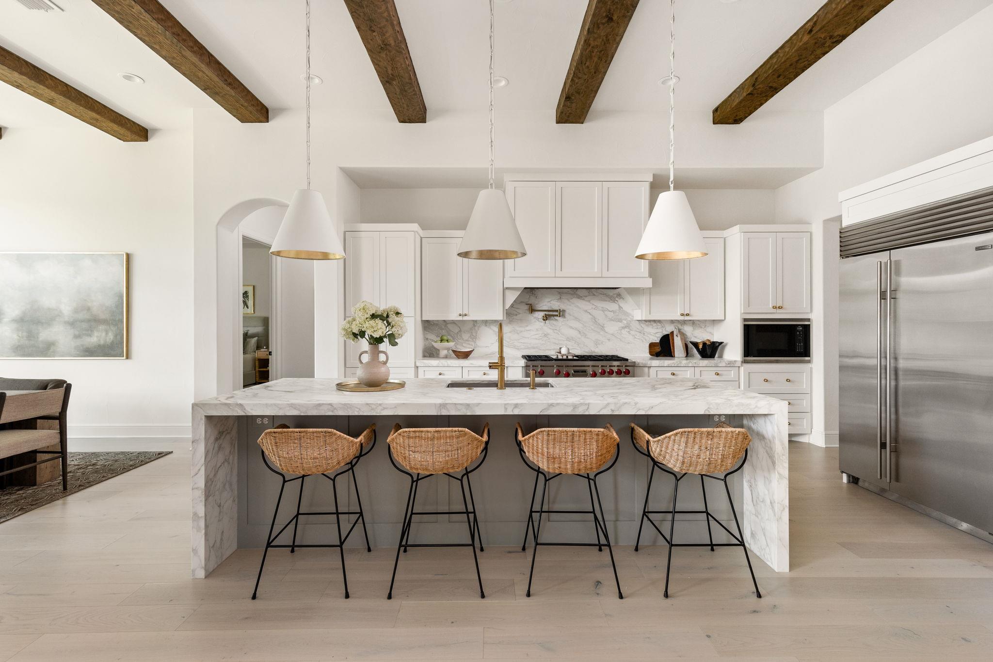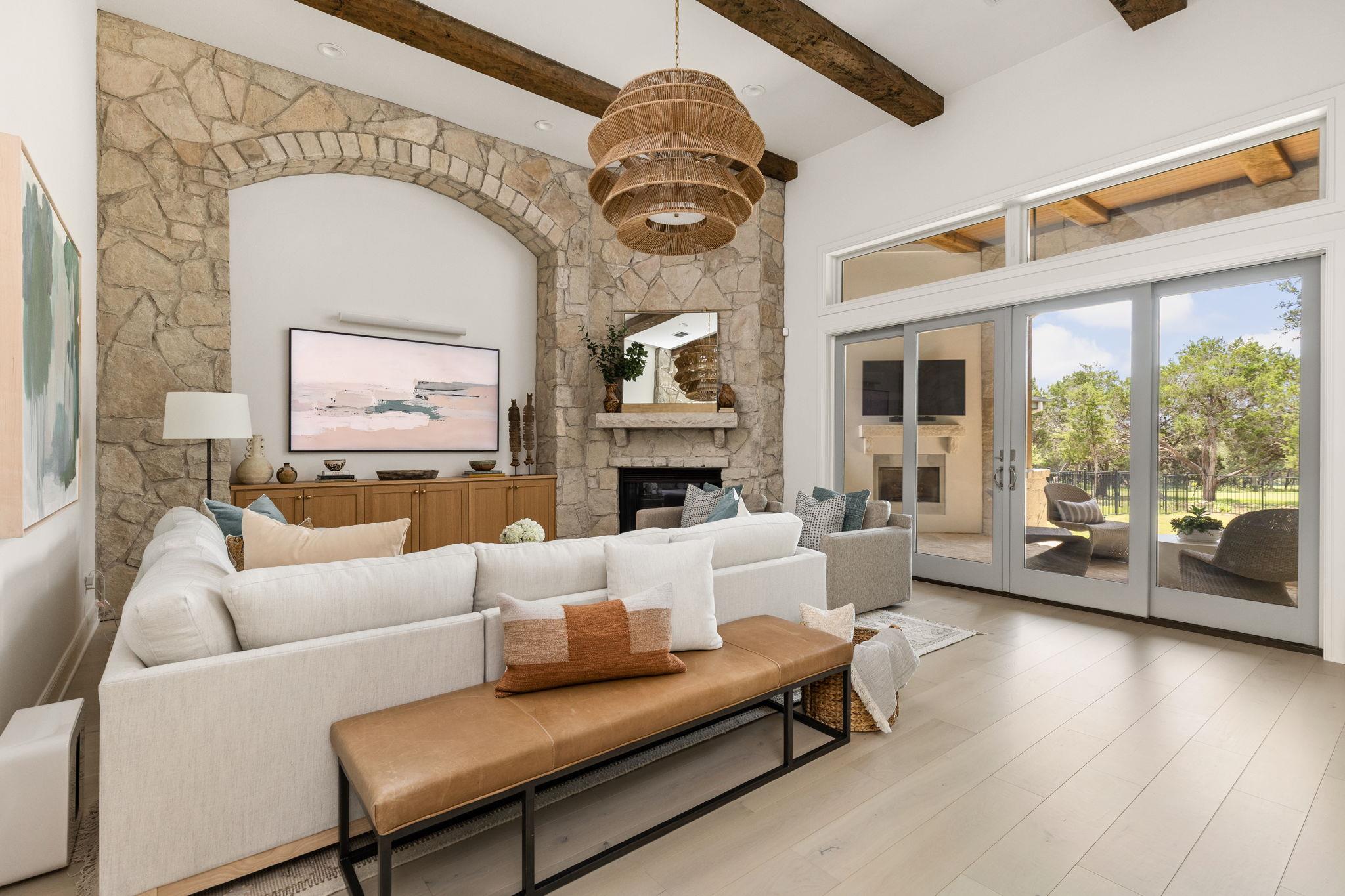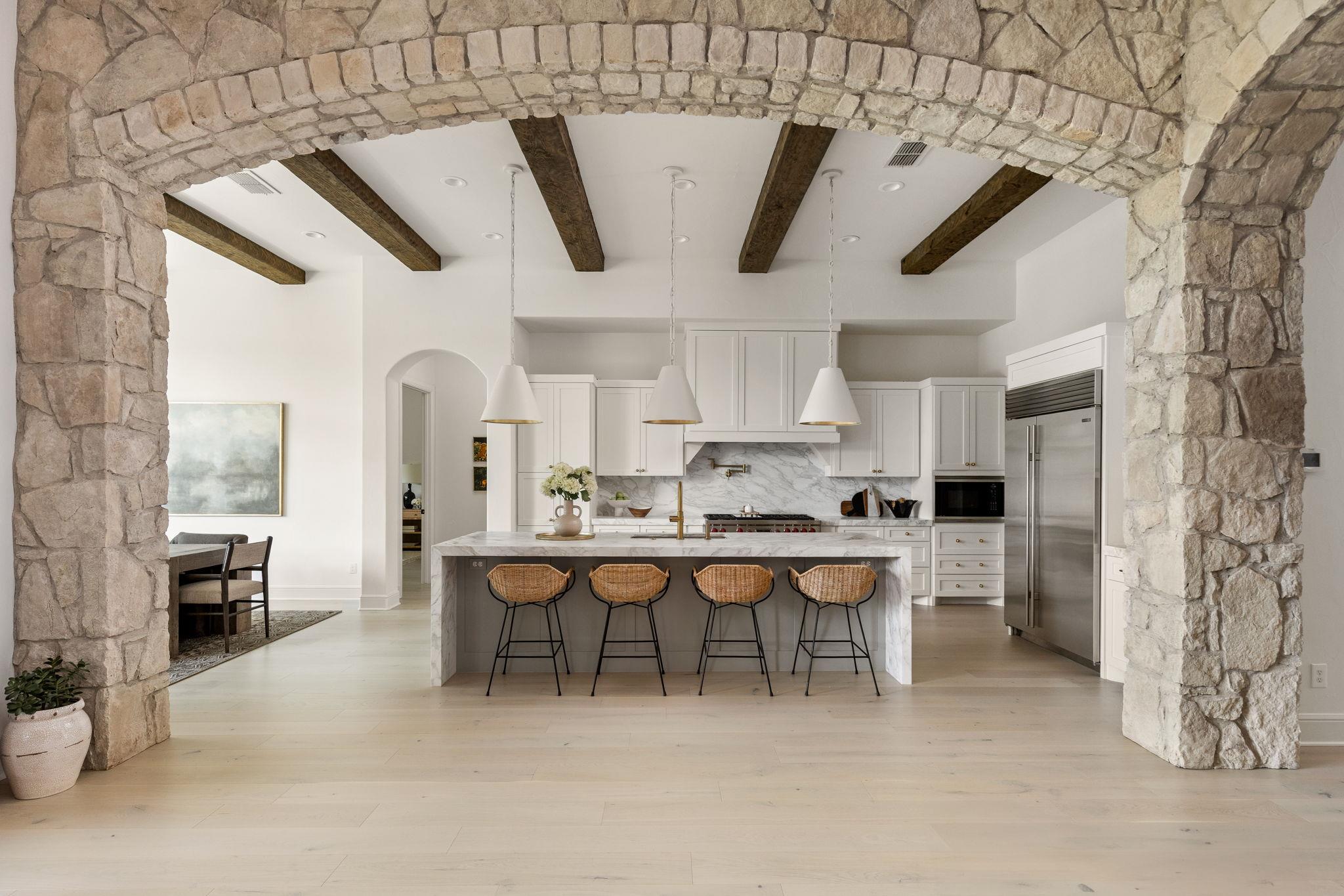 Tucked within the private gates of The Canyons section of Amarra in Barton Creek, this single-story residence offers privacy, elegance, and effortless Hill Country living. With sweeping views of the Fazio Canyons Golf Course, the home combines classic architecture with thoughtfully selected modern features. Designed for both comfort and entertaining, it offers three spacious bedrooms, each with an en suite bath, along with a dedicated office and powder room. At the heart of the home, a striking marble waterfall island anchors the kitchen. Professional-grade Wolf and Sub-Zero appliances, custom cabinetry, and a full-height marble backsplash create a space that is both functional and visually impressive. Brass fixtures and stylish pendant lighting add warmth and character, while wide-plank wood floors carry a sense of continuity into the surrounding living areas. The open living space is framed by soaring ceilings with exposed beams and a dramatic stone archway, leading to a wall of glass doors that fill the interior with natural light and open to the outdoor patio. Ideal for relaxing or entertaining, the covered patio includes a fireplace, built-in BBQ, and room for dining alfresco. The primary suite enjoys a private setting and features a spa-like bath with dual closets, a walk-in shower, and a soaking tub. The two-car garage and gated location provide security and ease, while the home’s access to Barton Creek’s club amenities and proximity to downtown Austin complete the offering. This is a rare opportunity to own a meticulously maintained home in one of Austin’s most sought-after golf course communities.
