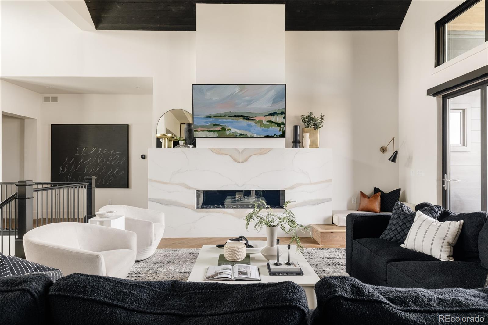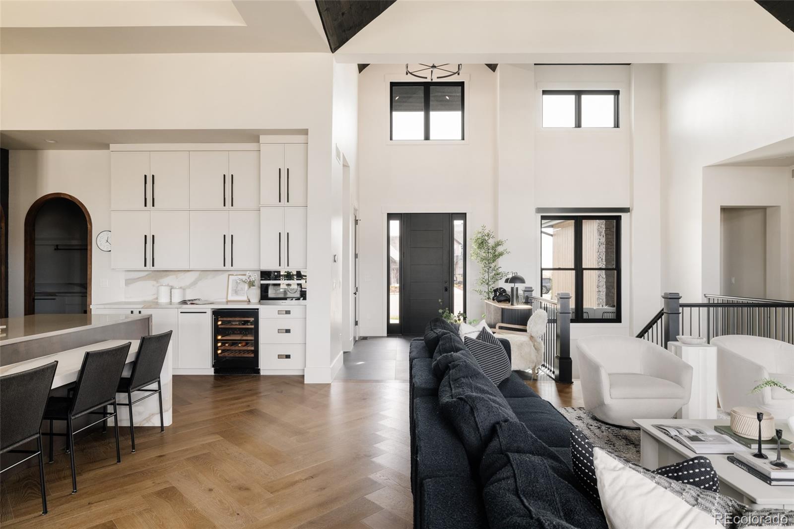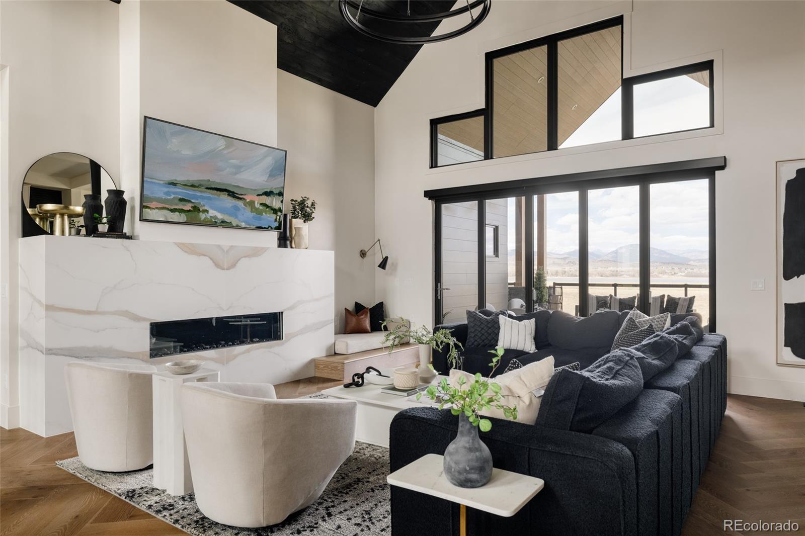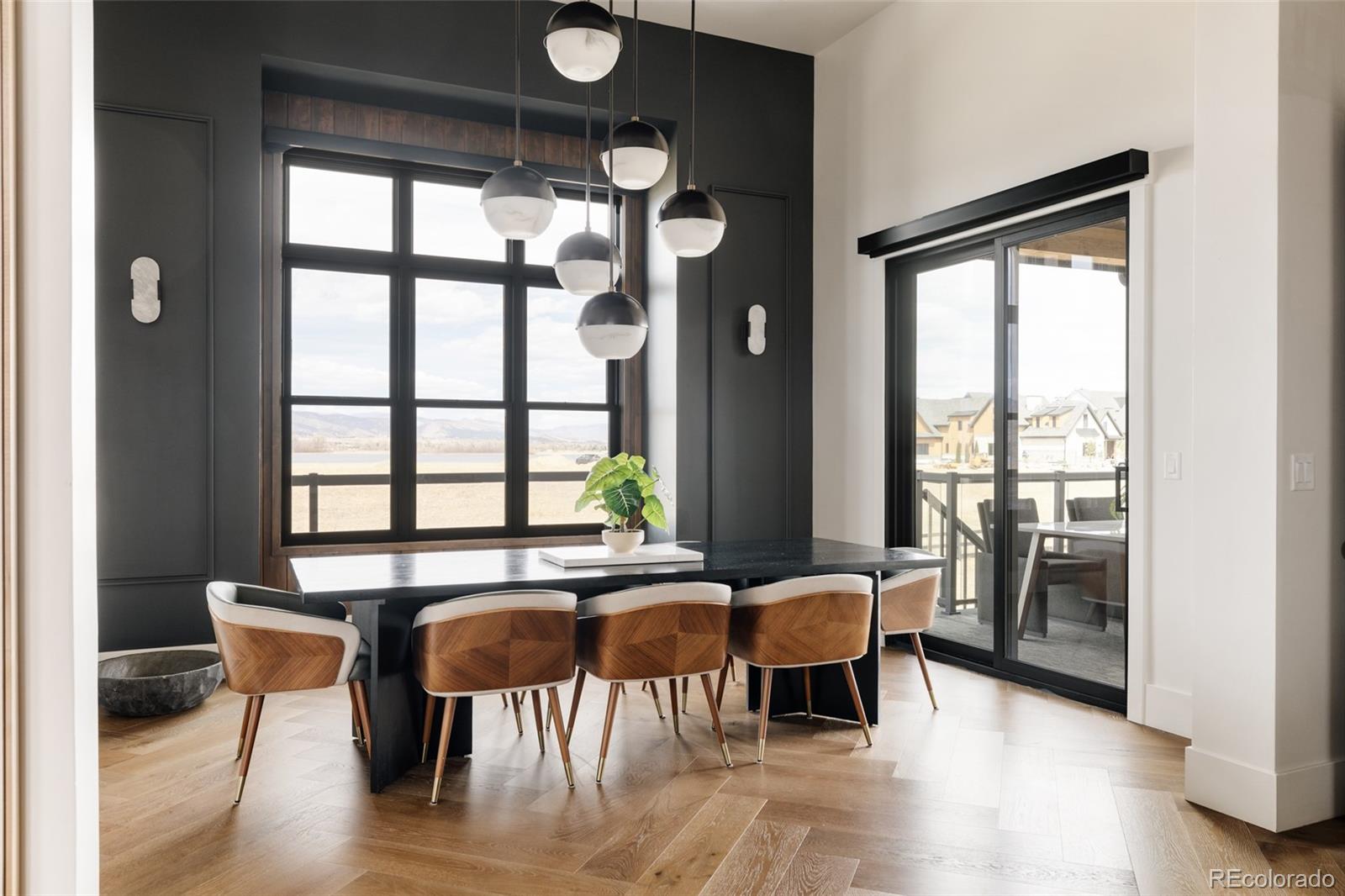 Award-winning Modern Mountain home—featured on HGTV’s Rock the Block—on a quiet cul-de-sac in the gated Rookery at Heron Lakes. The home makes a statement with soaring 5” beetle-kill pine vaulted ceilings, herringbone hardwood floors, a sleek linear gas fireplace & a striking RH chandelier. Motorized blinds & expansive windows flood the open-concept main level with light while framing serene views. The chef’s kitchen is a true centerpiece, blending design & performance with porcelain & quartz countertops, dark Emtek hardware with inset pulls, a 60” Ilve dual-oven gas range, Dacor refrigerator, freezer, dishwasher, built-in steam oven & a boutique-style pantry concealed behind rounded solid wood doors. Seamless indoor-outdoor living unfolds through expansive accordion doors opening to a covered deck with sweeping views of Lone Tree Reservoir, the Rookery & the Rocky Mountains—an exceptional setting for both quiet mornings & sunset entertaining. The main level hosts three ensuite bedrooms, including a luxurious primary retreat with radiant heated bathroom floors, a boutique custom closet & private laundry—one of three laundry areas throughout. A designer ombré bedroom adds a distinctive, curated touch. The walk-out lower level is designed for entertaining with a full second kitchen (Ilve range, Dacor appliances), a theater room with cork walls, tiered seating & custom lighting & a climate-controlled gym with overhead door access. Outdoor spaces rival a private resort with custom landscaping, locally sourced boulders, a water feature, private basketball court, putting green & turf yard with integrated drainage. The oversized garage features epoxy floors, built-in storage & a 240V EV outlet. Enjoy TPC golf privileges & access to resort-style amenities with an annual membership fee to the clubhouse, pool, fitness center, trails, dining & over 130 acres of open space—an elevated lifestyle within one of Northern Colorado’s most exclusive gated communities.