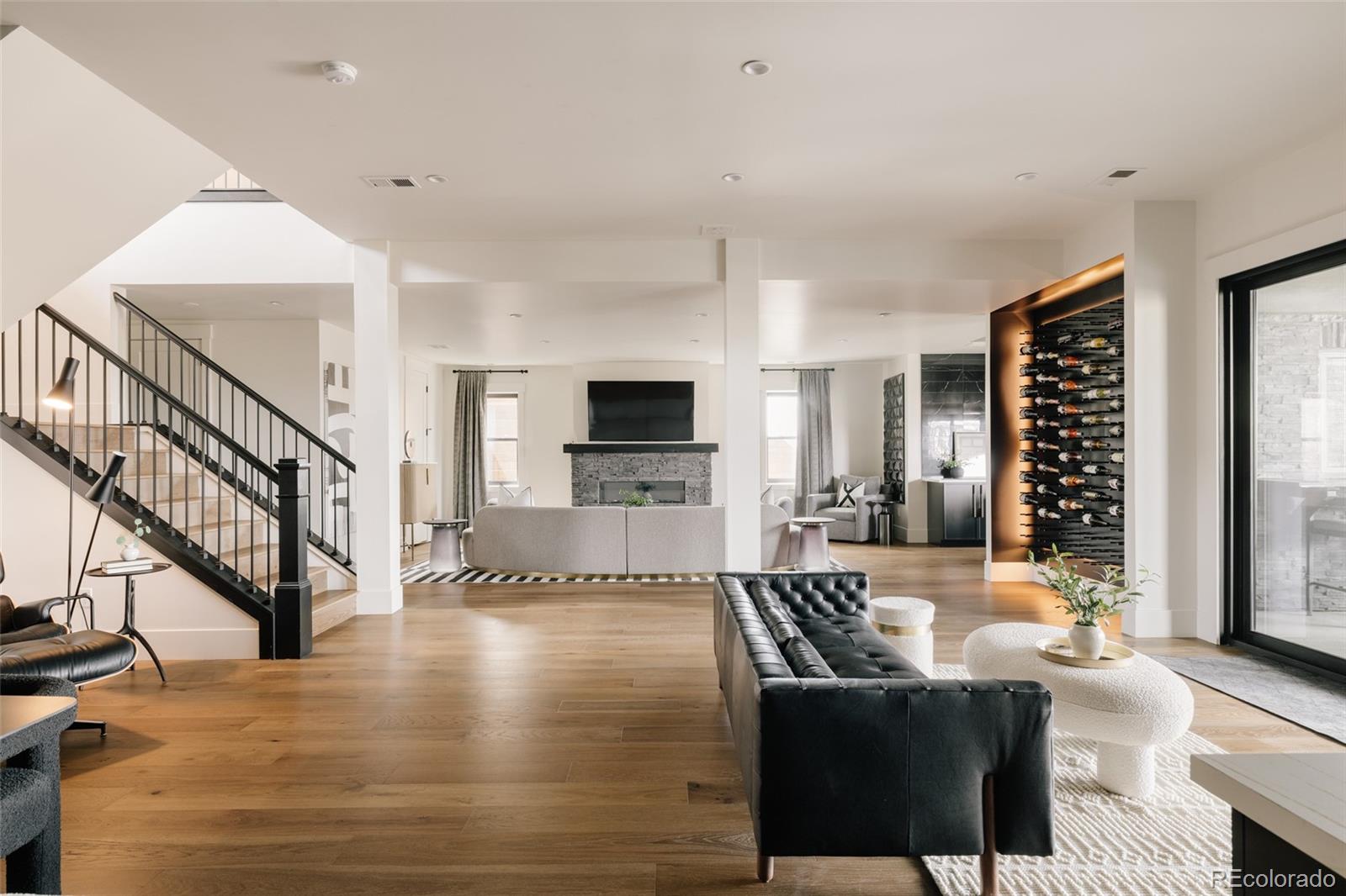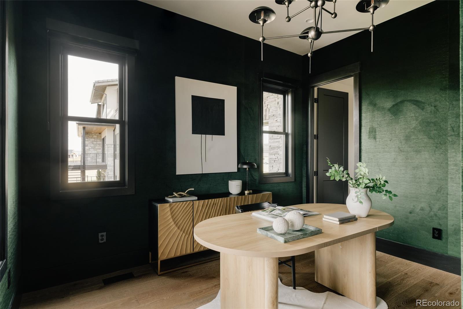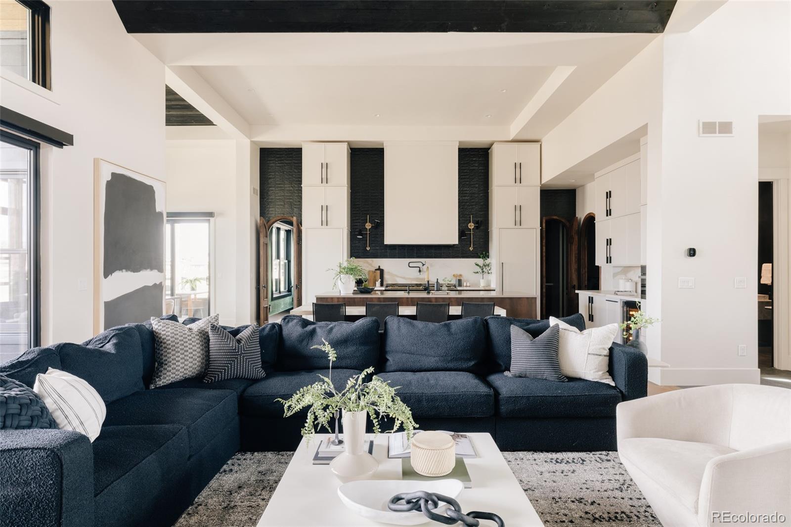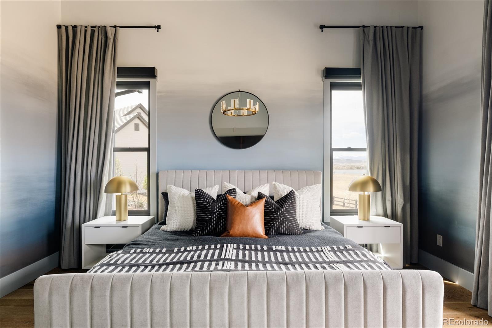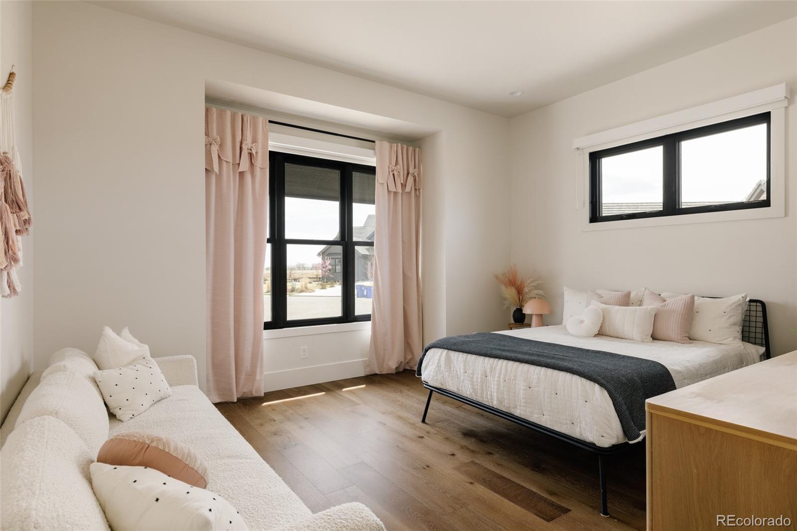 Award-winning Modern Mountain home—featured on HGTV’s Rock the Block—on a quiet cul-de-sac in the gated Rookery at Heron Lakes. The home makes a statement with soaring 5” beetle-kill pine vaulted ceilings, herringbone hardwood floors, a sleek linear gas fireplace & a striking RH chandelier. Motorized blinds & expansive windows flood the open-concept main level with light while framing serene views. The chef’s kitchen is a true centerpiece, blending design & performance with porcelain & quartz countertops, dark Emtek hardware with inset pulls, a 60” Ilve dual-oven gas range, Dacor refrigerator, freezer, dishwasher, built-in steam oven & a boutique-style pantry concealed behind rounded solid wood doors. Seamless indoor-outdoor living unfolds through expansive accordion doors opening to a covered deck with sweeping views of Lone Tree Reservoir, the Rookery & the Rocky Mountains—an exceptional setting for both quiet mornings & sunset entertaining. The main level hosts three ensuite bedrooms, including a luxurious primary retreat with radiant heated bathroom floors, a boutique custom closet & private laundry—one of three laundry areas throughout. A designer ombré bedroom adds a distinctive, curated touch. The walk-out lower level is designed for entertaining with a full second kitchen (Ilve range, Dacor appliances), a theater room with cork walls, tiered seating & custom lighting & a climate-controlled gym with overhead door access. Outdoor spaces rival a private resort with custom landscaping, locally sourced boulders, a water feature, private basketball court, putting green & turf yard with integrated drainage. The oversized garage features epoxy floors, built-in storage & a 240V EV outlet. Enjoy TPC golf privileges & access to resort-style amenities with an annual membership fee to the clubhouse, pool, fitness center, trails, dining & over 130 acres of open space—an elevated lifestyle within one of Northern Colorado’s most exclusive gated communities.
