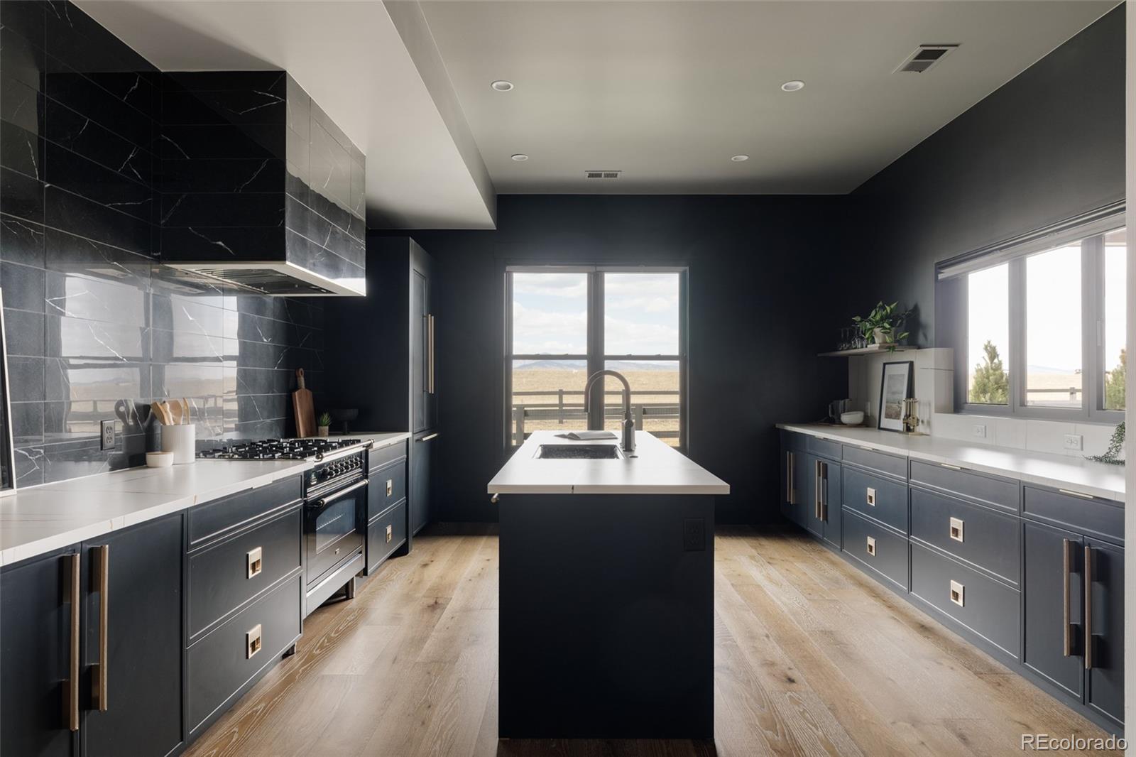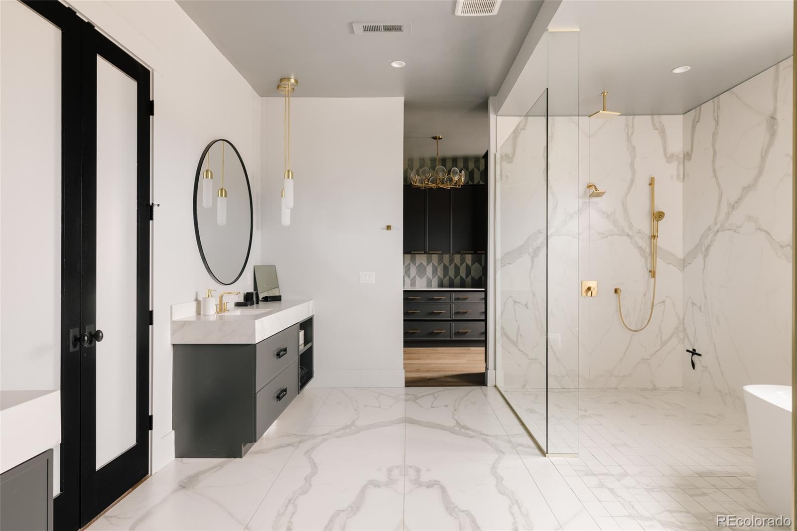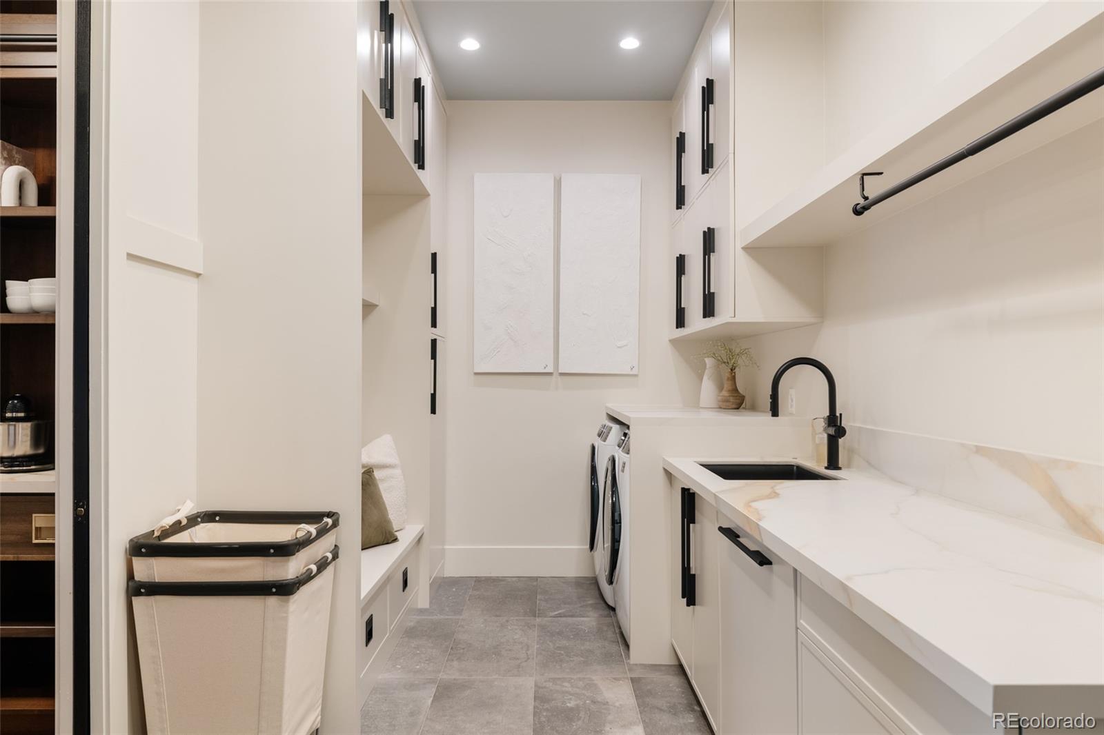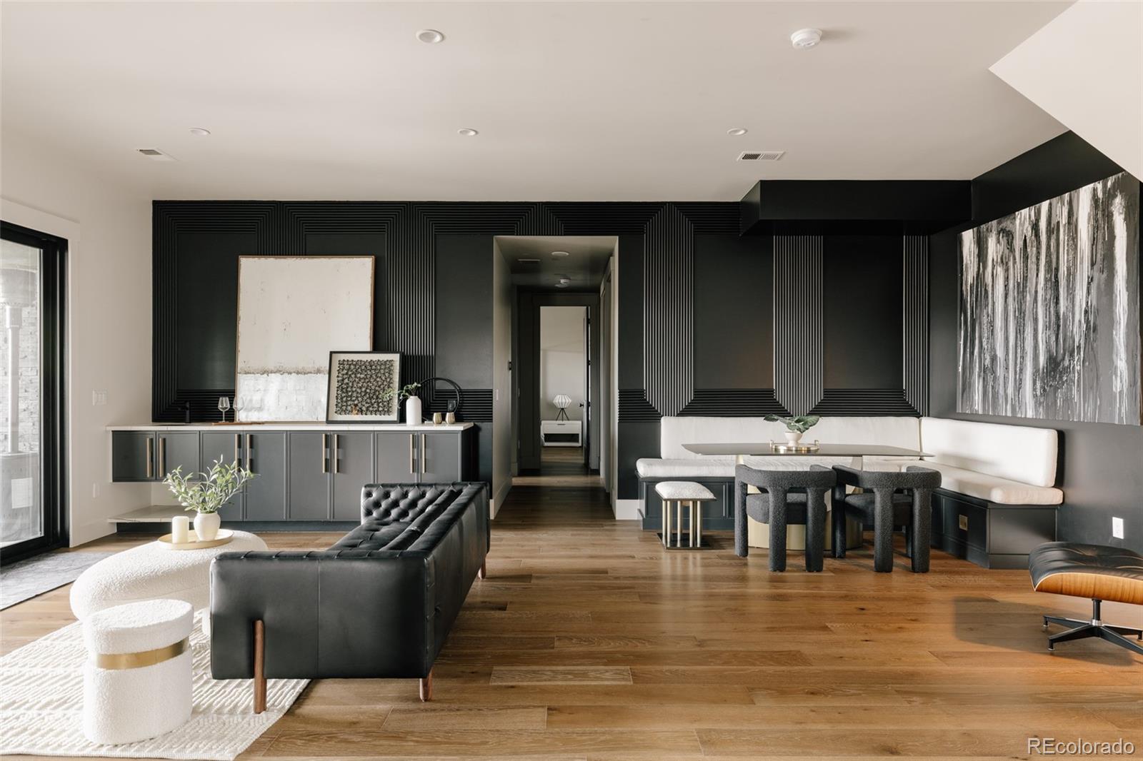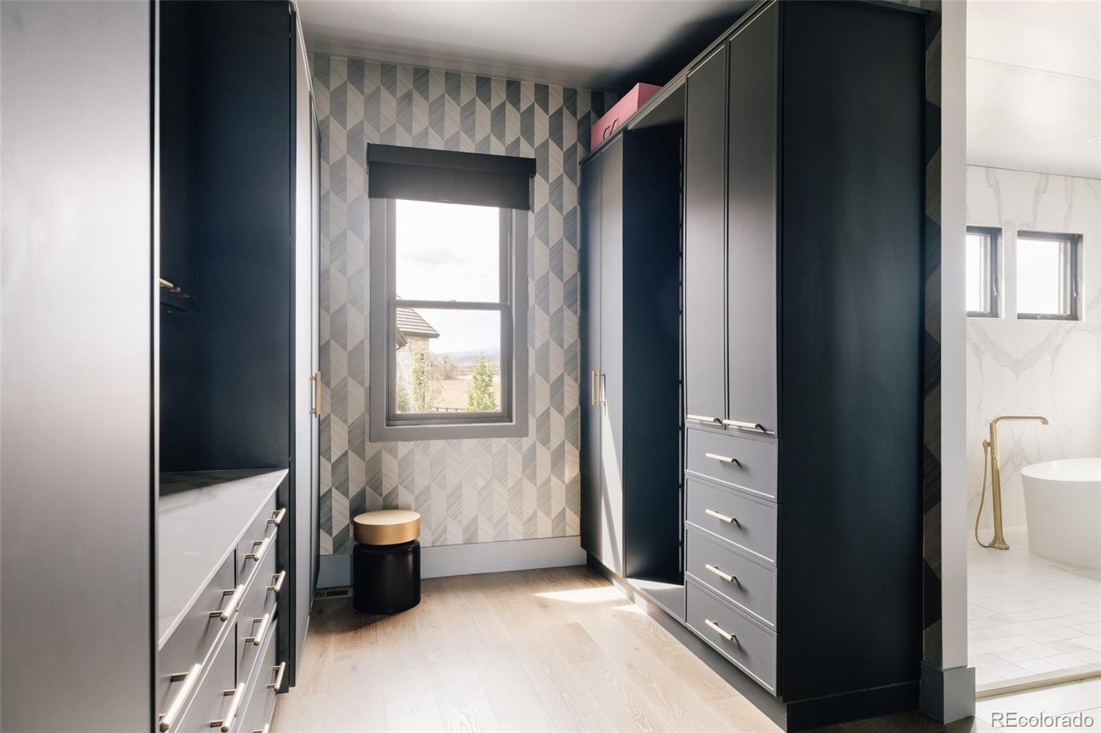 Award-winning Modern Mountain home—featured on HGTV’s Rock the Block—on a quiet cul-de-sac in the gated Rookery at Heron Lakes. The home makes a statement with soaring 5” beetle-kill pine vaulted ceilings, herringbone hardwood floors, a sleek linear gas fireplace & a striking RH chandelier. Motorized blinds & expansive windows flood the open-concept main level with light while framing serene views. The chef’s kitchen is a true centerpiece, blending design & performance with porcelain & quartz countertops, dark Emtek hardware with inset pulls, a 60” Ilve dual-oven gas range, Dacor refrigerator, freezer, dishwasher, built-in steam oven & a boutique-style pantry concealed behind rounded solid wood doors. Seamless indoor-outdoor living unfolds through expansive accordion doors opening to a covered deck with sweeping views of Lone Tree Reservoir, the Rookery & the Rocky Mountains—an exceptional setting for both quiet mornings & sunset entertaining. The main level hosts three ensuite bedrooms, including a luxurious primary retreat with radiant heated bathroom floors, a boutique custom closet & private laundry—one of three laundry areas throughout. A designer ombré bedroom adds a distinctive, curated touch. The walk-out lower level is designed for entertaining with a full second kitchen (Ilve range, Dacor appliances), a theater room with cork walls, tiered seating & custom lighting & a climate-controlled gym with overhead door access. Outdoor spaces rival a private resort with custom landscaping, locally sourced boulders, a water feature, private basketball court, putting green & turf yard with integrated drainage. The oversized garage features epoxy floors, built-in storage & a 240V EV outlet. Enjoy TPC golf privileges & access to resort-style amenities with an annual membership fee to the clubhouse, pool, fitness center, trails, dining & over 130 acres of open space—an elevated lifestyle within one of Northern Colorado’s most exclusive gated communities.