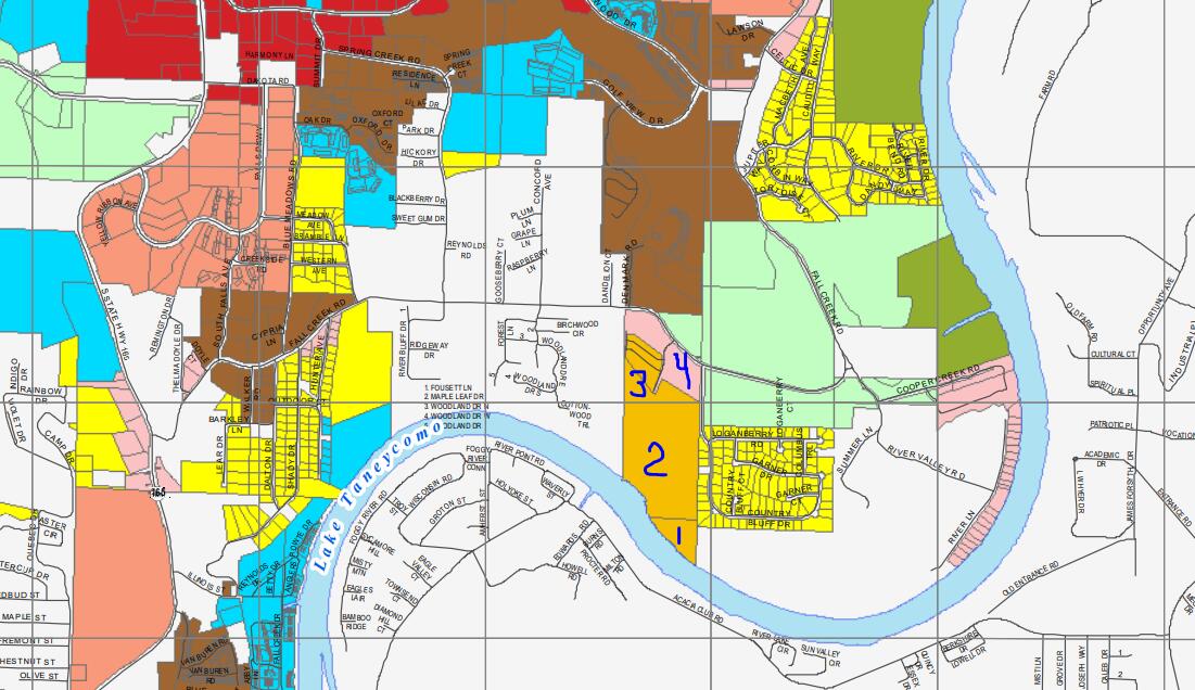 58.5 Acres of Prime Development Land with Panoramic Bluff Views & Waterfront FrontageAn extraordinary opportunity awaits developers, investors, and visionaries! This rare 58.5-acre estate offers bluff waterfront frontage overlooking the shimmering waters of Lake Taneycomo, with breathtaking nearly 300-degree panoramic views of the city skyline, lush Ozark woodlands, and the water below. Over 90% cleared, the land is primed for your vision -- whether it's a luxury condo community, resort, mixed-use development, or private estate.Currently divided into four parcels -- the front Neighborhood Commercial lot with paved Fall Creek Road frontage and a stately gated entrance with wood fencing, plus three Medium Density Residential parcels -- this property combines curb appeal, flexibility, and unmatched potential. Mostly gentle slope and flat terrain, with a year-round creek, a peaceful pond, and multiple build sites offering jaw-dropping views.From waterview possibilities to bluff-top builds, the opportunities are endless. Enjoy prime location just minutes from Branson's top attractions, shopping, dining, and entertainment. Whether you're developing upscale condos, boutique lodging, or a signature residential neighborhood, this acreage delivers location, scenery, and market demand all in one.This is more than land -- it's a blank canvas for your legacy project in one of the fastest-growing and most desirable areas of the Ozarks.