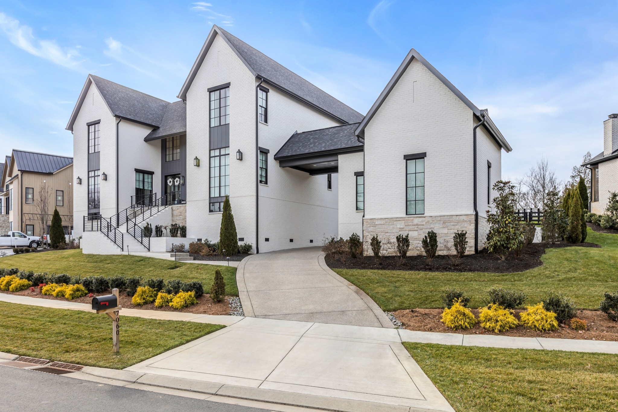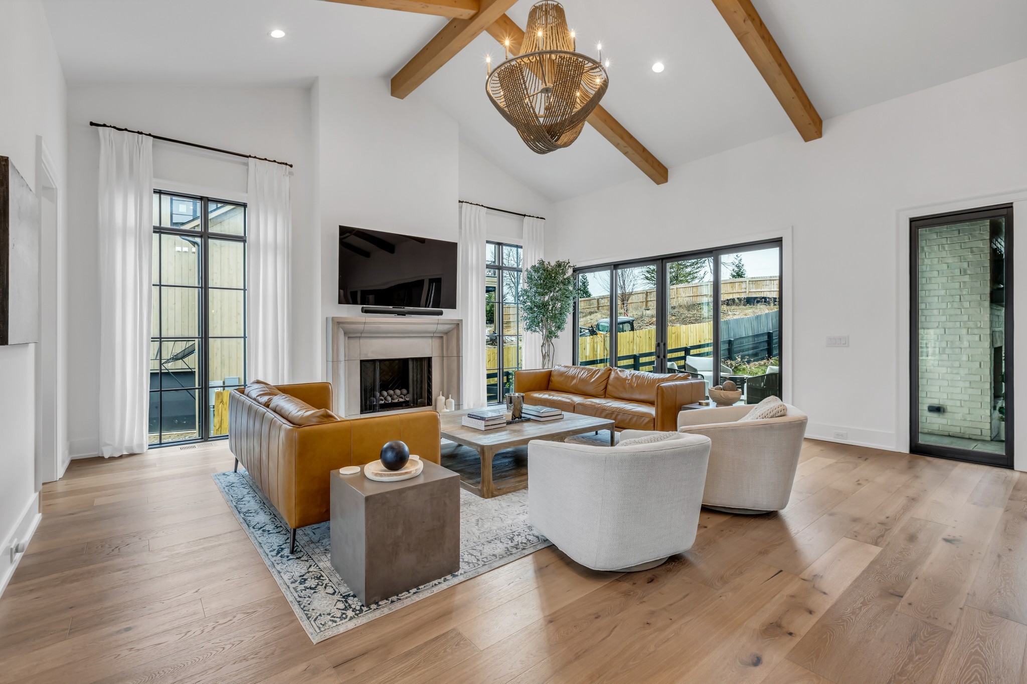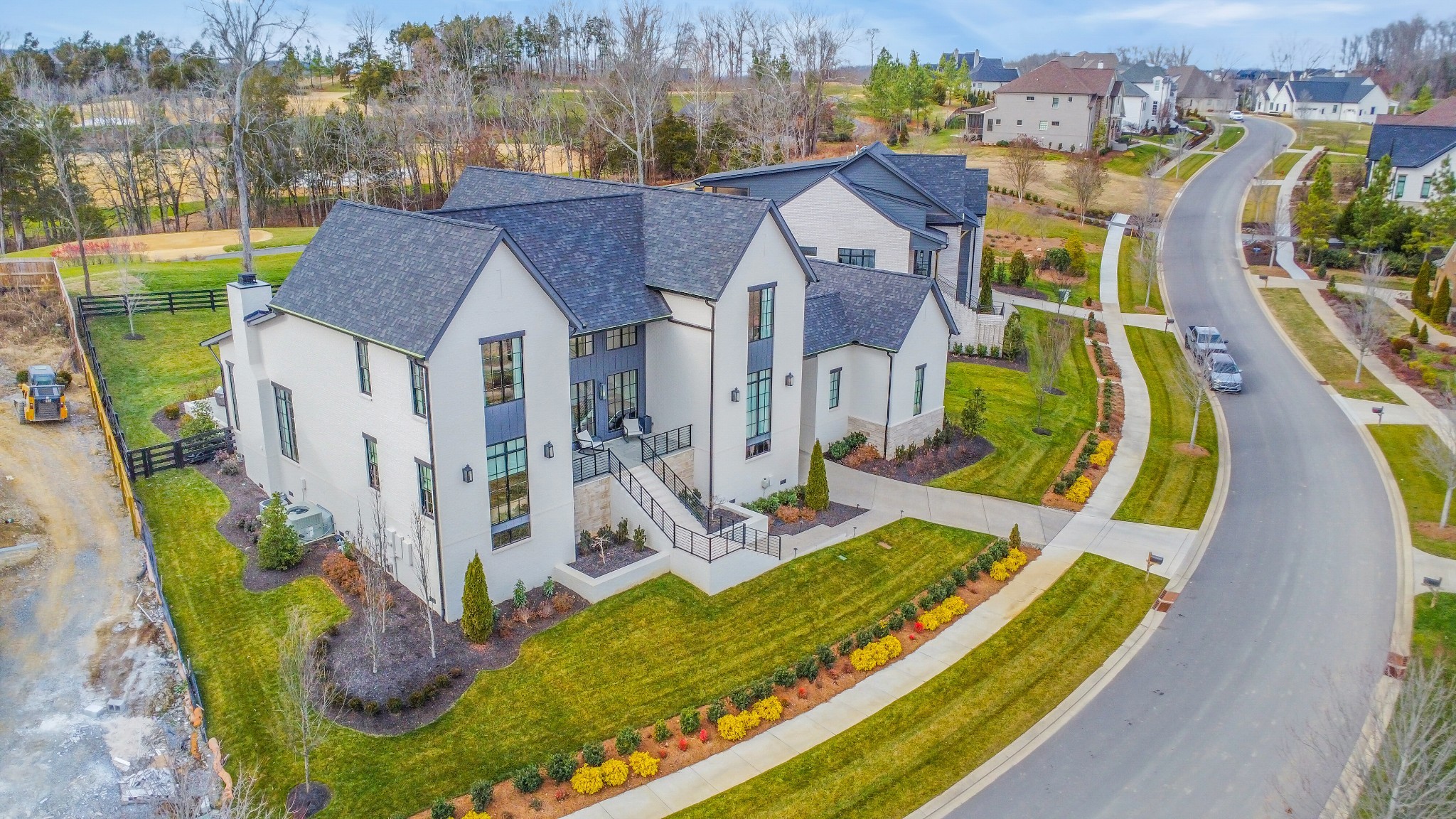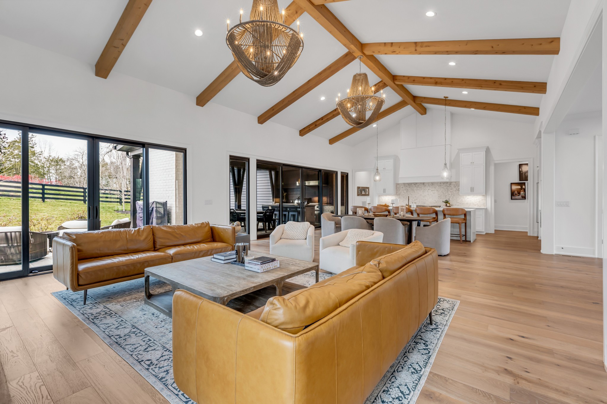 Welcome to this stunning custom-built residence in the prestigious Troubadour Golf & Field Club, crafted by Tennessee Valley Homes in 2022. Spanning 5,929 square feet on a 0.45-acre lot, this architectural masterpiece combines modern elegance with timeless design, offering an unparalleled lifestyle in one of Middle Tennessee’s most sought-after communities. This home features five spacious bedrooms, five full bathrooms, and two half baths, providing ample space for family and guests. Step inside to discover an open-concept floor plan flooded with natural light and adorned with wide-plank hardwood floors. The soaring ceilings and exposed beams create a sense of grandeur, while sleek, modern finishes provide a warm and inviting atmosphere. The gourmet kitchen boasts top-of-the-line appliances, a large island, and seamless flow into the dining and living areas—perfect for entertaining. A dedicated office space with custom millwork and large windows offers serene views and an ideal work-from-home environment. The luxurious primary suite serves as a private retreat, featuring a spa-like bathroom and generous closet space.