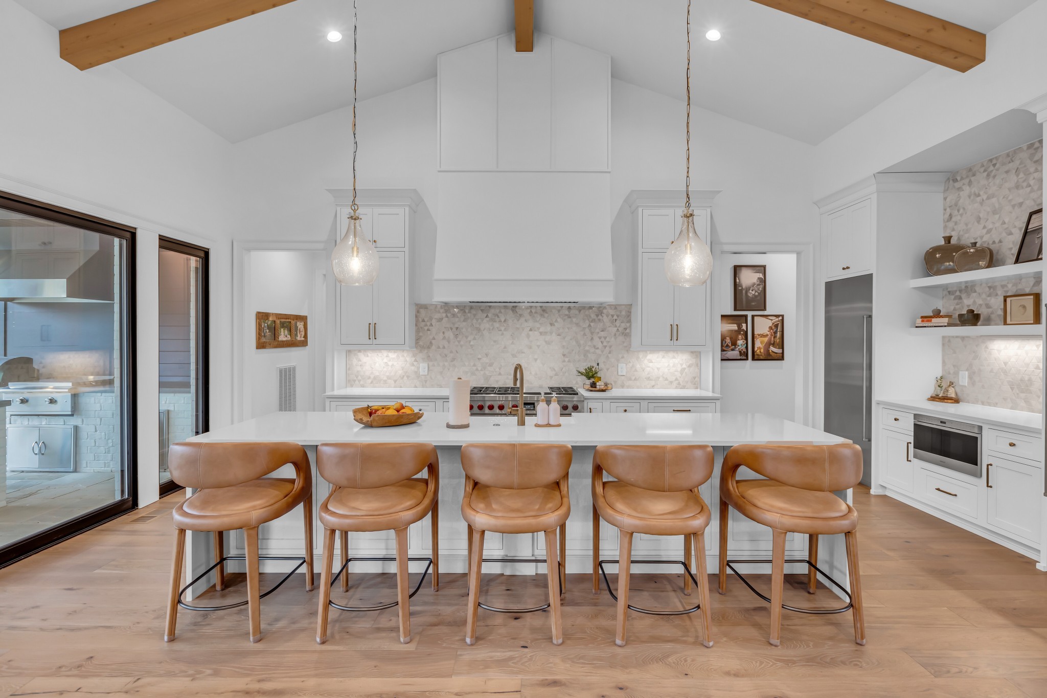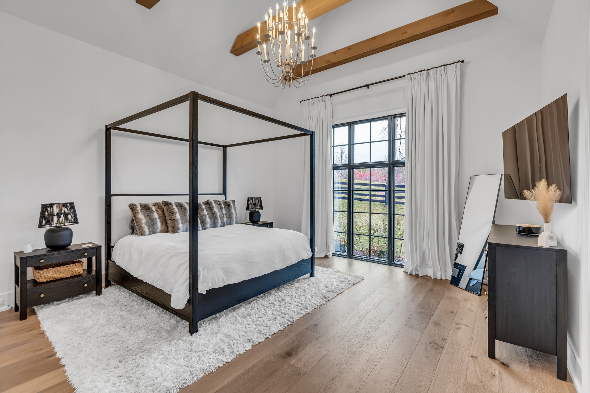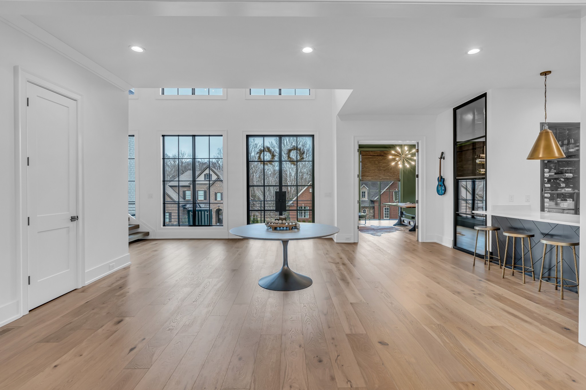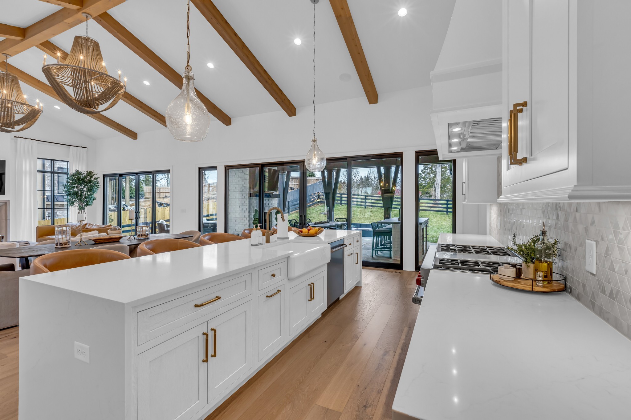 Welcome to this stunning custom-built residence in the prestigious Troubadour Golf & Field Club, crafted by Tennessee Valley Homes in 2022. Spanning 5,929 square feet on a 0.45-acre lot, this architectural masterpiece combines modern elegance with timeless design, offering an unparalleled lifestyle in one of Middle Tennessee’s most sought-after communities. This home features five spacious bedrooms, five full bathrooms, and two half baths, providing ample space for family and guests. Step inside to discover an open-concept floor plan flooded with natural light and adorned with wide-plank hardwood floors. The soaring ceilings and exposed beams create a sense of grandeur, while sleek, modern finishes provide a warm and inviting atmosphere. The gourmet kitchen boasts top-of-the-line appliances, a large island, and seamless flow into the dining and living areas—perfect for entertaining. A dedicated office space with custom millwork and large windows offers serene views and an ideal work-from-home environment. The luxurious primary suite serves as a private retreat, featuring a spa-like bathroom and generous closet space.