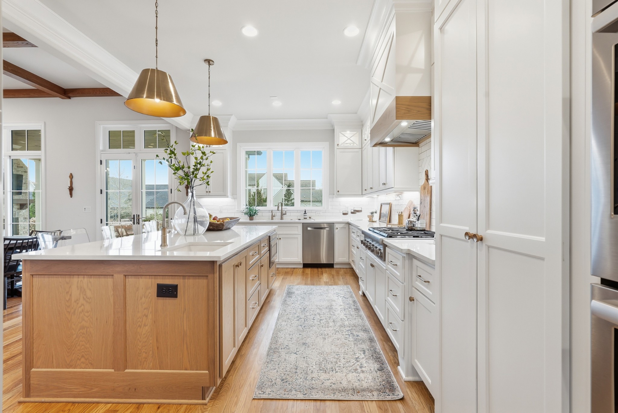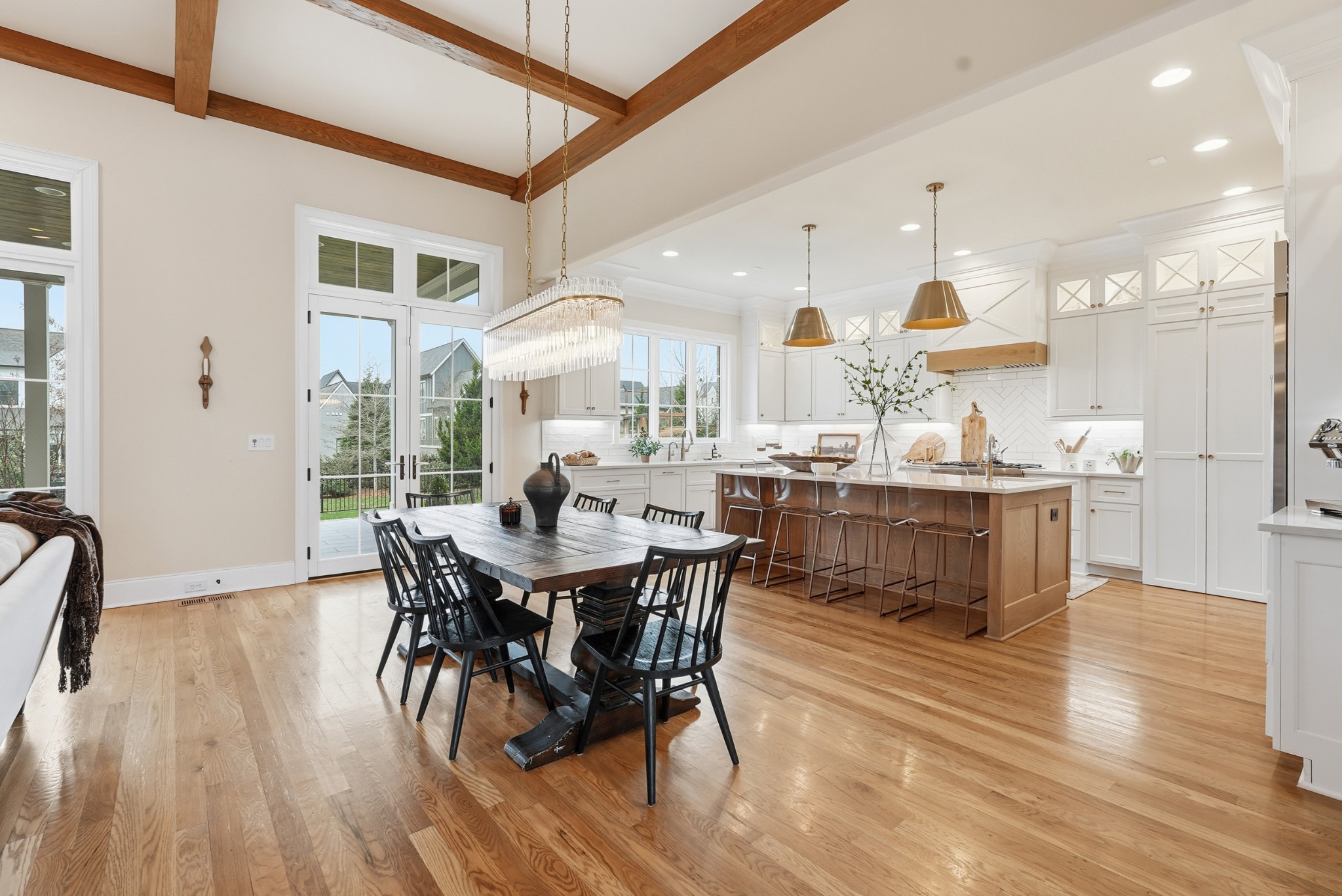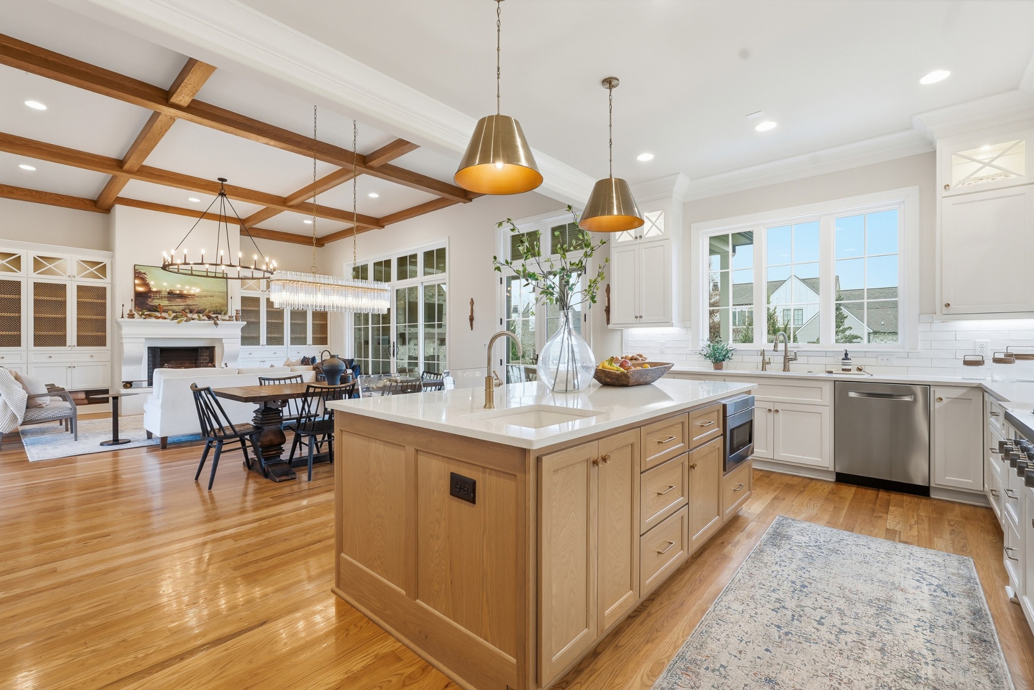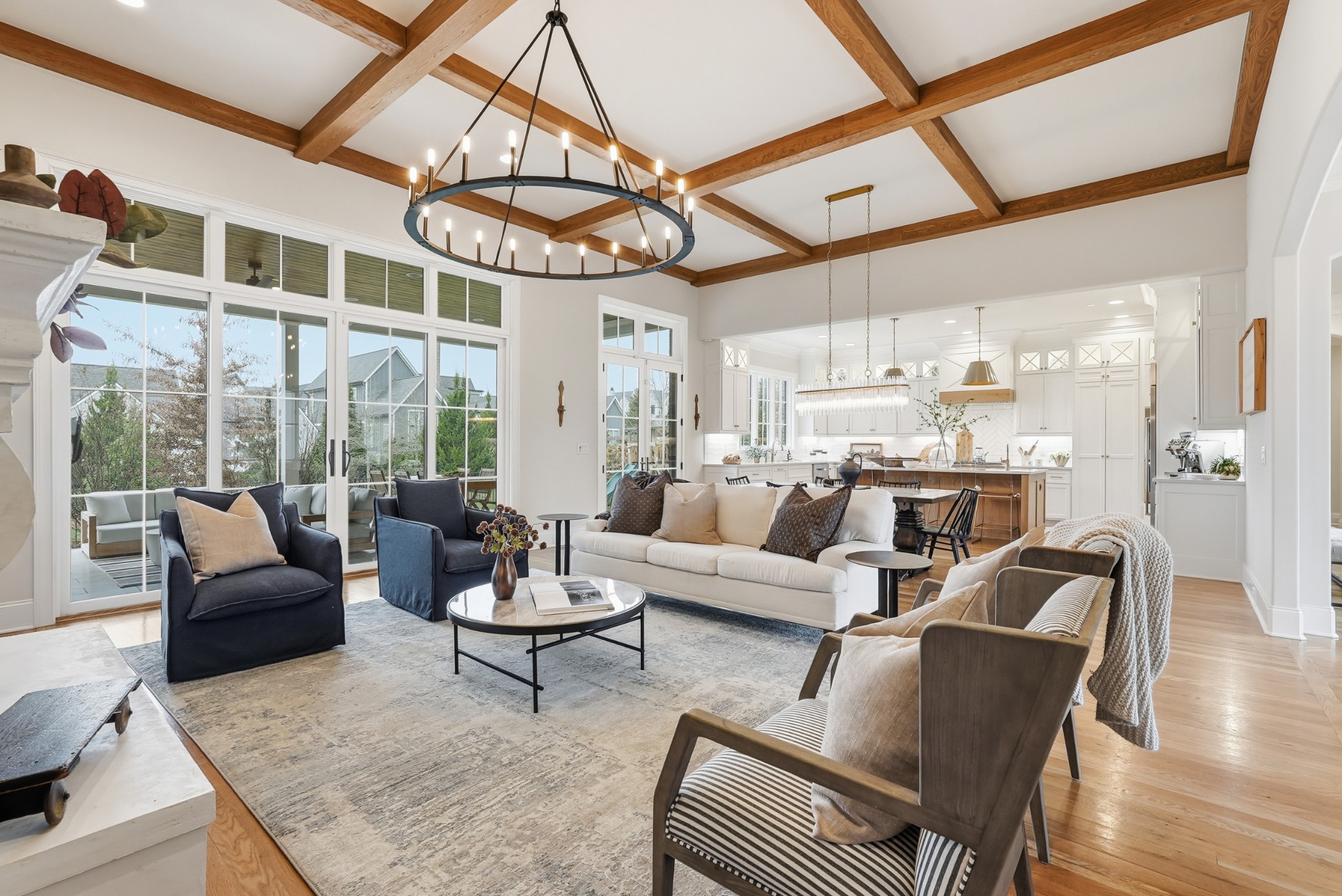 The main level features high ceilings, abundant natural light, and hardwood floors throughout. The living room is anchored by a wood-burning fireplace with custom built-ins and exposed beam ceilings, creating a warm and inviting gathering space that flows seamlessly into the dining area and kitchen. The kitchen is beautifully appointed with generous counter space, custom cabinetry, double ovens, a hidden walk-in pantry, and a dedicated coffee bar. The primary suite on the main level offers a peaceful retreat with vaulted ceilings, a spa-inspired bath with a soaking tub, separate vanities, and two walk-in closets. A private office and a guest suite on the main level provide flexibility for work-from-home living or hosting guests.