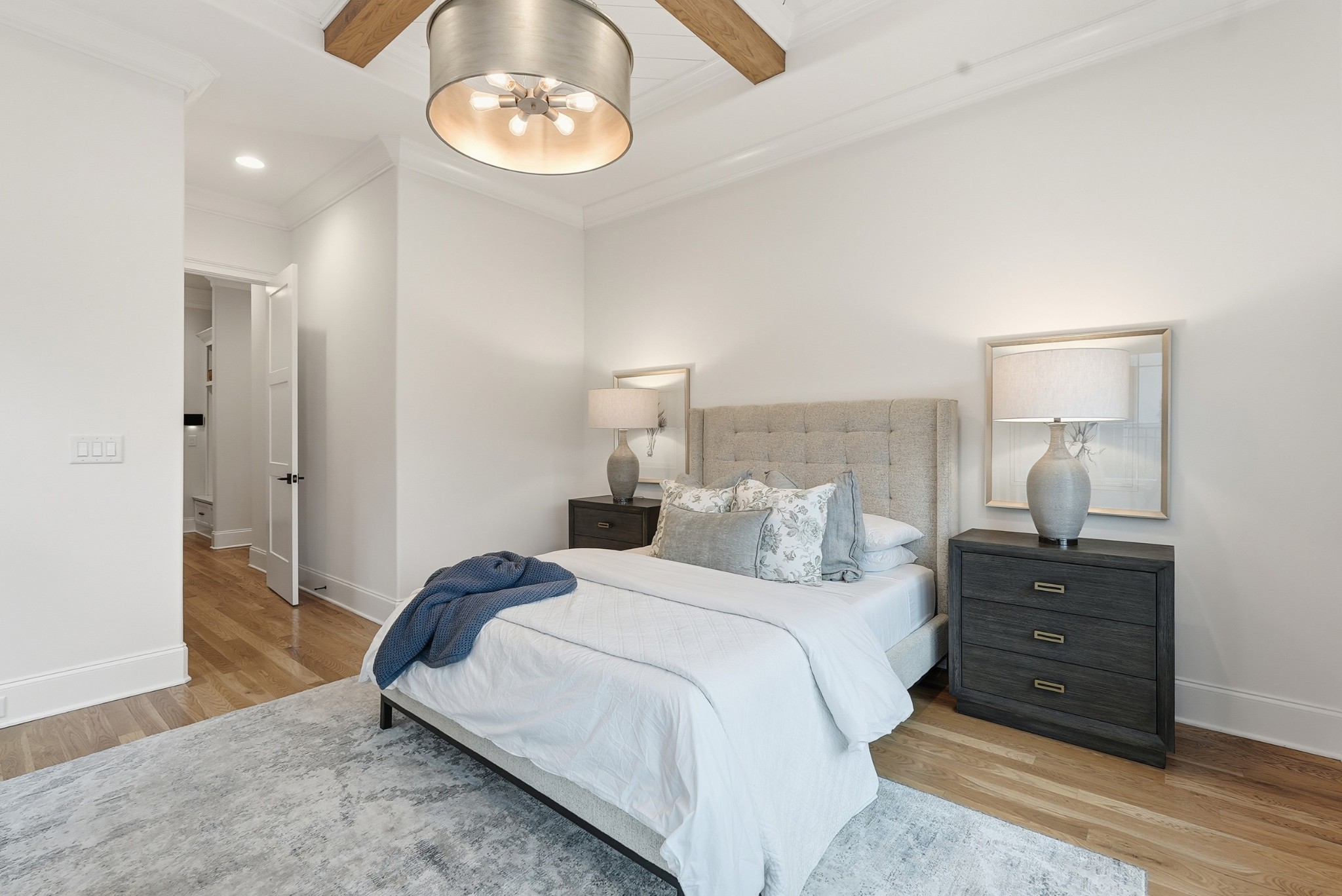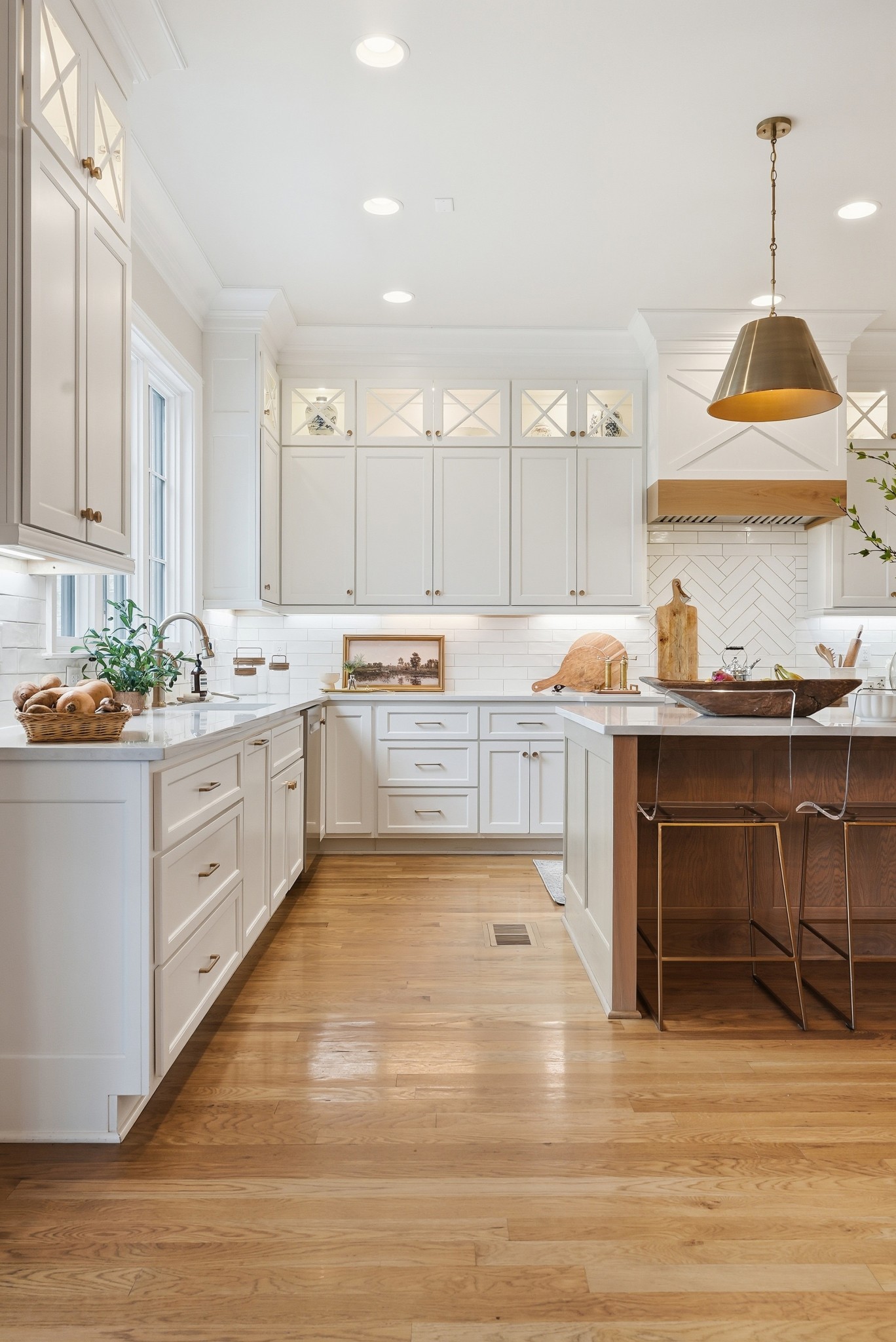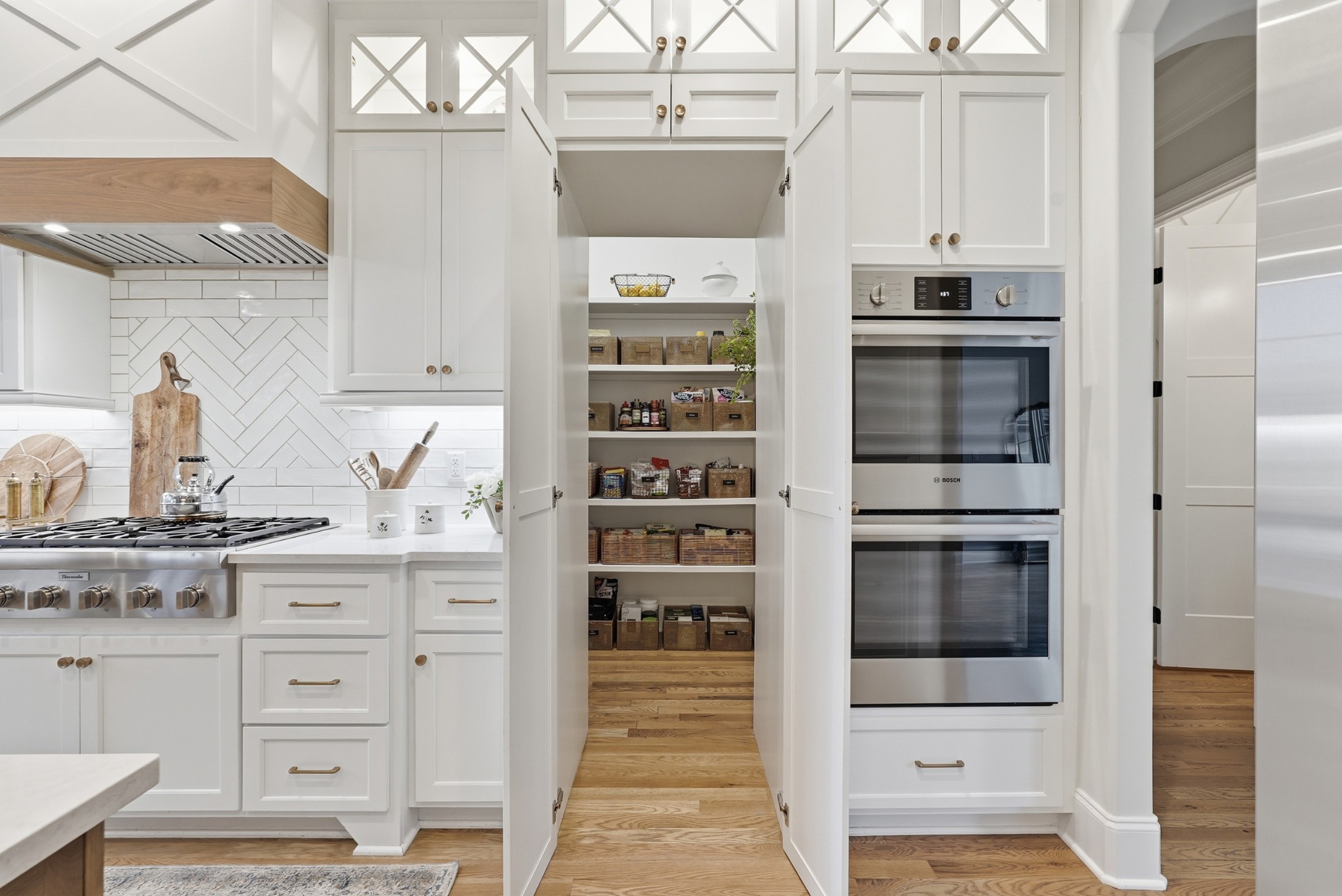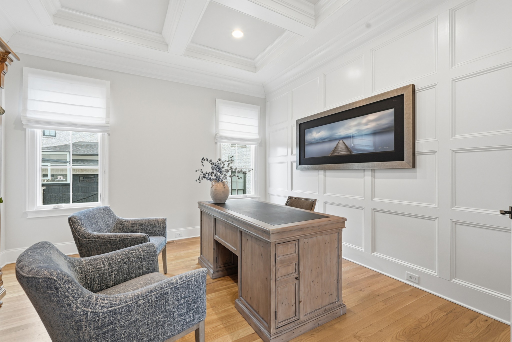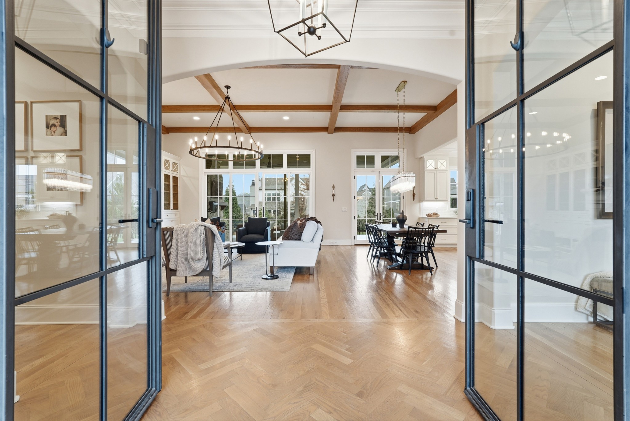 The main level features high ceilings, abundant natural light, and hardwood floors throughout. The living room is anchored by a wood-burning fireplace with custom built-ins and exposed beam ceilings, creating a warm and inviting gathering space that flows seamlessly into the dining area and kitchen. The kitchen is beautifully appointed with generous counter space, custom cabinetry, double ovens, a hidden walk-in pantry, and a dedicated coffee bar. The primary suite on the main level offers a peaceful retreat with vaulted ceilings, a spa-inspired bath with a soaking tub, separate vanities, and two walk-in closets. A private office and a guest suite on the main level provide flexibility for work-from-home living or hosting guests.