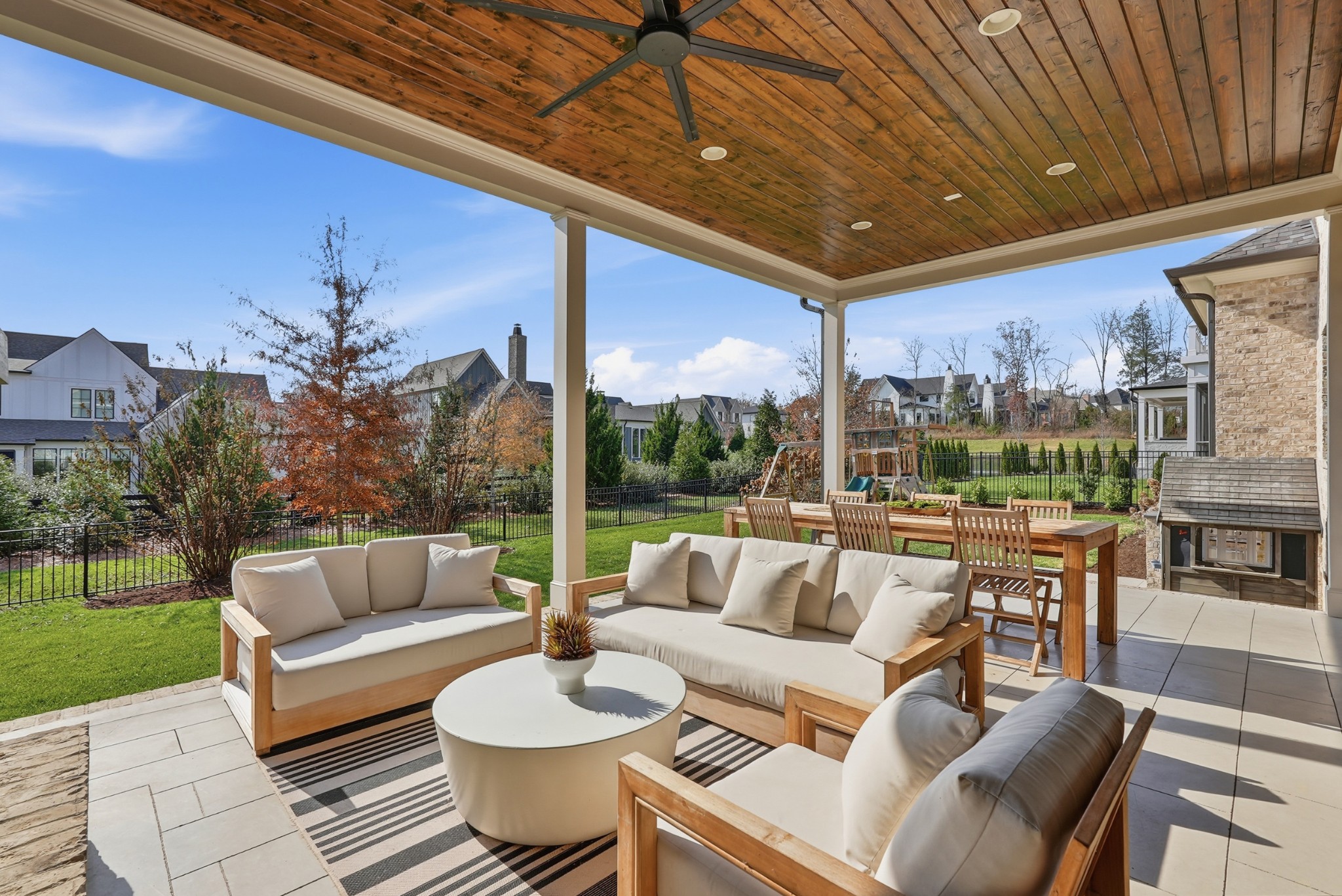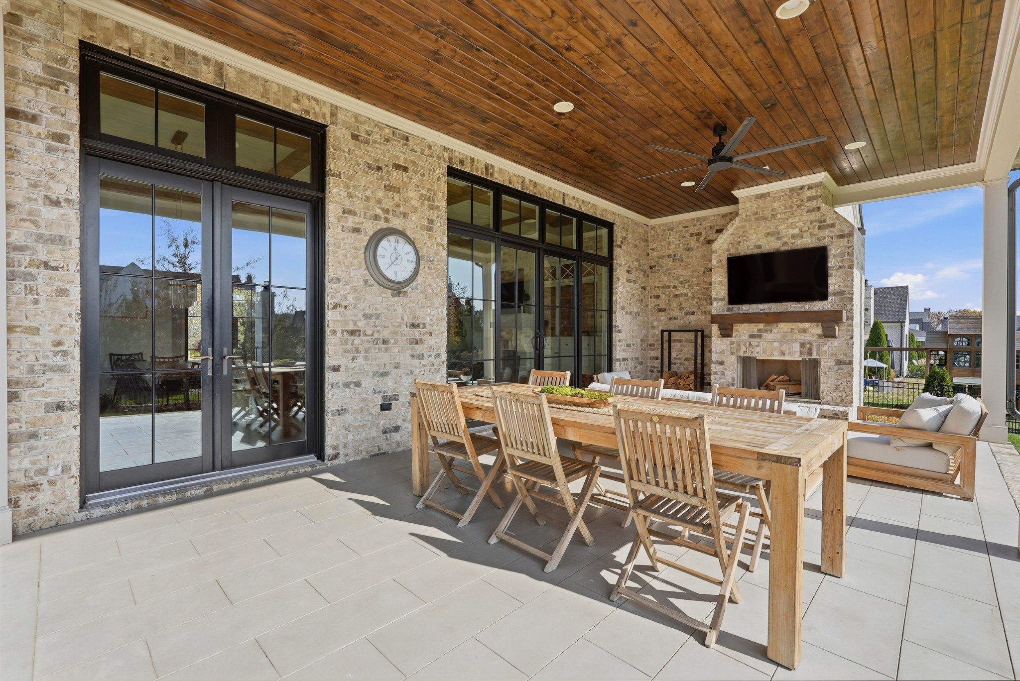 The second level features three ensuite bedrooms and a spacious bonus room, offering comfortable accommodations and flexible living space, along with a study nook and generous unfinished storage. Outdoor living is highlighted by a covered back porch with a brick, wood-burning fireplace and wood-plank ceiling, overlooking the flat, fenced backyard, ideal for entertaining or quiet evenings at home.