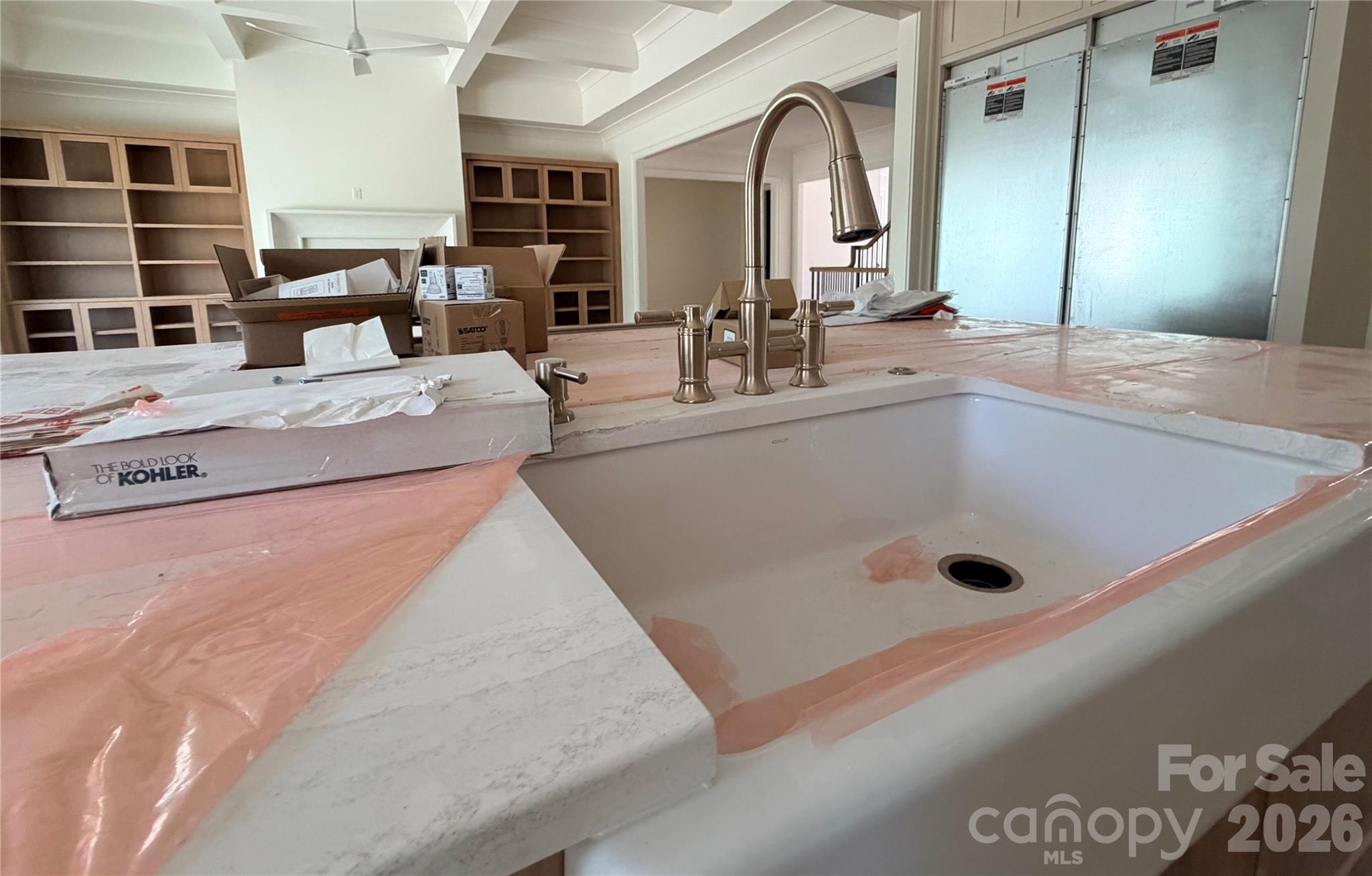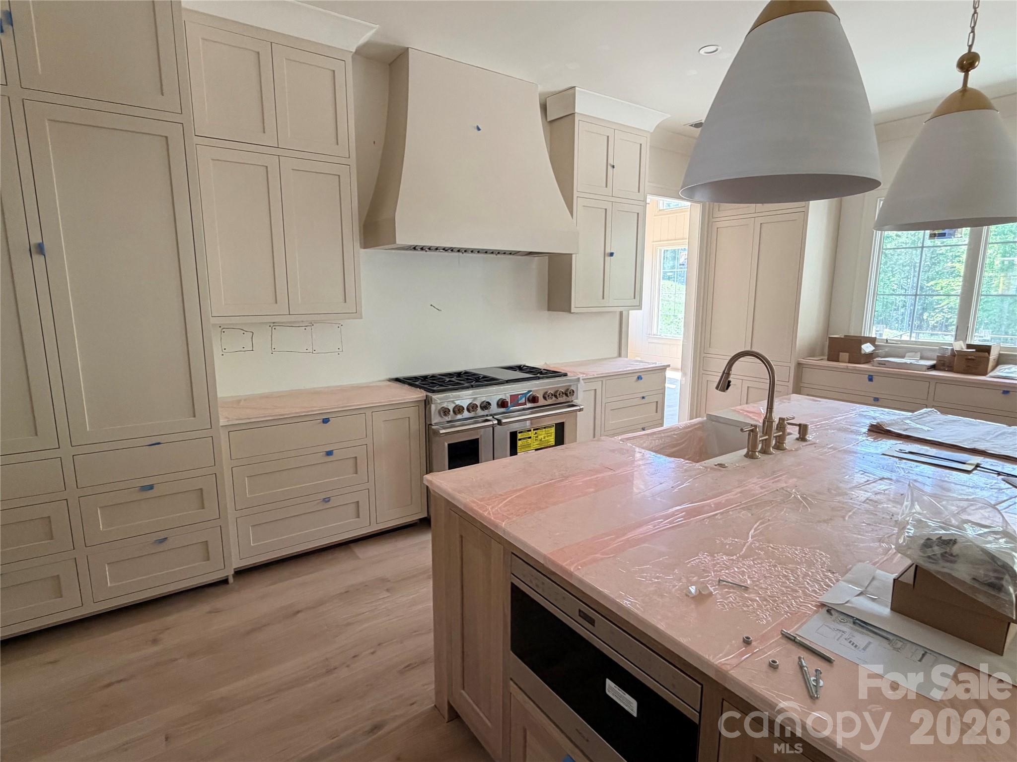This spectacular home in the heart of Davidson showcases size, quality and luxury, with over 6,150 sq ft with all the custom features you could imagine. An impressive elevation with a focus on the front entry. A custom 9' door system (with a 60" pivot style door) invites you in to an open floor plan. As you step into the great room with 12 ft coffered ceilings, the home’s custom details are immediately apparent. Your eye will be drawn to a fireplace ready for wood burning or gas logs. The Chef's Kitchen features Sub-Zero Fridge and Freezer columns totaling an impressive 5 ft in width; an expansive island; custom inset cabinets and a 48” Wolf range. Walking through the kitchen, you'll find an expansive larder/pantry designed to showcase a custom finish while meeting functionality. Outside of this one-of-a-kind pantry, the vaulted ceiling of the dining room (with four handsome beams) will have you envisioning future gatherings. Open the expansive sliding doors and walk out to the massive screened porch (with wood-burning or gas fireplace).