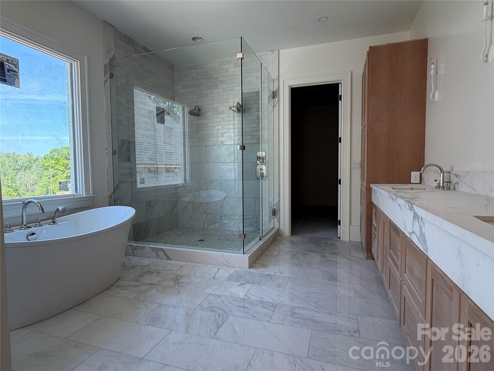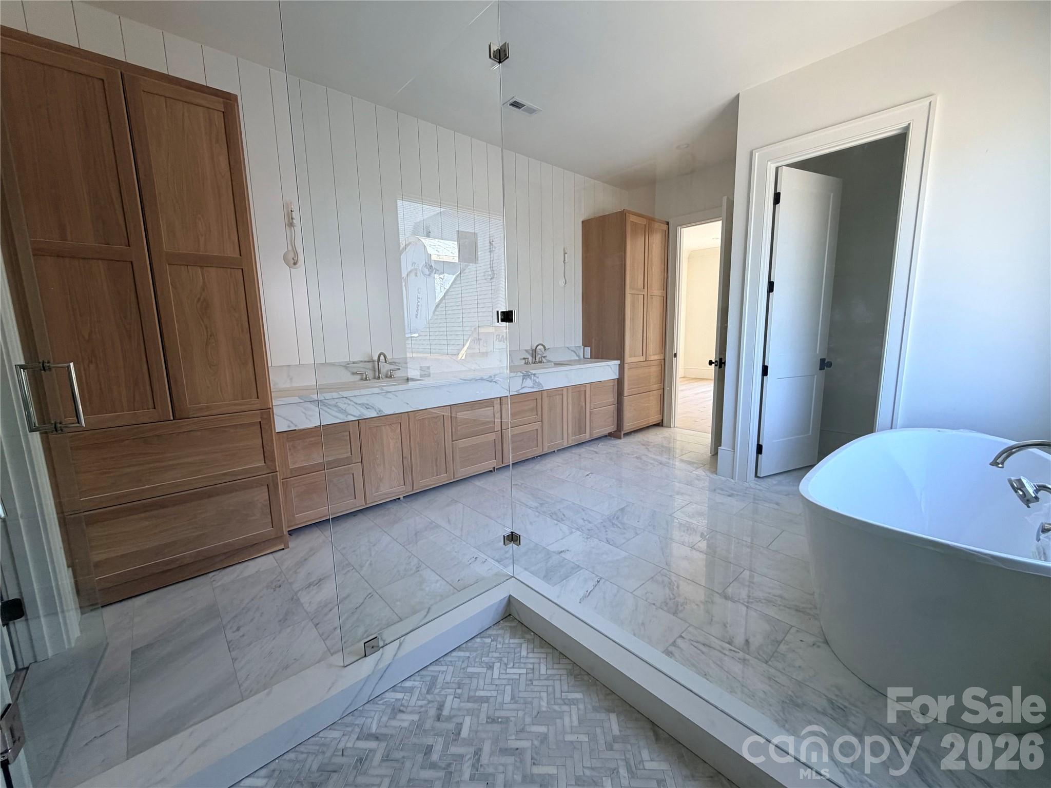 5 Bedrooms and 5.5 Bathrooms. The primary bedroom is on the main level, with a spacious bathroom including a huge shower, freestanding tub and 17 feet of custom cabinetry along separate vanity spaces. The closet is oversized and plumbed/wired for stackable washer/dryer appliances.