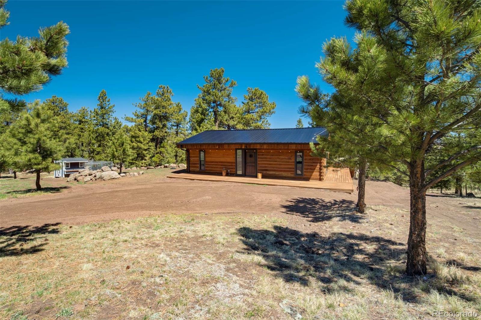 Welcome to Guffey, where our mountain properties are as unique and lovely as our folks! This private 10.8-acre escape showcases gently rolling terrain with mature pine stands, grassy meadow, RV parking, and a turn-around driveway for easy access. The property includes a 730 ft² 1.5-story primary residence and a fully furnished 882 ft² guest quarters, each equipped with dual Pioneer Mini Split systems for year-round comfort. The main home features an open loft bedroom, soaring wood-framed windows, Austrian oak floors, a propane stove, and over 790 ft² of new decking for relaxing or entertaining. The kitchen offers a high-performance stainless gas range, leathered granite counters, granite sink with sensor faucet, and a pantry/laundry room with cabinetry. The guest quarters boast vaulted ceilings, exposed beams, custom acacia floors, a wood stove, and a wraparound deck with unobstructed views. Its kitchen includes granite counters, maple cabinets, a ZLINE gas range with electric oven, and an island with storage and bar seating. The private bedroom is paired with a stackable laundry area, while the ensuite bathroom offers a soaking tub and sleek finishes. Elsewhere on the property is an insulated, productive chicken coop with enclosed yard and an oversized 30 x 40 heated garage featuring concrete aprons and covered side entrances. Ideal for work or leisure, the garage includes 220V power for tools or EV charging, a mezzanine with built-in workbenches, and an office with cabinets and separate exterior access. Tucked just off paved CR-102 near Hwy 9 and an hour west of Colorado Springs, this peaceful location offers year-round access to Divide, Woodland Park, Florissant, and Cripple Creek for dining, shopping, and entertainment. With Mueller State Park, Pike National Forest, the South Platte River, and Eleven Mile Reservoir nearby, you’ll find world-class hunting, hiking, rafting, fishing, and more at your fingertips! Additional photos, 3D tours, and documents available.