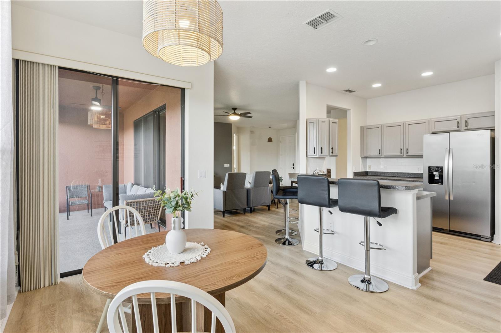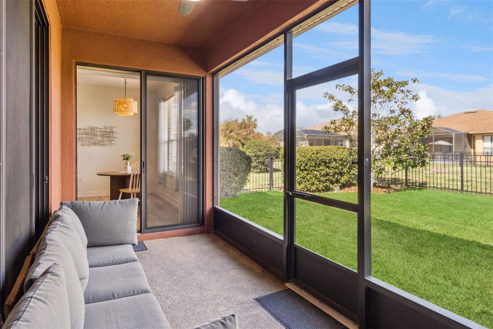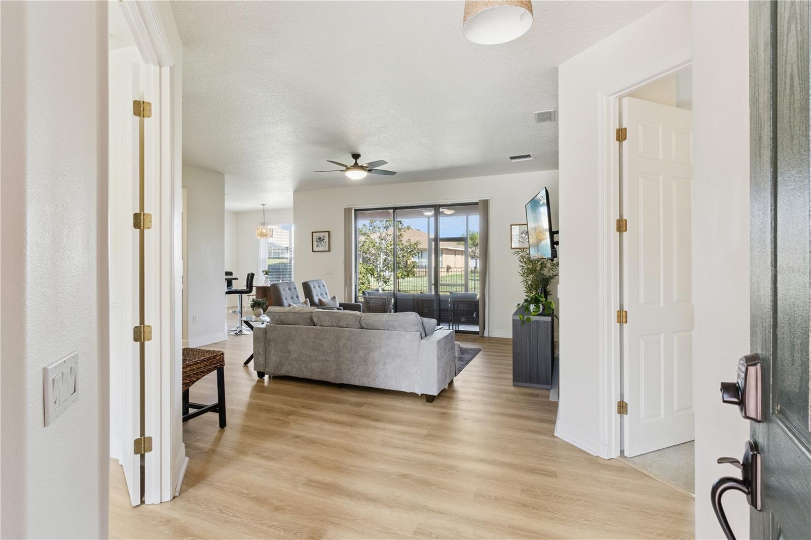 Welcome to the stunning, master-planned 55+ community of Solivita—where resort-style living meets the comfort of home. This impeccably maintained, furnished 2-bedroom, 2-bath residence with a versatile den offers 1,548 square feet of thoughtfully designed living space, perfect for both full-time residence or a seasonal retreat. From the moment you enter, you'll be greeted by the home’s warm ambiance and tasteful finishes, creating an atmosphere of casual elegance. The open-concept floor plan flows seamlessly, offering a harmonious blend of functionality and style. At the heart of the home is a spacious great room that effortlessly connects to the dining area and a well-appointed kitchen—ideal for both quiet evenings and lively gatherings. The kitchen features modern stainless steel appliances, abundant cabinetry, and a convenient breakfast bar, combining style and practicality for everyday living and entertaining. The private primary suite is a serene retreat tucked away from the main living areas. It offers a generous walk-in closet and a beautifully designed en-suite bath with a spacious step-in shower. A second bedroom is perfectly situated for guests, with easy access to a full bath. The flexible den provides endless possibilities—ideal as a reading nook, home office, or creative studio. Additional features include a full laundry room and an attached garage, enhancing everyday convenience. Step outside to enjoy your screened-in, covered porch—perfect for morning coffee, outdoor dining, or peaceful evenings. The beautifully landscaped and fenced backyard offers both privacy and charm, extending your living space outdoors. This low-maintenance home allows you to spend more time enjoying everything Solivita has to offer. Set within 4,300 acres of lush, landscaped grounds, Solivita is one of Central Florida’s premier gated communities for active adults. A 24-hour manned entrance offers controlled access for added privacy, while an expansive collection of amenities caters to every interest. Residents enjoy indoor and outdoor heated pools, state-of-the-art fitness centers, and walking and biking trails. Golf enthusiasts will love the award-winning Stonegate Golf Club, which features two championship 18-hole courses. Sports lovers can also take advantage of tennis courts, pickleball, bocce ball, shuffleboard, and softball fields. Beyond recreation, Solivita is a vibrant social hub, offering over 200 clubs and interest groups ranging from art and photography to gardening and dance. On-site restaurants, a neighborhood marketplace, and regular farmers markets keep daily conveniences within easy reach, while concerts, seasonal festivals, and community events foster lasting friendships and connections. Ideally located just a short drive from Orlando’s world-class attractions, dining, and medical facilities, this home offers a rare blend of comfort, charm, and resort-style living—all within the gates of Solivita. This is more than just a home. It’s a lifestyle.