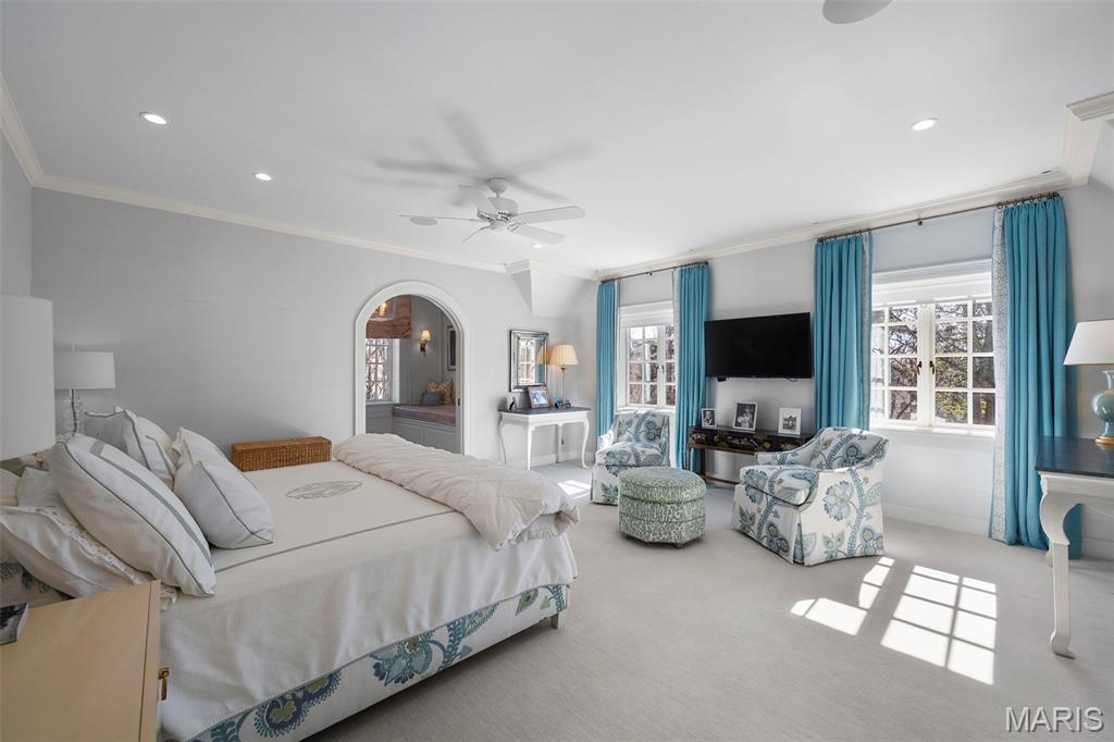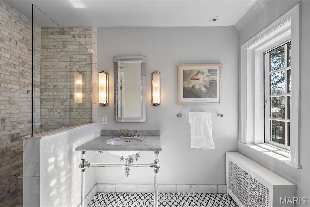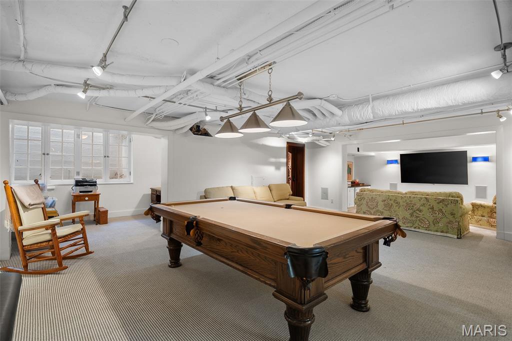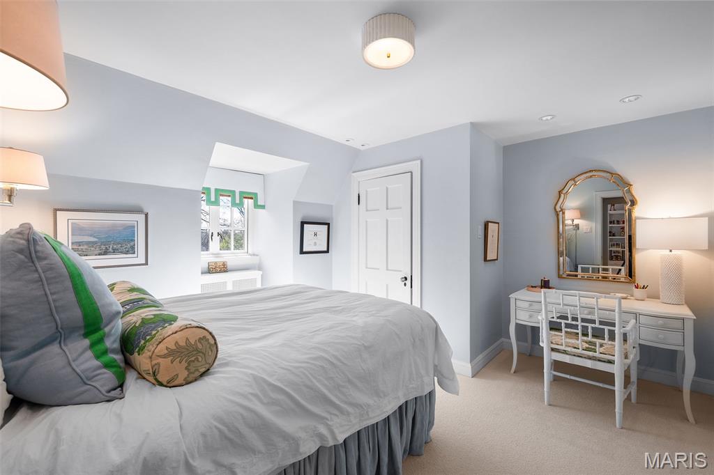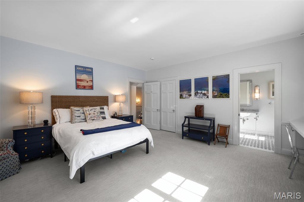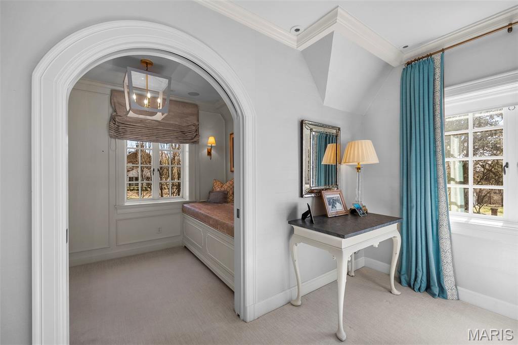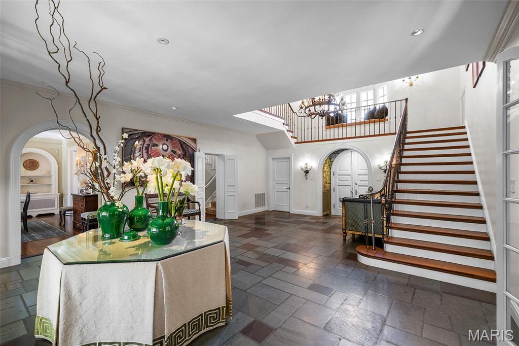 Set along one of Ladue’s most exclusive and private lanes, this truly unique estate is a rare architectural offering, evoking the charm of the English countryside. A discreet circular drive creates a gracious arrival, highlighting the inviting facade of whitewashed brick, classic tile roof, and timeless detailing—an elegant expression of the enduring design of one of St. Louis’s preeminent early 20th century architects, and an introduction that immediately sets this home apart. Inside, a dramatic two-story entry with slate floors sets the tone for interiors that balance grand scale with warmth and livability. The expansive paneled living room is perfectly suited for both everyday enjoyment and memorable holiday gatherings. A light-filled sunroom opens seamlessly to the extraordinary grounds beyond, where an expansive, flat lot is framed by mature trees and complete privacy, anchored by a bluestone patio, serene saltwater pool, and dedicated pool bath—an ideal setting for outdoor entertaining or quiet retreat. The dining room stuns with fresh lacquered walls and a striking marble mantel, flowing effortlessly into the chef’s kitchen with marble countertops, custom cabinetry, and an inviting eat-in space. A well appointed bar connects to the vaulted family room, where a cozy fireplace creates the perfect gathering place. The main house offers six bedrooms, including a luxurious primary suite with a spa-like bath featuring heated floors, steam shower, double vanities, and an expansive walk-in closet. Two oversized ensuite bedrooms occupy the second floor, while the third floor includes three additional bedrooms sharing a beautiful hall bath. The lower level is designed for both leisure and wellness, complete with a temperature-controlled wine room, recreation space, exercise area, sauna, and steam room. A heated four-car garage is topped by a spacious apartment offering flexible living space, bedroom, full bath, and kitchenette—ideal for guests, extended family, or private work-from-home needs. Geothermal heating and cooling add efficiency to this remarkable estate. Properties of this caliber are seldom available, and this residence has not been offered to the public market in many years, having changed hands quietly—making this opportunity all the more special. Rich in character, rare in availability, and endlessly inviting, this is a truly special residence that feels both storied and timeless.