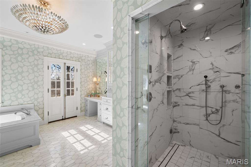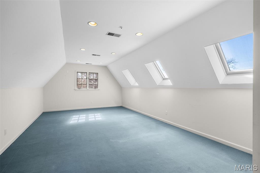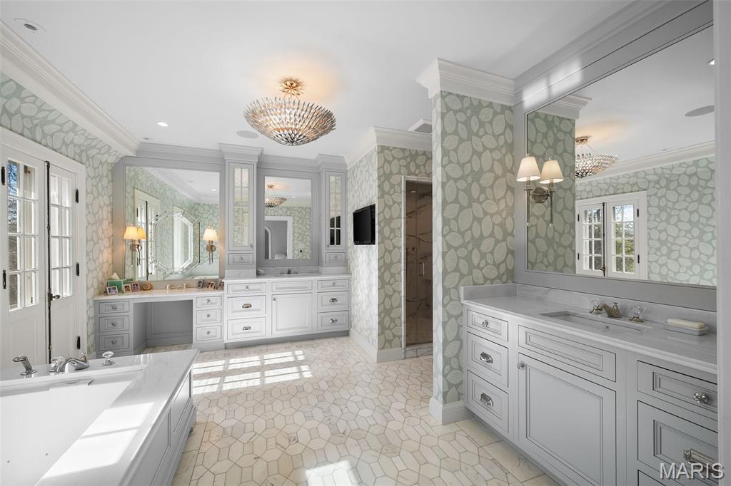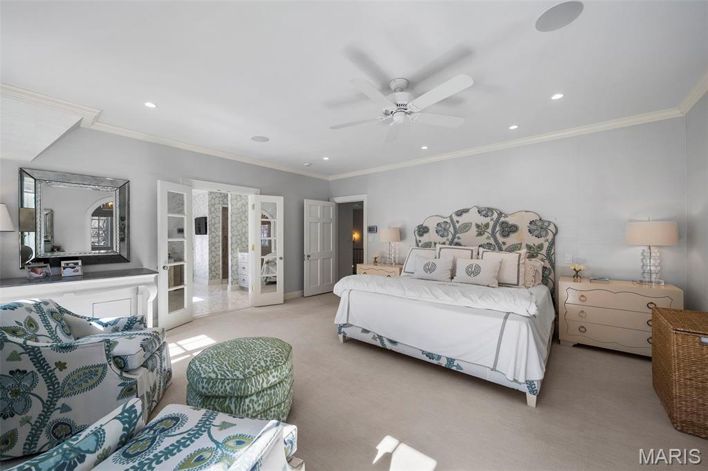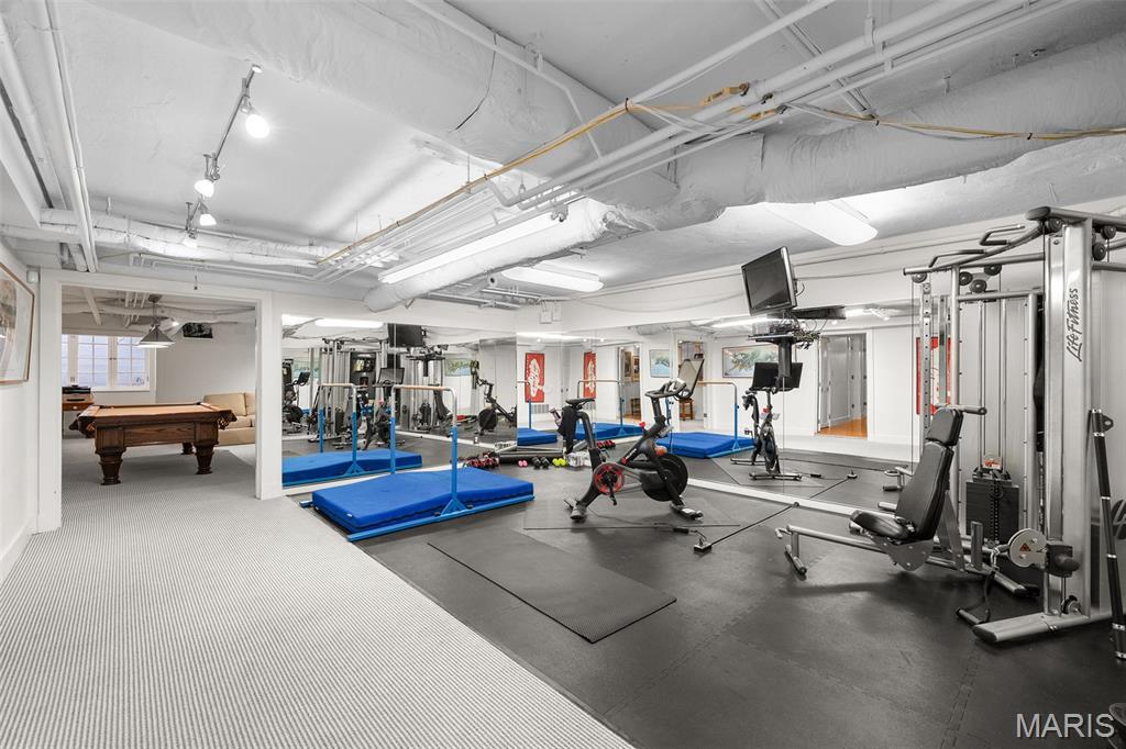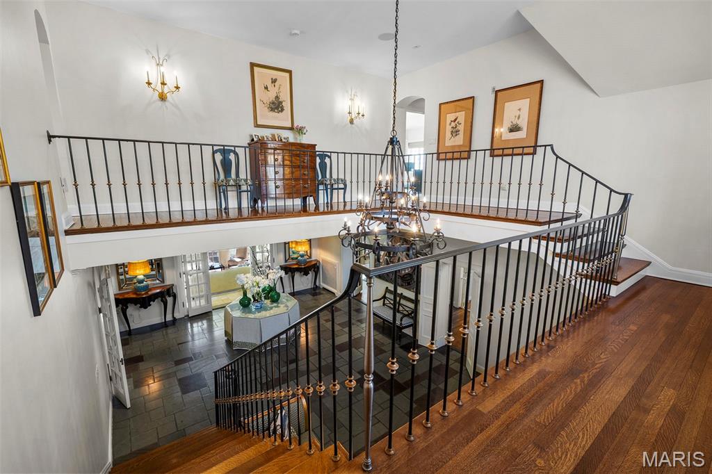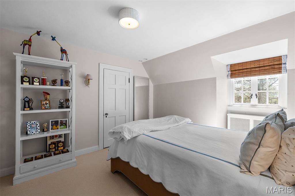 Set along one of Ladue’s most exclusive and private lanes, this truly unique estate is a rare architectural offering, evoking the charm of the English countryside. A discreet circular drive creates a gracious arrival, highlighting the inviting facade of whitewashed brick, classic tile roof, and timeless detailing—an elegant expression of the enduring design of one of St. Louis’s preeminent early 20th century architects, and an introduction that immediately sets this home apart. Inside, a dramatic two-story entry with slate floors sets the tone for interiors that balance grand scale with warmth and livability. The expansive paneled living room is perfectly suited for both everyday enjoyment and memorable holiday gatherings. A light-filled sunroom opens seamlessly to the extraordinary grounds beyond, where an expansive, flat lot is framed by mature trees and complete privacy, anchored by a bluestone patio, serene saltwater pool, and dedicated pool bath—an ideal setting for outdoor entertaining or quiet retreat. The dining room stuns with fresh lacquered walls and a striking marble mantel, flowing effortlessly into the chef’s kitchen with marble countertops, custom cabinetry, and an inviting eat-in space. A well appointed bar connects to the vaulted family room, where a cozy fireplace creates the perfect gathering place. The main house offers six bedrooms, including a luxurious primary suite with a spa-like bath featuring heated floors, steam shower, double vanities, and an expansive walk-in closet. Two oversized ensuite bedrooms occupy the second floor, while the third floor includes three additional bedrooms sharing a beautiful hall bath. The lower level is designed for both leisure and wellness, complete with a temperature-controlled wine room, recreation space, exercise area, sauna, and steam room. A heated four-car garage is topped by a spacious apartment offering flexible living space, bedroom, full bath, and kitchenette—ideal for guests, extended family, or private work-from-home needs. Geothermal heating and cooling add efficiency to this remarkable estate. Properties of this caliber are seldom available, and this residence has not been offered to the public market in many years, having changed hands quietly—making this opportunity all the more special. Rich in character, rare in availability, and endlessly inviting, this is a truly special residence that feels both storied and timeless.