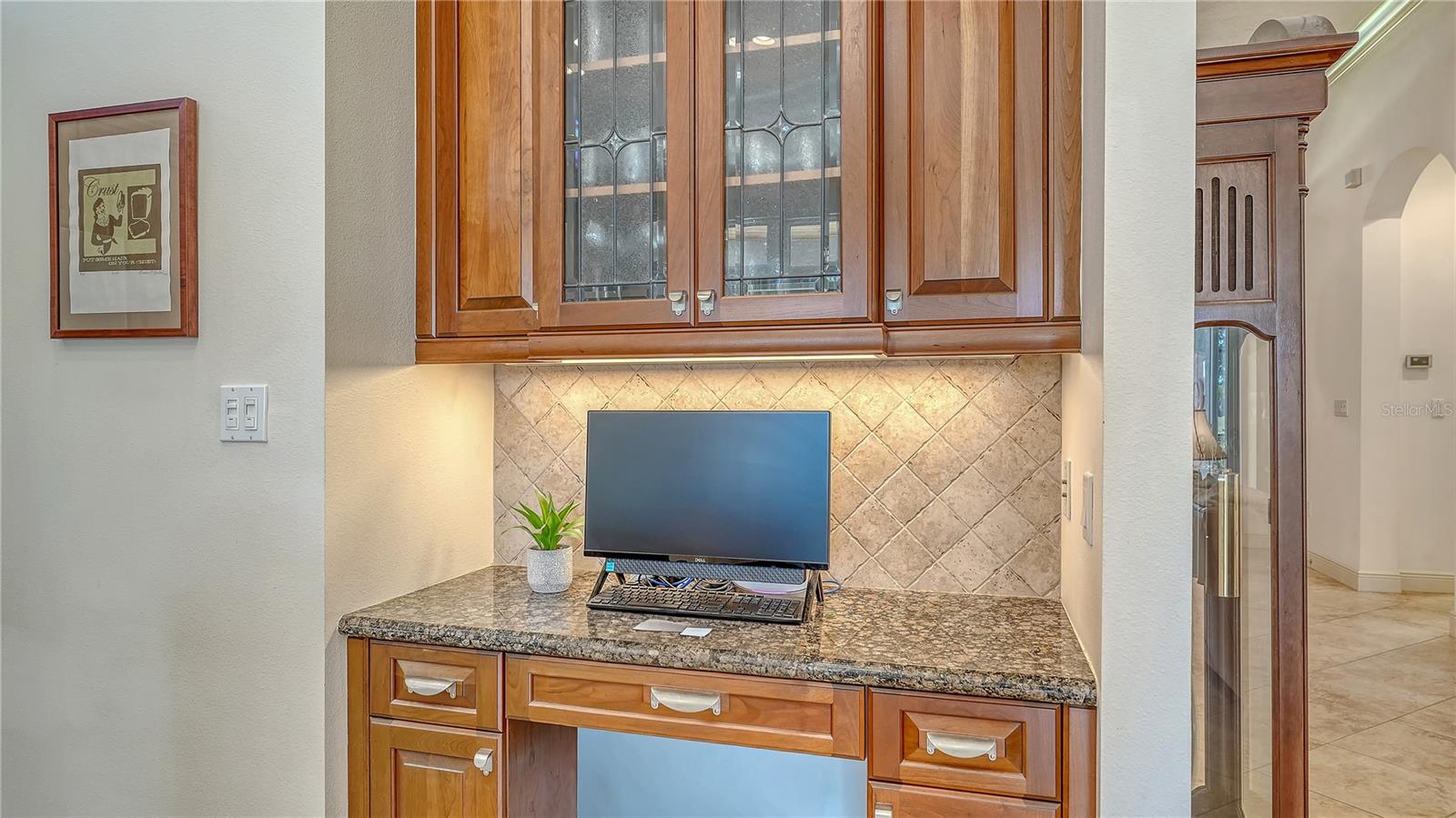 Inside, new impact-rated front entry doors welcome you into a spacious foyer and open-concept floor plan. The elegant dining room offers plantation shutters, designer lighting, and a convenient pass-through to the gourmet kitchen. The heart of the home features granite countertops, rolls outs in lower cabinets, stainless steel appliances with natural gas, breakfast bar, built-in desk area, and a sunny dinette that flows seamlessly into the great room—ideal for entertaining or unwinding.