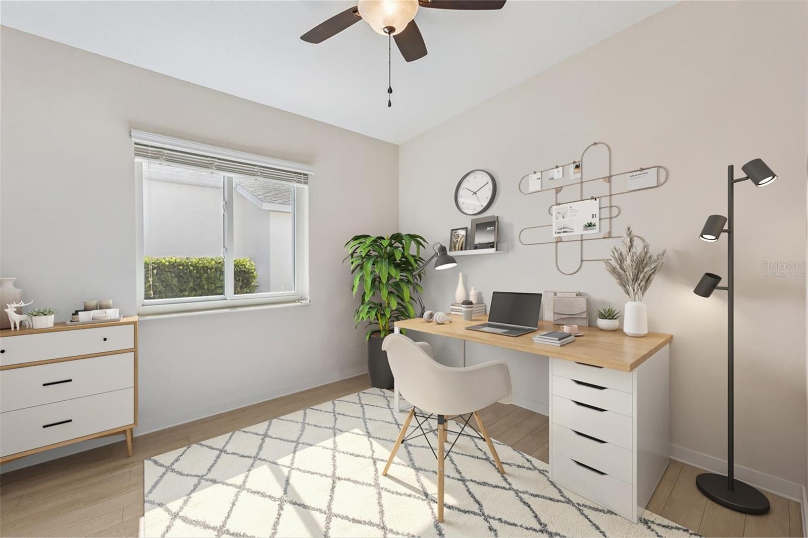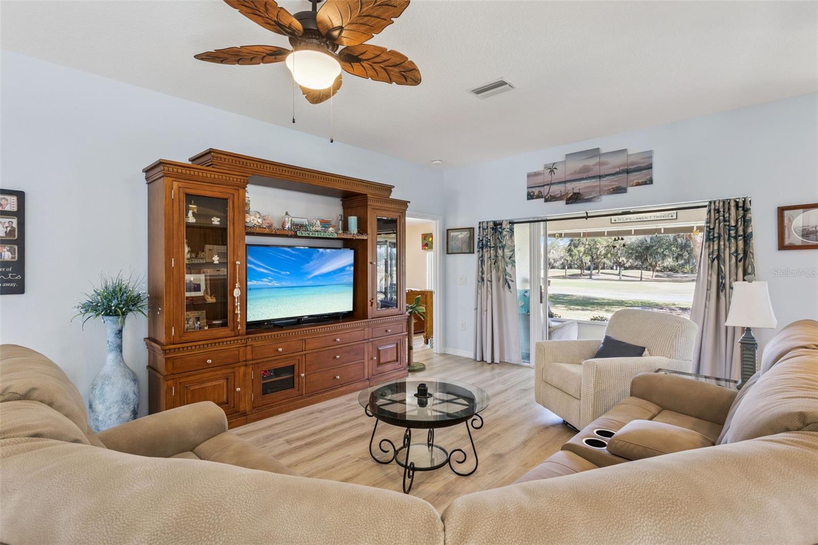 One or more photo(s) has been virtually staged. Welcome to this beautifully maintained Dogwood Builder Model, ideally situated on the golf course in one of Central Florida’s most sought-after 55+ communities! This spacious three-bedroom, two-bathroom home offers a split floor plan and is surrounded by lush, manicured landscaping. Enjoy Anderson Replacement Windows throughout, fresh interior paint, and sliders that open to a bright Florida Room—perfect for unwinding or entertaining. The versatile third bedroom is currently used as a crafting room, adding flexibility to your living space.