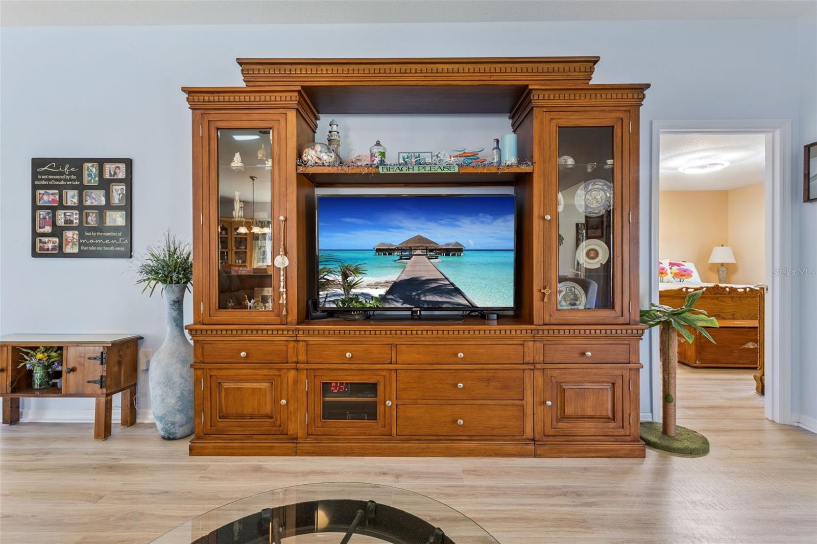 The heart of the home is the chef's kitchen, featuring white appliances, a pantry, Corian countertops, wood cabinets with convenient pull-outs, and a charming dinette nook that overlooks the picturesque surroundings. For dining, you’ll love having both casual and formal eating areas to suit any occasion. Laminate flooring flows seamlessly throughout the residence, combining easy maintenance with elegant style. Additional highlights include a garage with a utility sink, new smart door opener, pull-down attic stairs for extra storage, and a sliding screen garage door. The guest suite features a tub/shower combination, while the primary suite boasts a spacious walk-in closet, dual vanities, a private commode, and a tiled shower for a true retreat experience. There is no bond on this home! Enjoy resort-style amenities right outside your door—this vibrant community offers a movie theater, Grand Hall, full-service restaurant and pub, zero-entry pool, hot tub, state-of-the-art fitness center, and sidewalk-lined streets perfect for evening strolls. Conveniently located near Village Squares, MCO, Disney, world-class medical facilities, and shopping. Experience the best of Central Florida retirement living in this exceptional home. Schedule your private tour today and see all the wonderful features for yourself!