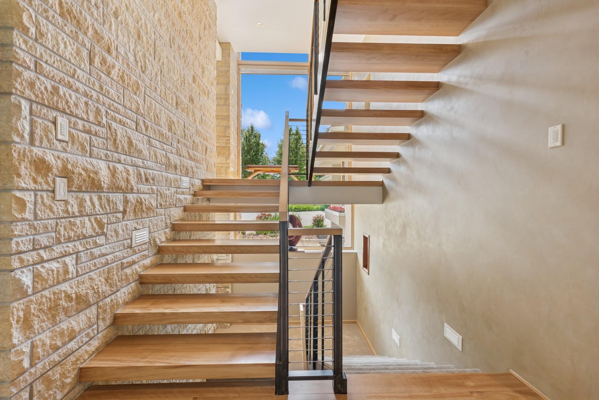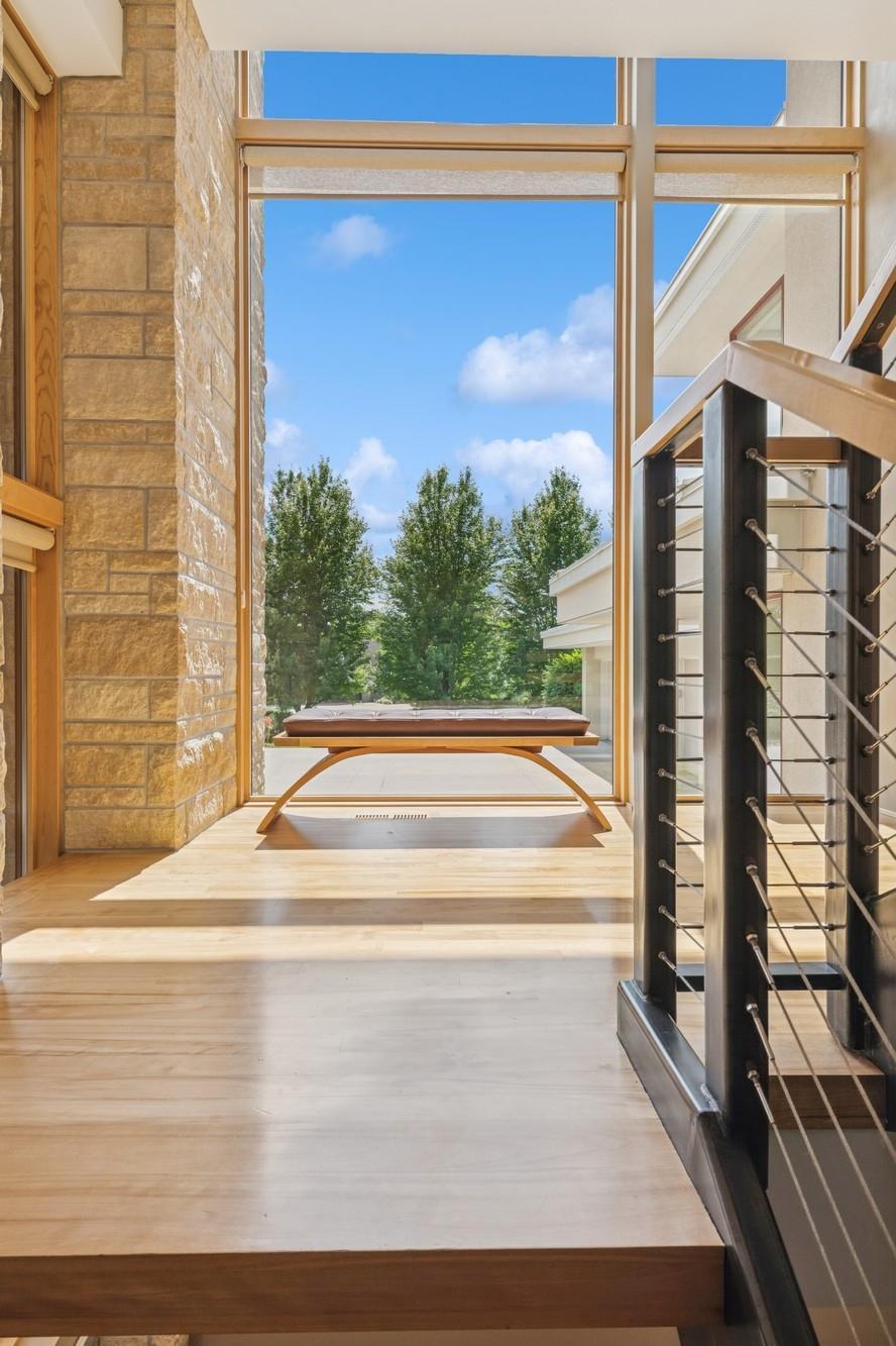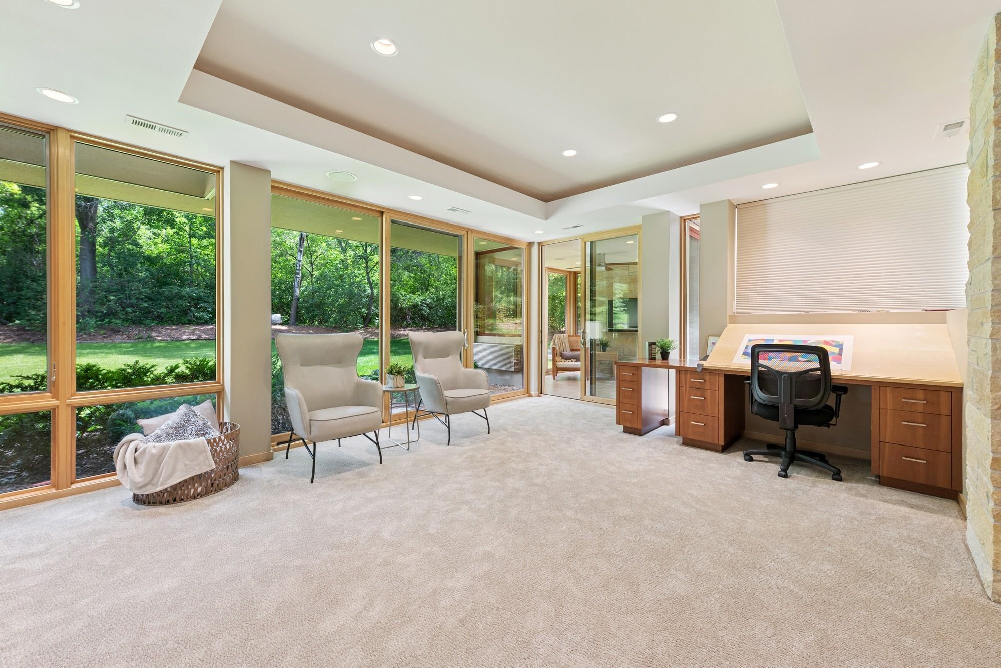 Artful Architecture that truly embraces the ample green spaces of this acreage setting. These are distinguishing aspects of this crowning achievement by an award winning Architect of international acclaim, Charles Stinson & carefully constructed by Streeter. Privacy without isolation as thoughtful placement of windows & landscape designed to assure great sightlines! Reward yourself with dual baths in a main floor owner's suite! Truly spa-inspired, both owner's baths offer remarkable & distinctly individual features. Technical brilliance by Lutron Lighting systems in multiple areas give you the ideal controls for a variety of lighting options. The clerestory great room is absolutely awe-inspiring, a daily delight for you & so impressive for guests, even Realtors have said "Wow!" here. Plus, a wealth of natural light is here, even in the lower level with multiple walk-outs. An Oscar worthy home theater is here with raked audience seating that grants 18 people a spectacular view of both screen & stage. 12 speaker surround sound with THX-certified amplifier. Acoustics in this home cinema were professionally designed for great sound throughout the theater. Ideal cinematic experiences start here & they start whenever you wish! You set the rules on phones in this cinema. Backstage, a huge finished space gives you a prep area to stage live events. Do you want an elevator? Yes, there's a space for that too, currently functioning as triple stacked walk-in closets just off hallways. In addition to a game room, another space accommodates a pool table & this flows gracefully to a family room with fireplace. Education pursuits have their place in the upstairs study, so your main floor office is just for you. Plus, there is another large room with cabinets & a walk-in closet that is currently seen as an art studio, that could become your 2nd office, a music room & more. The 4 season porch, just off the studio has independent A/C & heating, with sliding patio glass doors on 3 sides. Enjoy the great