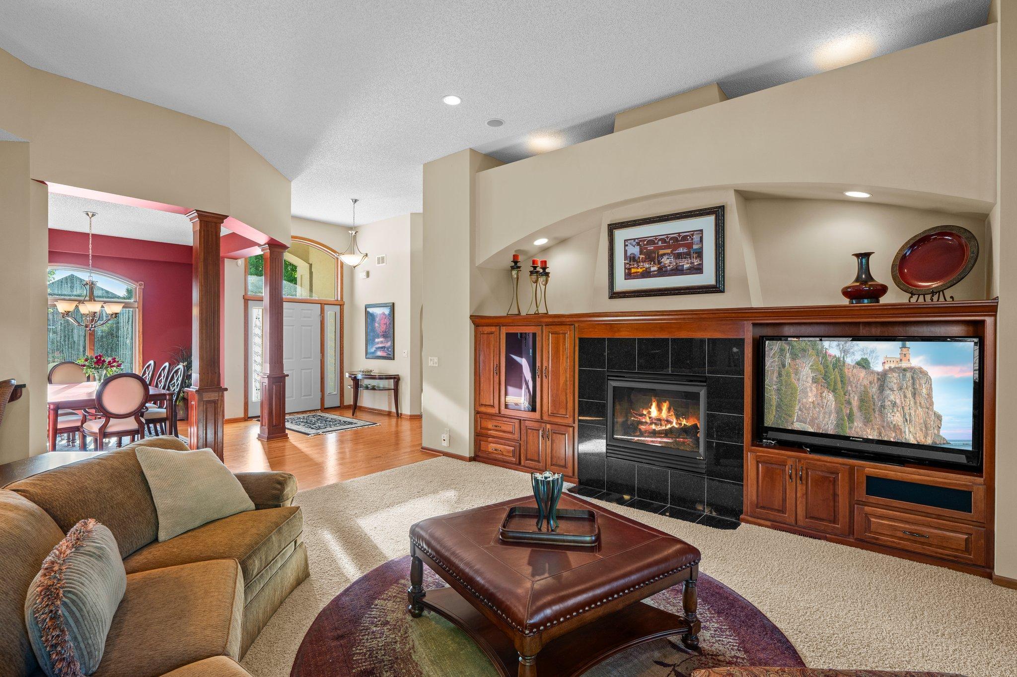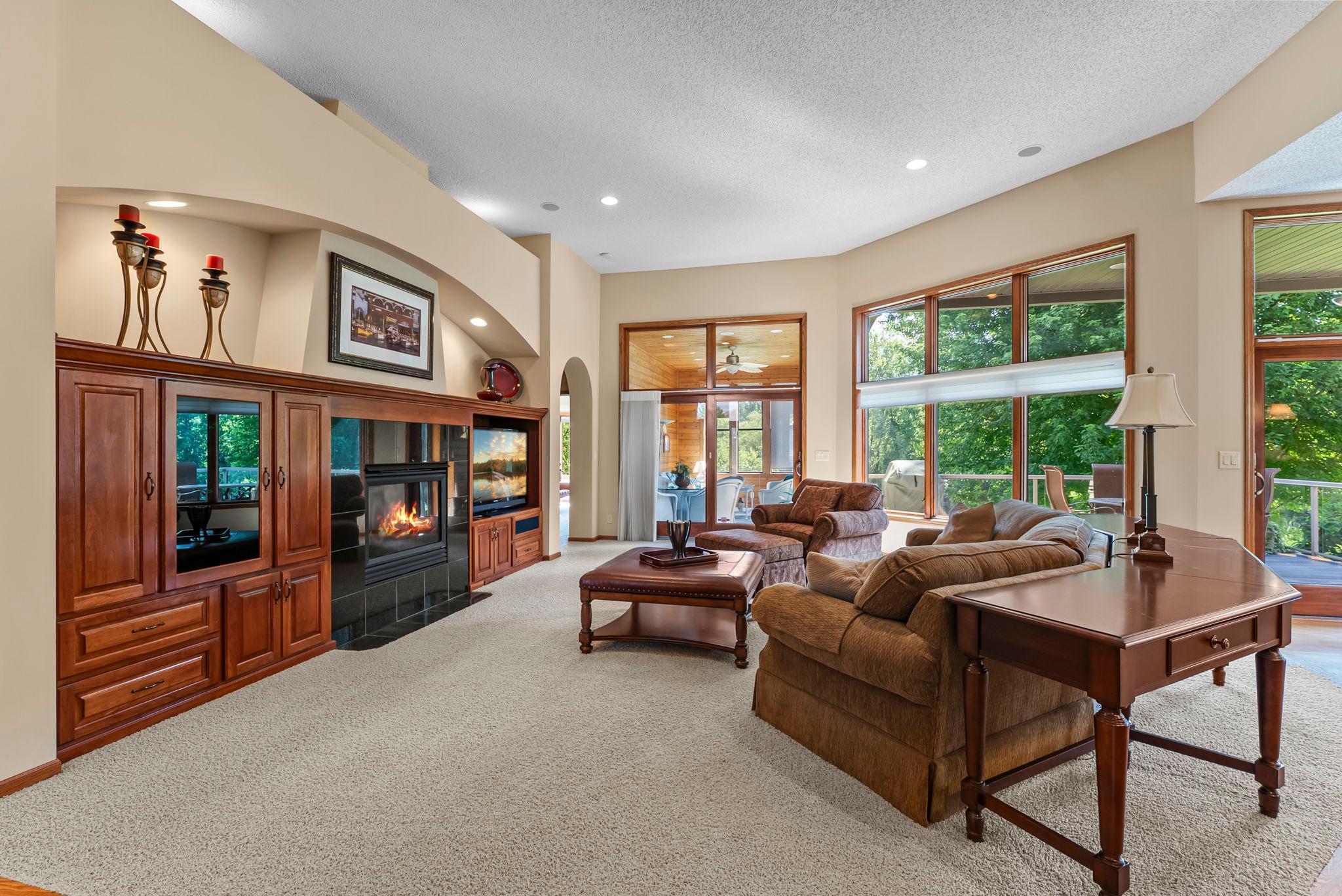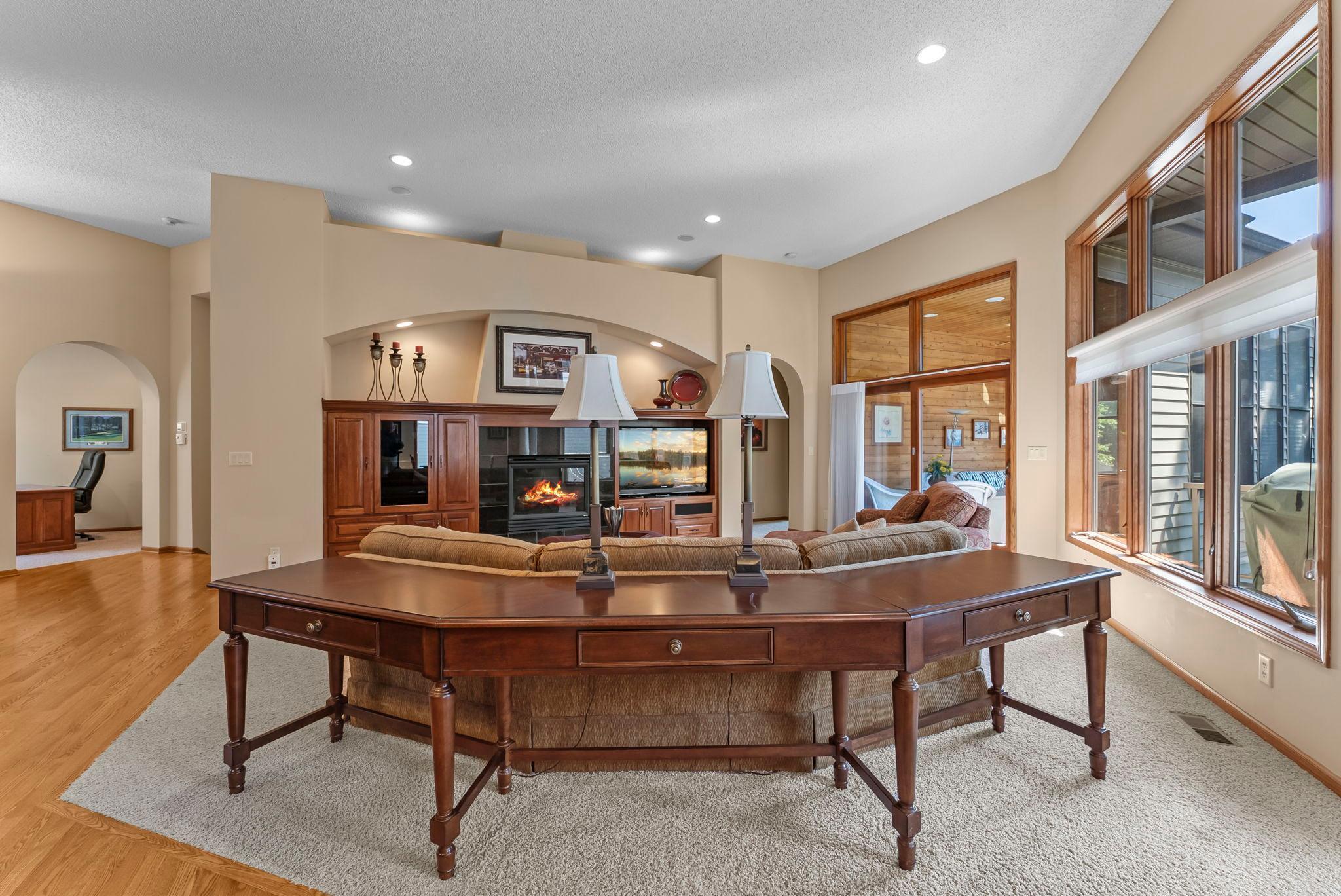 Step inside and you’re greeted by warm hardwood floors, high-quality finishes, and an open layout designed for easy everyday living. The main level features a spacious living room anchored by custom cherry built-ins, large Andersen windows that frame serene views of Sunrise Lake, and an inviting atmosphere that flows beautifully from room to room. A dedicated main-level office provides the perfect workspace for remote days or creative pursuits, positioned to offer both functionality and privacy.
