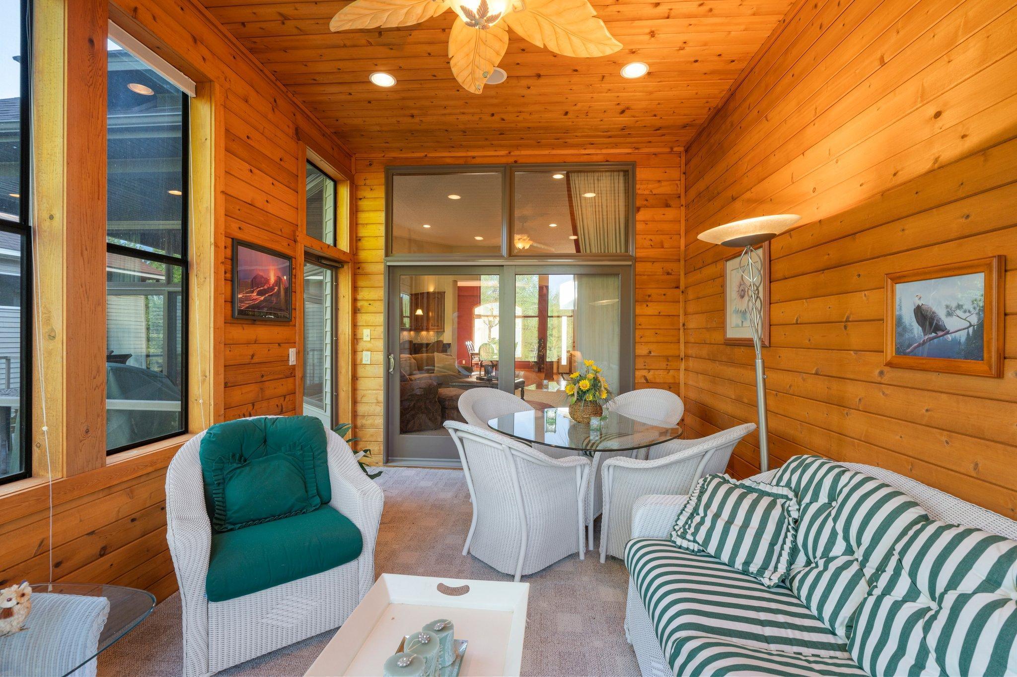 The kitchen is a standout with its granite counters, abundant cabinetry, stainless appliances, and a layout ideal for both cooking and gathering. Whether you’re hosting friends or enjoying a quiet morning coffee, the connected dining area and cozy 3-season room give you multiple ways to savor the lake views and changing seasons. The maintenance-free covered deck—accessible right off the sunroom—creates an effortless indoor-outdoor living experience and is perfect for grilling, relaxing, or simply unwinding while overlooking the tranquil bay of Sunrise Lake.