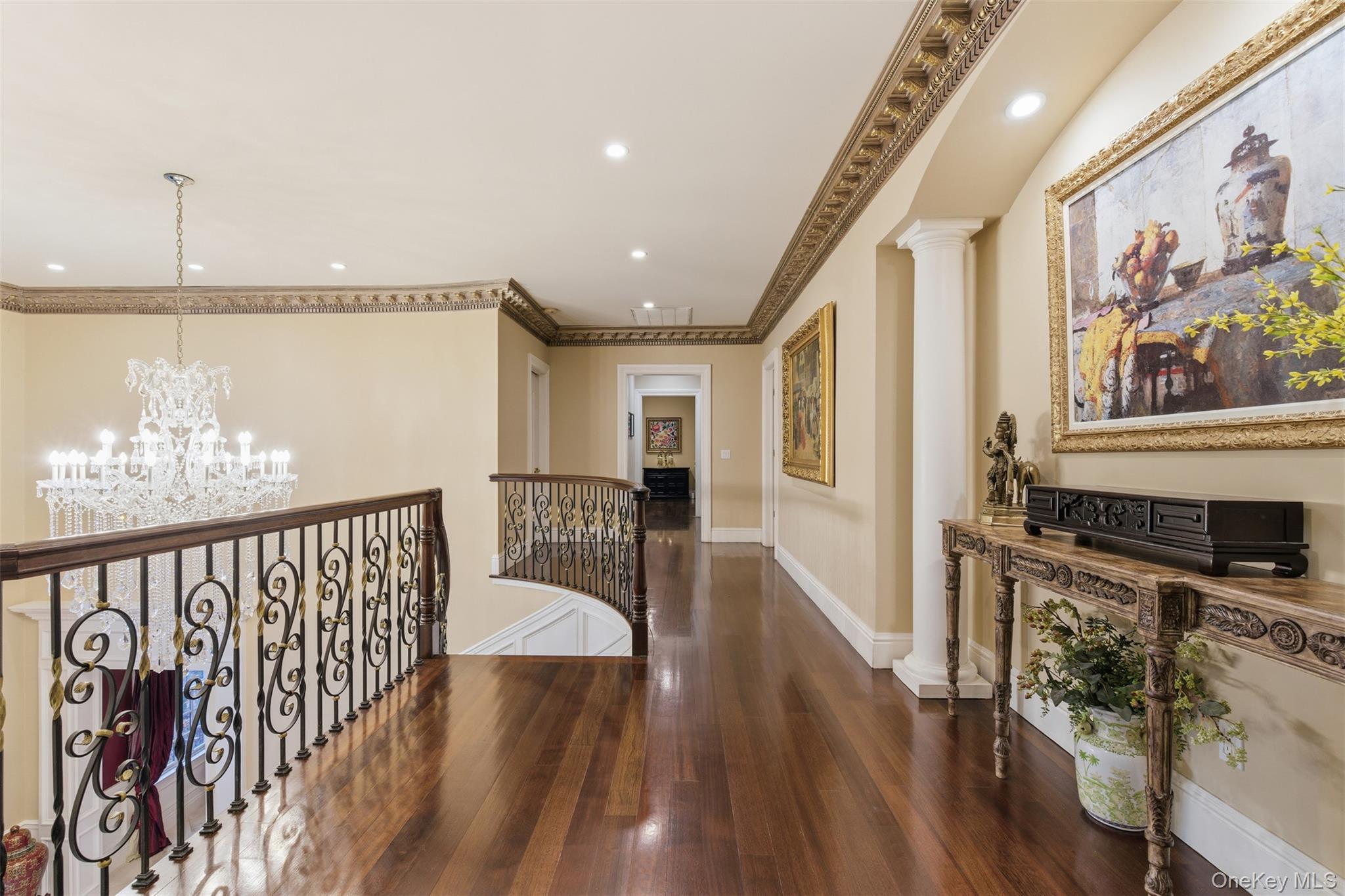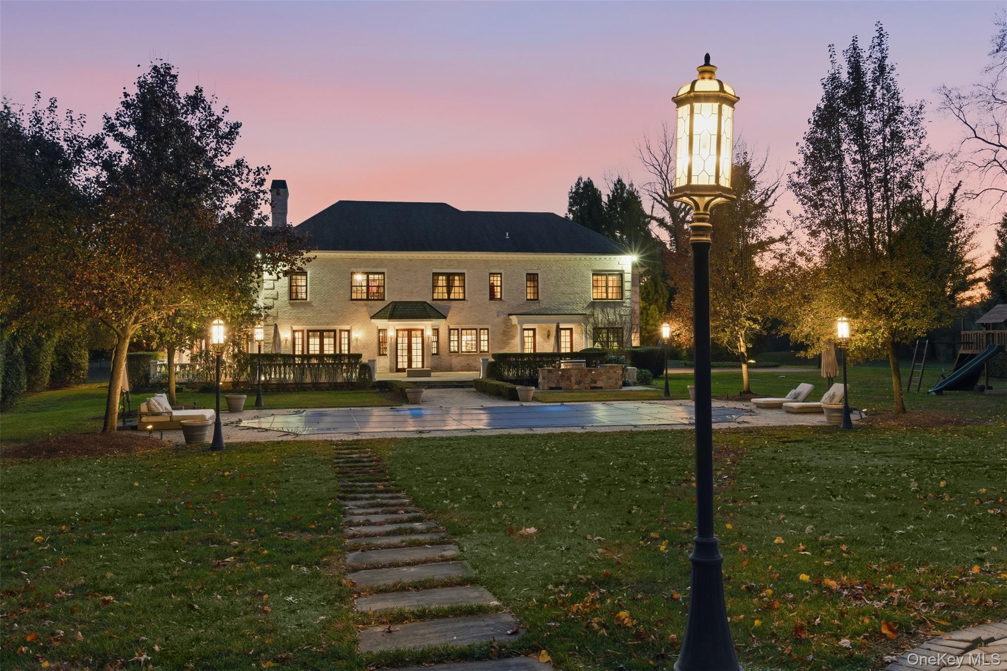 Welcome to 35 Chicken Valley Road, an extraordinary estate in the prestigious enclave of Old Brookville. This gated Brick Center Hall Colonial, masterfully built by the renowned Worrell Group, sits on 4.5 acres of impeccably manicured, estate-quality grounds and offers nearly 10,000 sq ft of finished living space across all levels. A circular drive leads to the stately entryway, accented by a stunning fountain that anchors the grand approach. Step inside to a breathtaking 22-foot entryway with soaring ceilings, intricate moldings, and wainscot paneling framing the sweeping staircase. The double-height foyer introduces refined formal spaces, including a living room with a wood-burning fireplace adorned with an ornamental mantel, marble inlay, and elegant dental molding. Double columns guide you into the sophisticated sitting room, where French doors open to the terrace and create effortless indoor–outdoor flow. The formal dining room is designed for grand entertaining, showcasing wainscot paneling, a decorative ceiling medallion, egg-and-dart crown molding, and exquisite millwork throughout. The renovated gourmet eat-in kitchen features top-of-the-line appliances, custom cabinetry, a large center island, and direct access to multiple outdoor dining terraces. Adjacent formal rooms—also with French doors—further connect to the resort-like grounds. The luxurious primary suite is a true sanctuary, offering 22-foot tray ceilings, hardwood floors, serene estate views, a private sitting room with fireplace, a custom dressing room, and a spa-inspired bath with soaking tub and double vanities. Four additional en-suite bedrooms provide exceptional comfort and privacy, ideal for multigenerational living or long-term guests. The expansive lower level elevates entertainment and wellness with a billiards lounge, wet bar, sound-proof private screening room, 3,100-bottle wine cellar, gym, sauna, and full bath. The breathtaking grounds include a gunite heated saltwater pool, regulation tennis court, outdoor kitchen, sweeping lawns, and multiple blue stone terraces. Additional features include a three-car garage and a Genrac home backup generator. A premier Old Brookville location close to universities, country clubs, golf, marinas, museums, farms, and premier North Shore amenities. Situated within the Award-Winning North Shore School District.