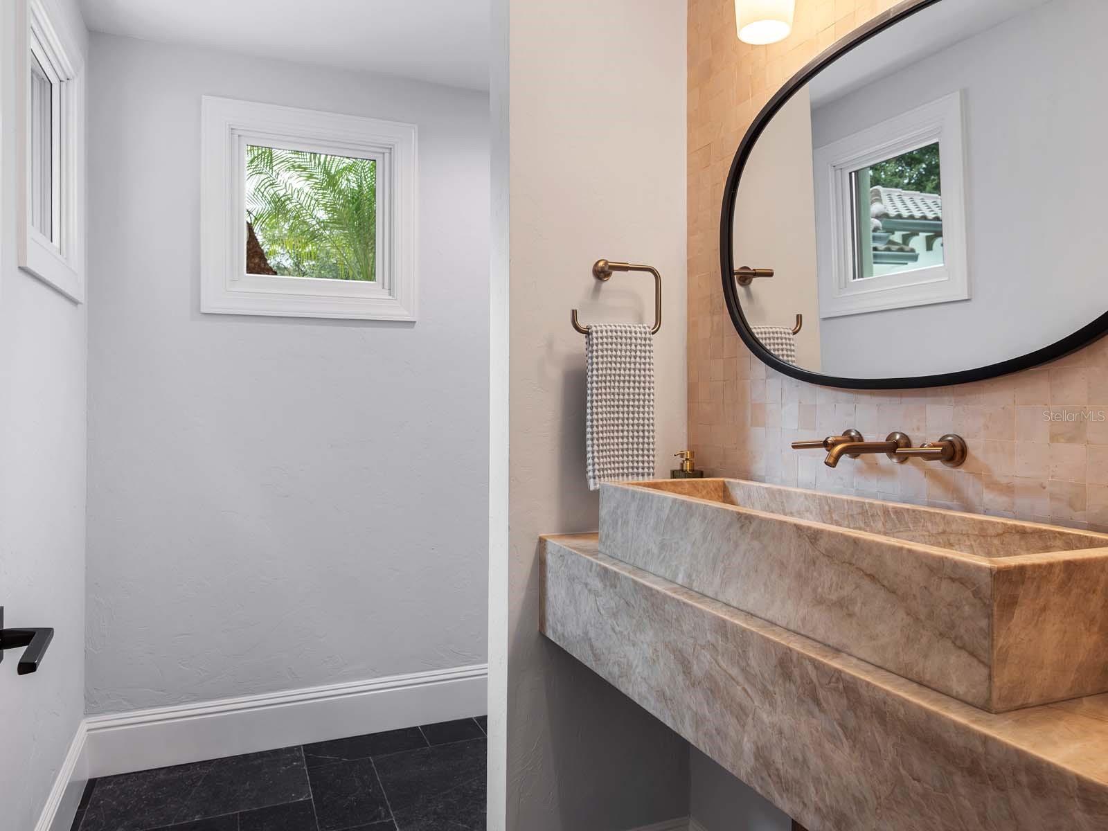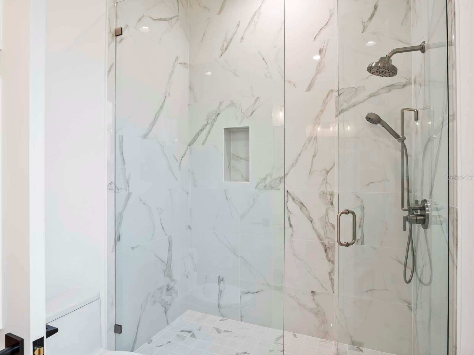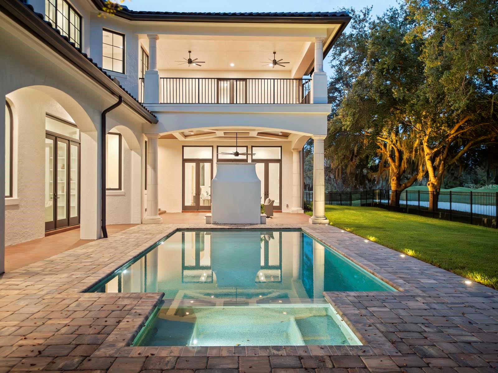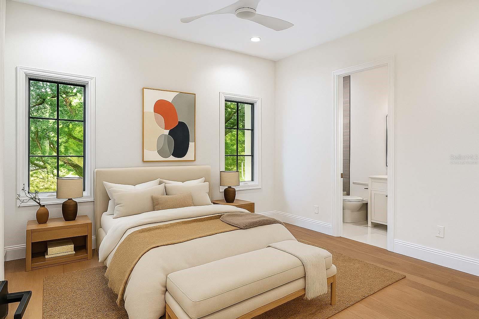 The first-floor owner’s suite offers a serene retreat with dual walk-in closets, a reading nook, and direct access to the lanai. The spa-inspired bath highlights a freestanding soaking tub, custom vanities, and an oversized glass-enclosed shower. The second floor is comprised of three generously sized en suite bedrooms, a dedicated study/office, bonus/media room and access to an expansive covered balcony.
