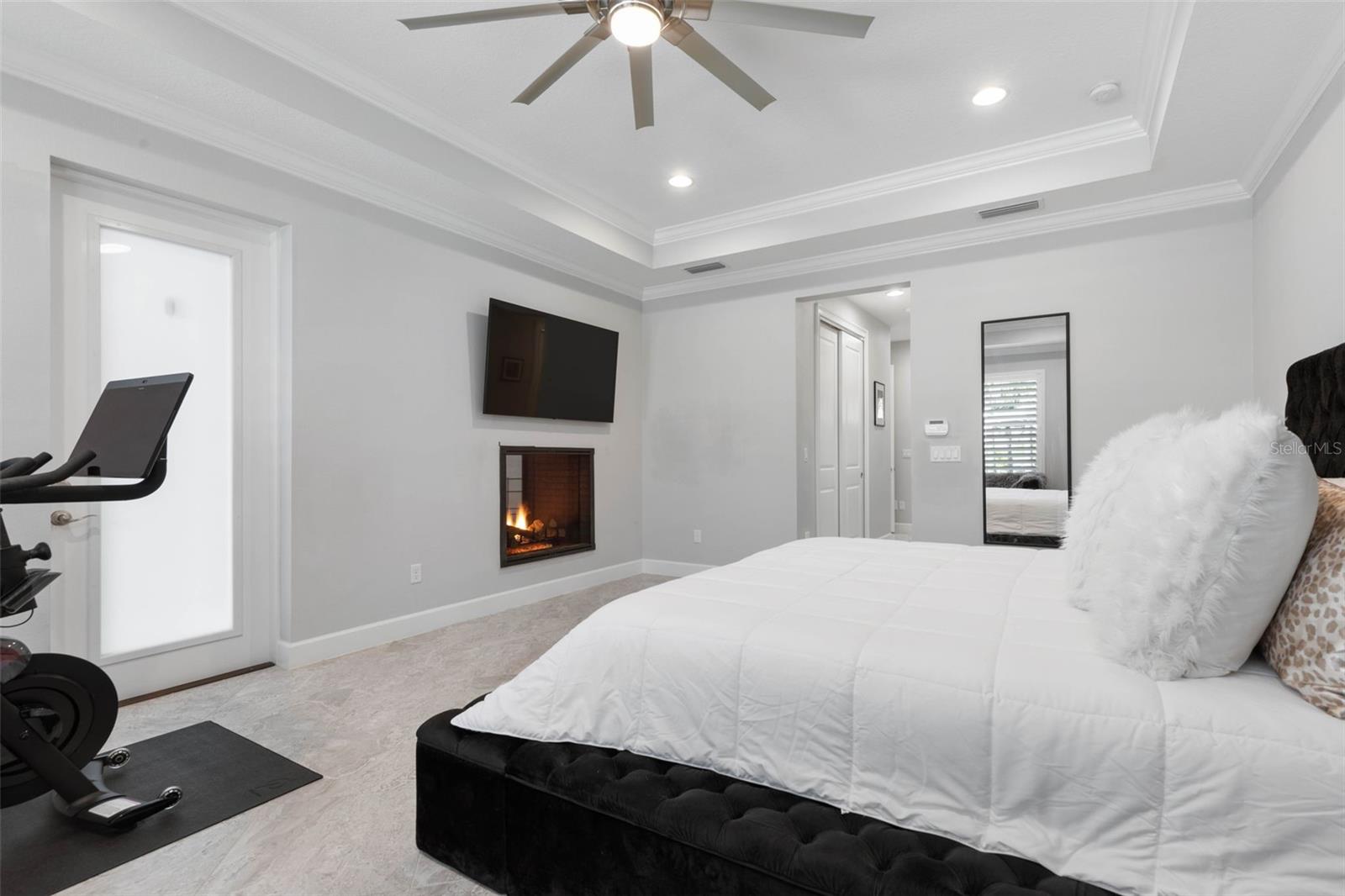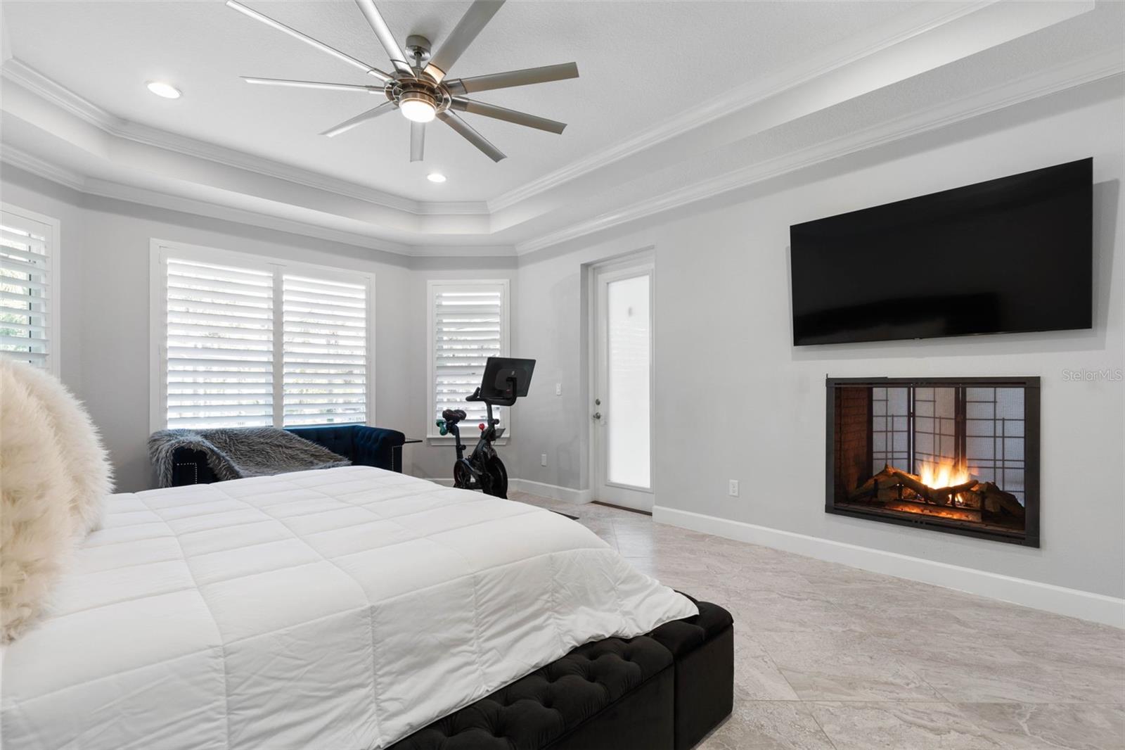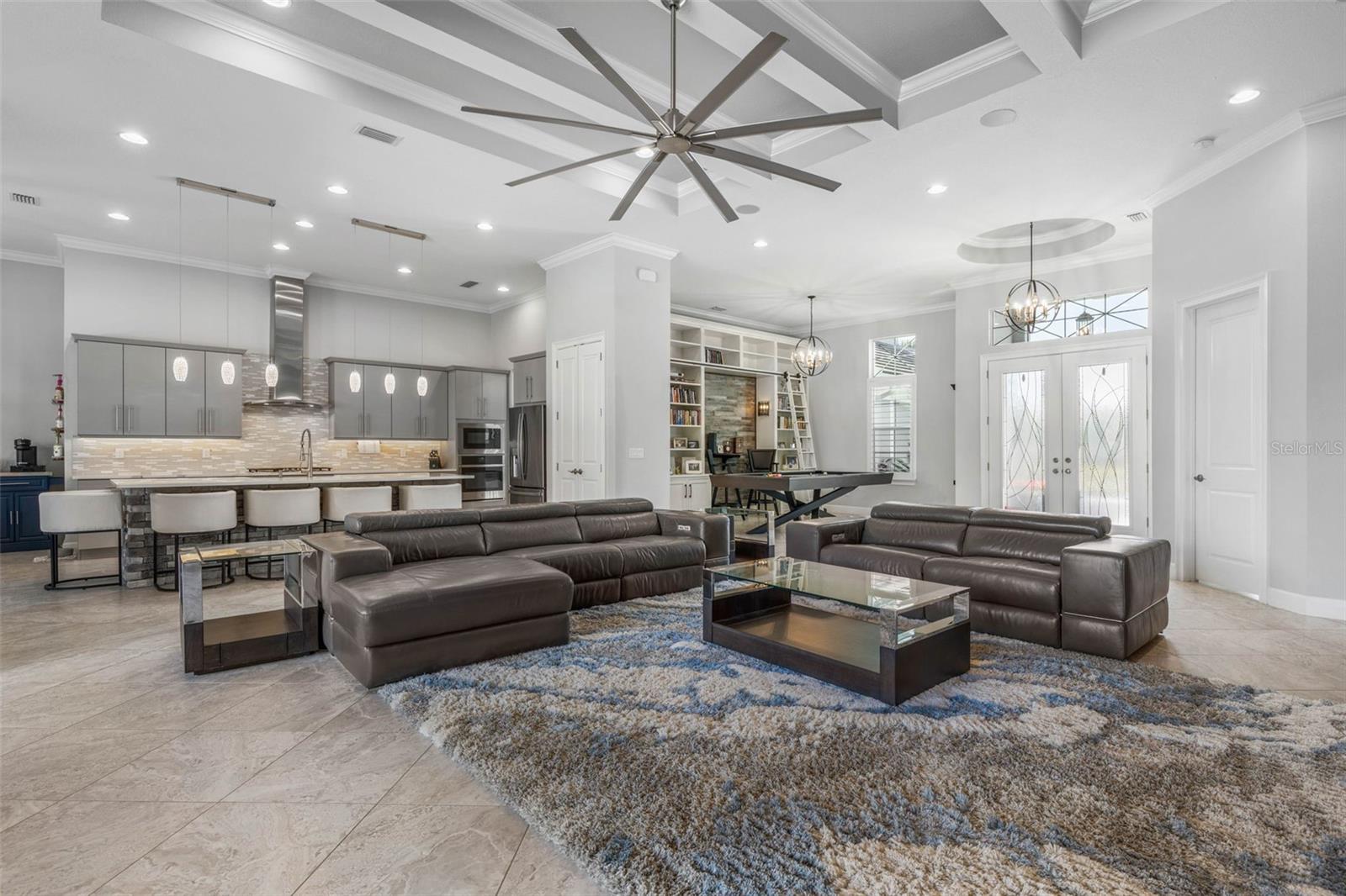 Through leaded-glass French doors, soaring tray ceilings and light-filled living spaces welcome you into the main residence. A striking double-sided fireplace, shared with the primary suite, anchors the elegant living room, while disappearing sliding glass doors open fully to the lanai, summer kitchen, pool, and waterfront beyond — creating true indoor-outdoor living.