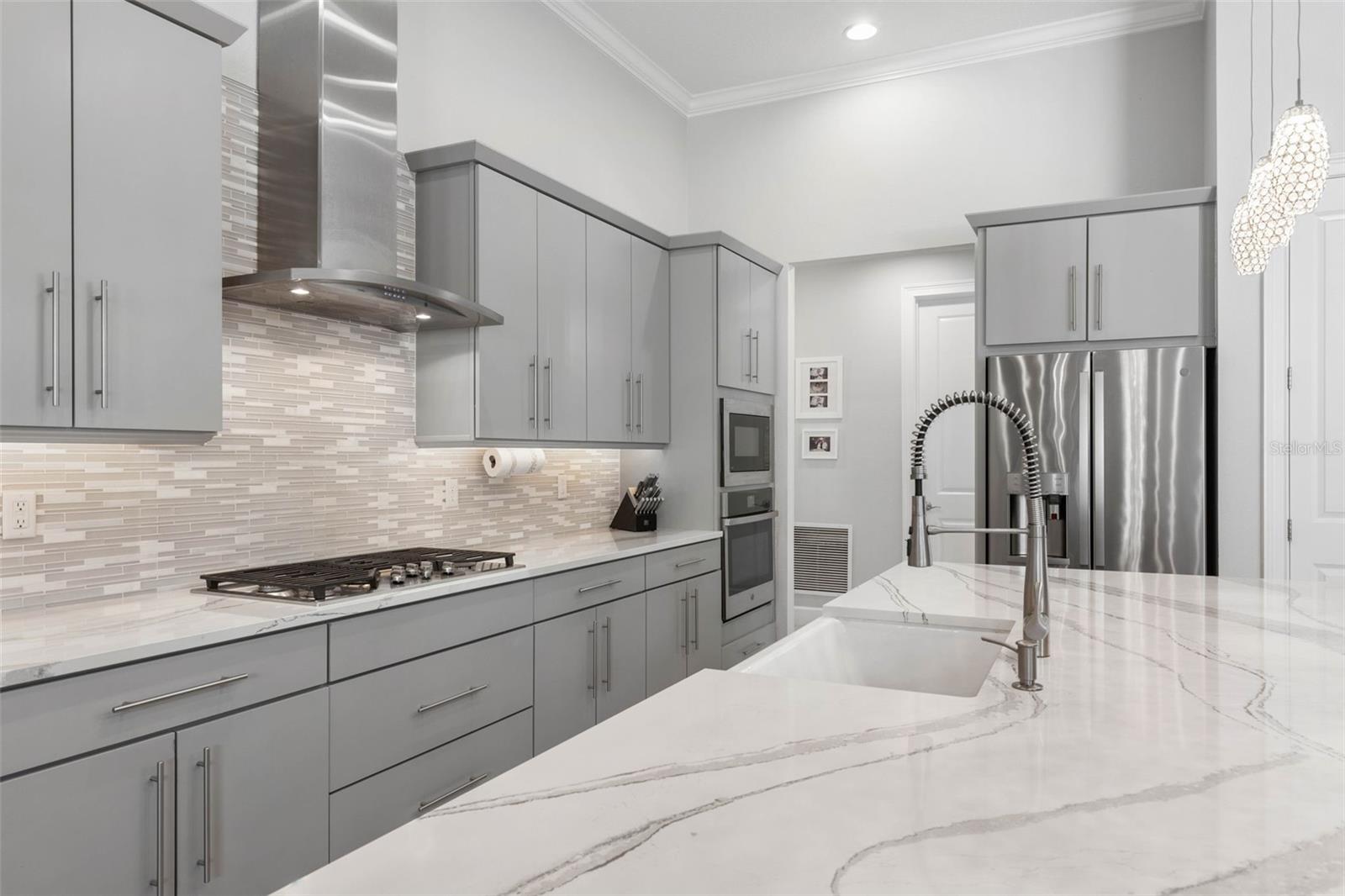 The gourmet kitchen features Cambria quartz countertops, GE Profile stainless steel appliances, and a gas cooktop and hood designed for serious culinary enthusiasts. The oversized island and breakfast nook both enjoy sweeping views of the pool and waterway.