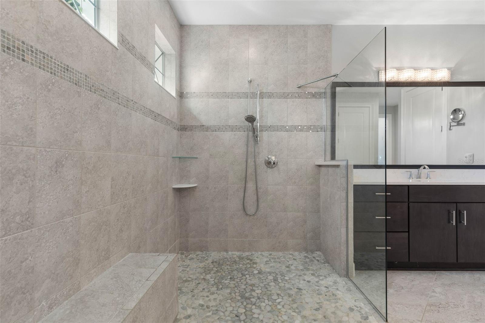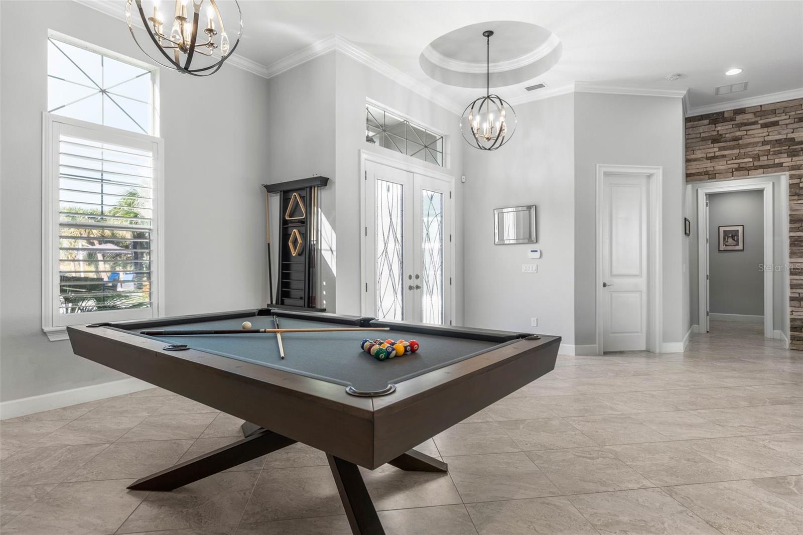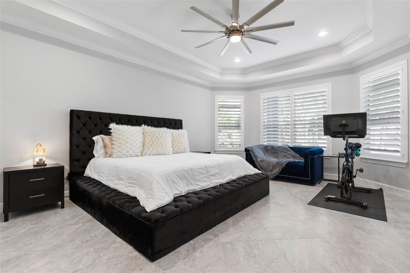 The primary bedroom retreat occupies the entire north wing, offering private lanai access, volume tray ceilings, two custom walk-in closets, and a spa-inspired bath with dual glass-enclosed shower, built-in seating, split vanities, and private water closet. Adjacent is a fourth bedroom currently used as a distinguished office, highlighted by an elegant oval window array — the home’s own “Oval Office.”
