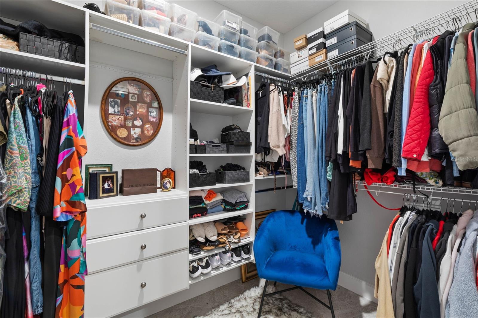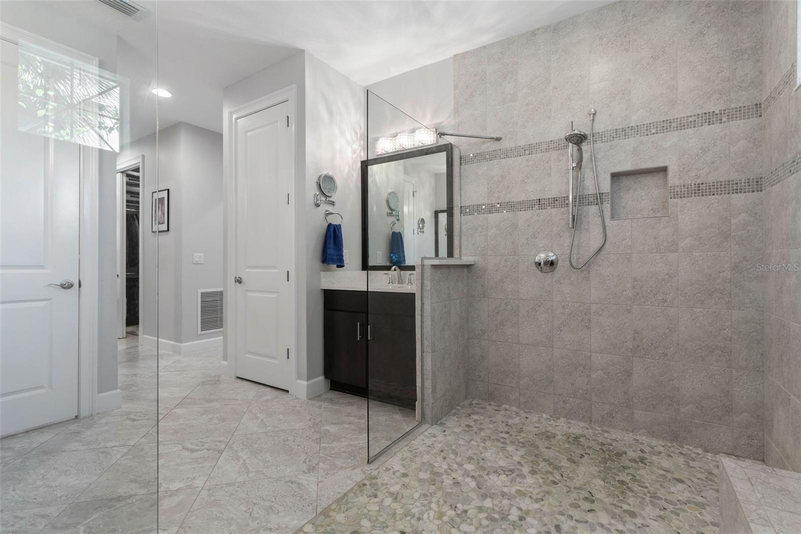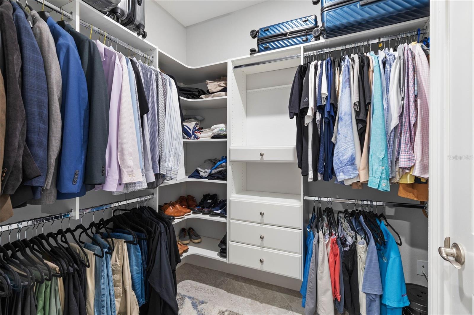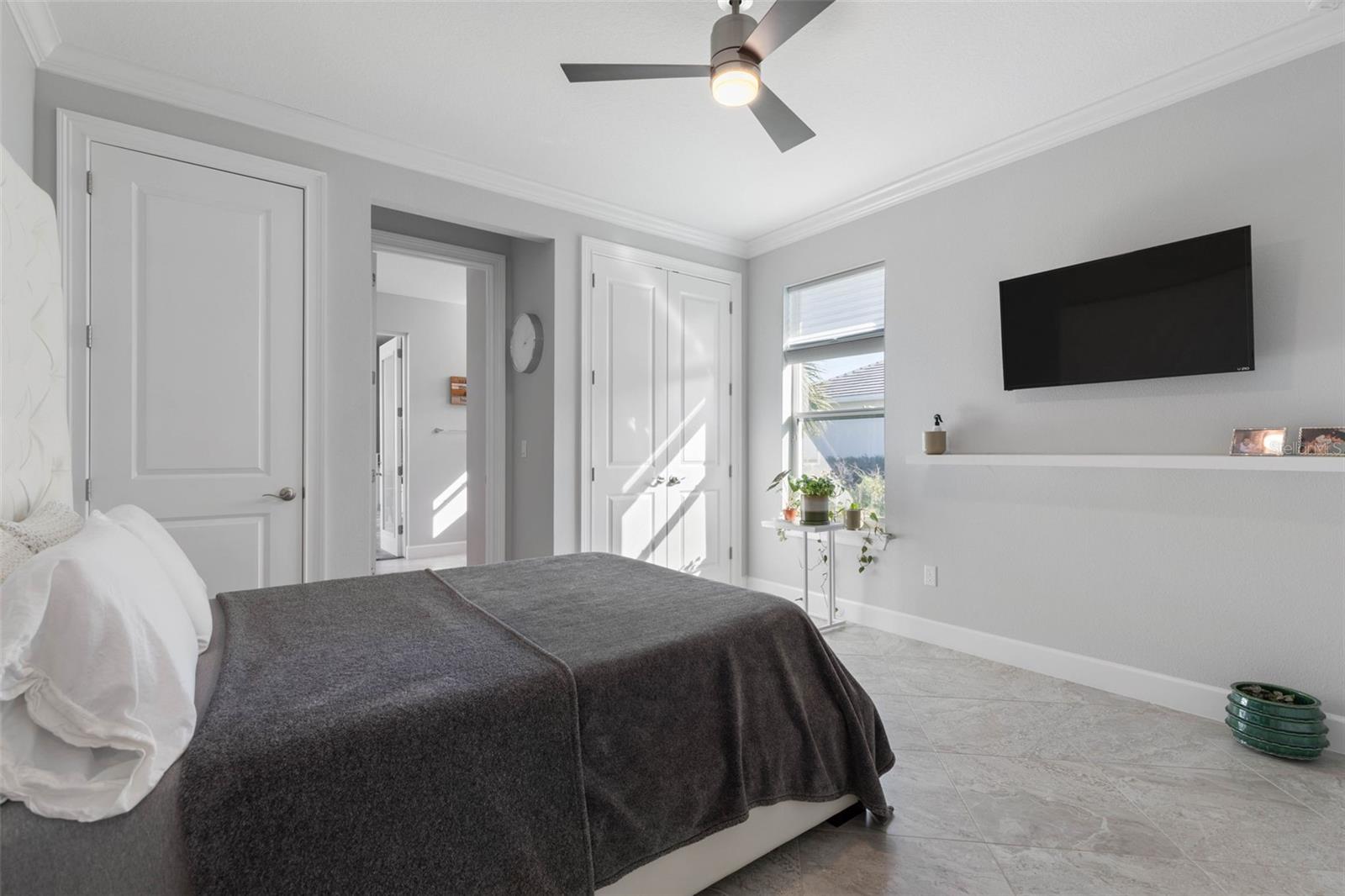 The primary bedroom retreat occupies the entire north wing, offering private lanai access, volume tray ceilings, two custom walk-in closets, and a spa-inspired bath with dual glass-enclosed shower, built-in seating, split vanities, and private water closet. Adjacent is a fourth bedroom currently used as a distinguished office, highlighted by an elegant oval window array — the home’s own “Oval Office.”