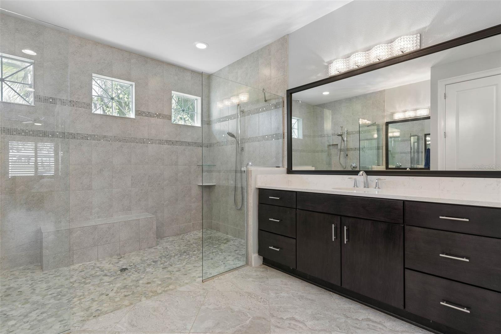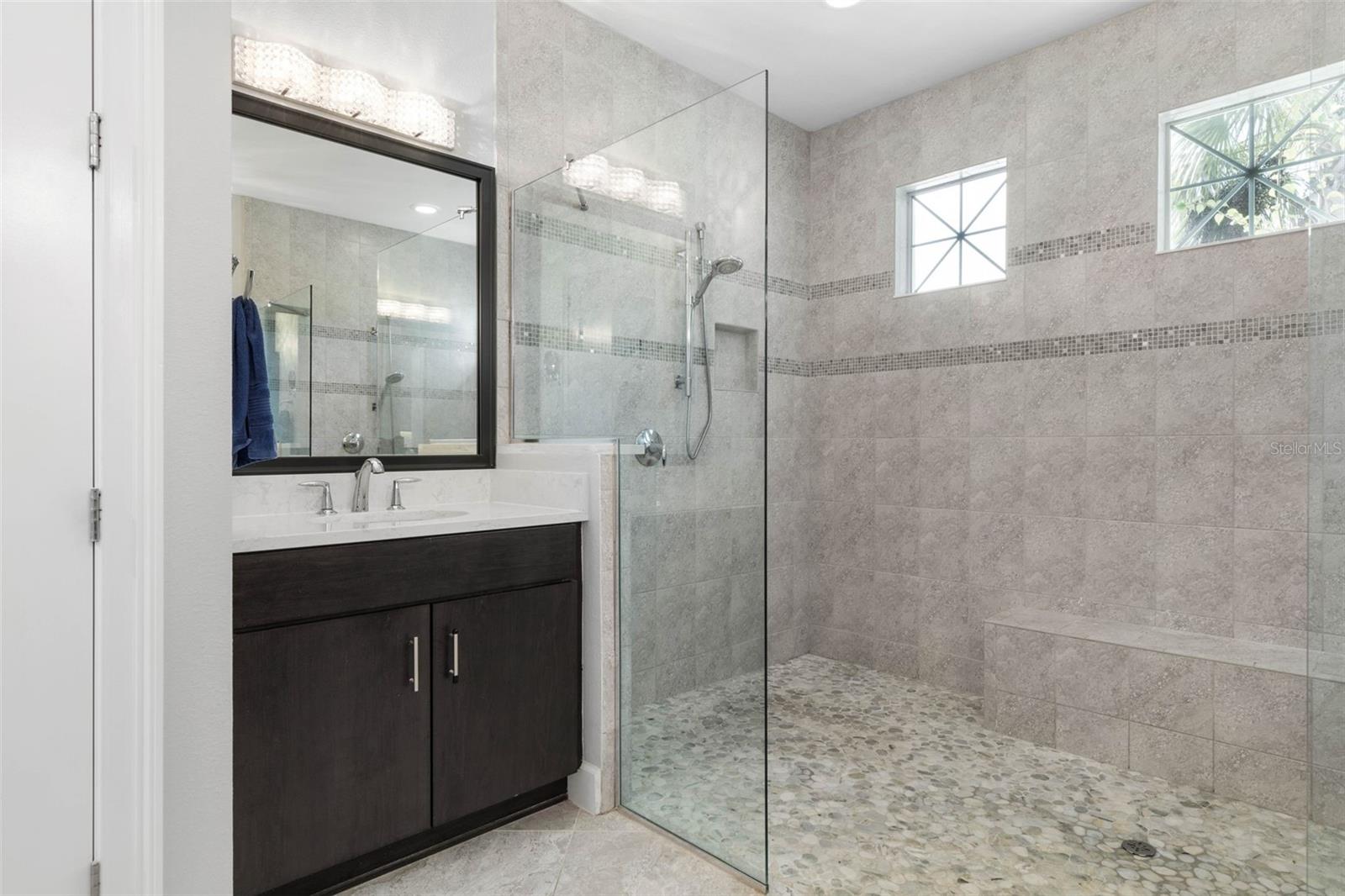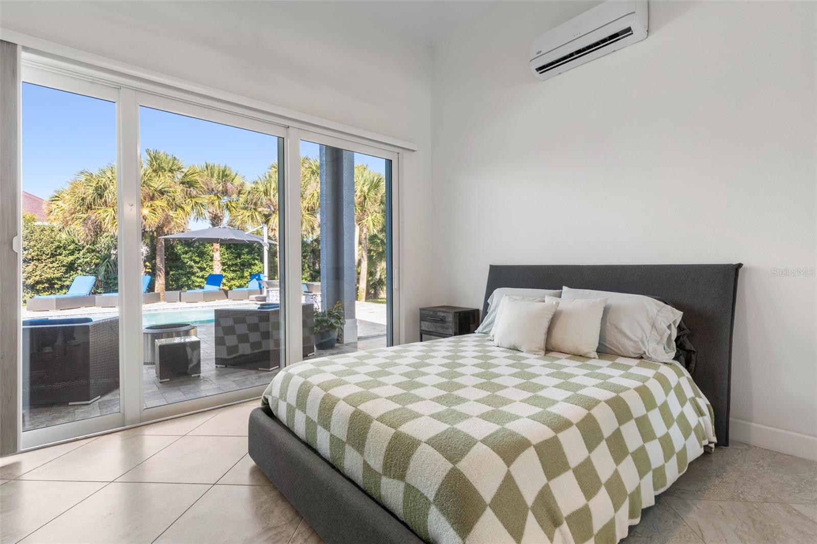 The south wing includes two generous guest suites, each with full ensuite baths, one of which also serves as a dedicated pool bath opening directly to the pool, covered lanai and covered summer kitchen.