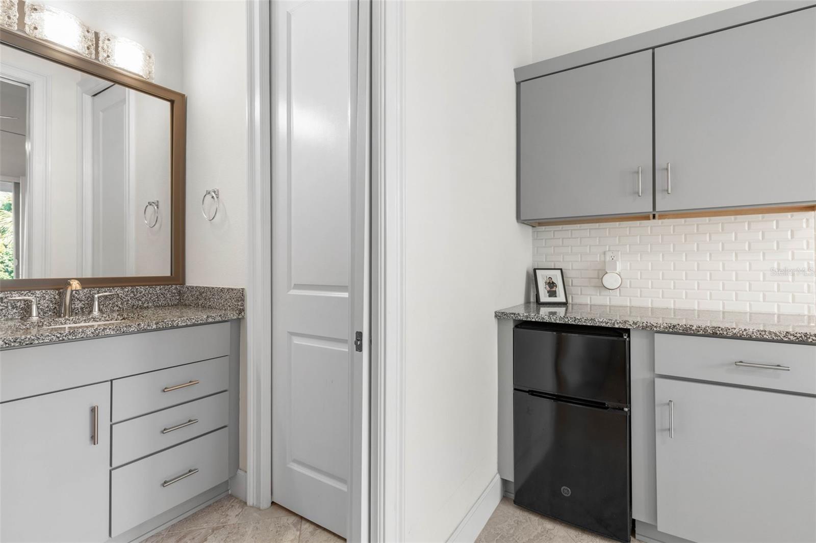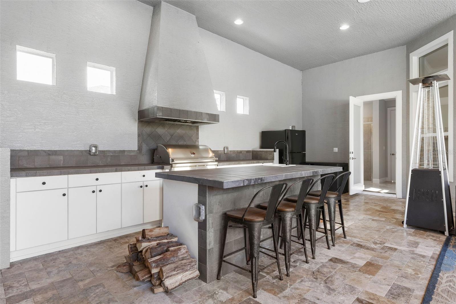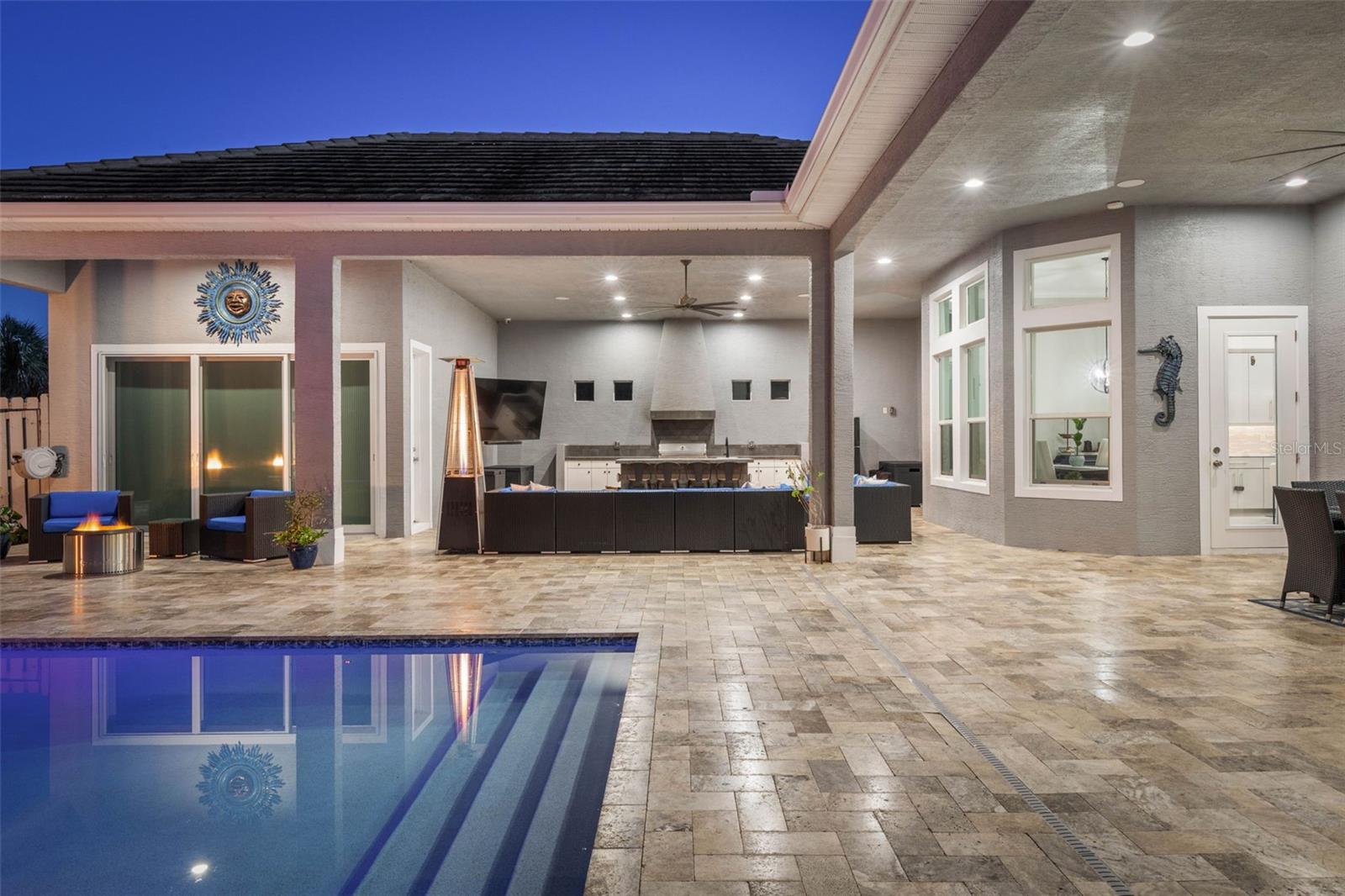 A rare detached one-bedroom, one-bath casita with private entrance and kitchenette offers guests or extended family a truly private luxury experience. It opens to a stunning 26’ x 27’ covered summer kitchen with built-in grill and vented hood, seamlessly connecting to a 24’ x 17’ covered lanai overlooking the 30’ x 15’ heated and cooled pool with fire-bowl features and tranquil water views.