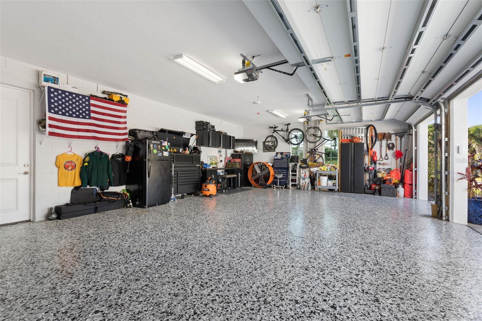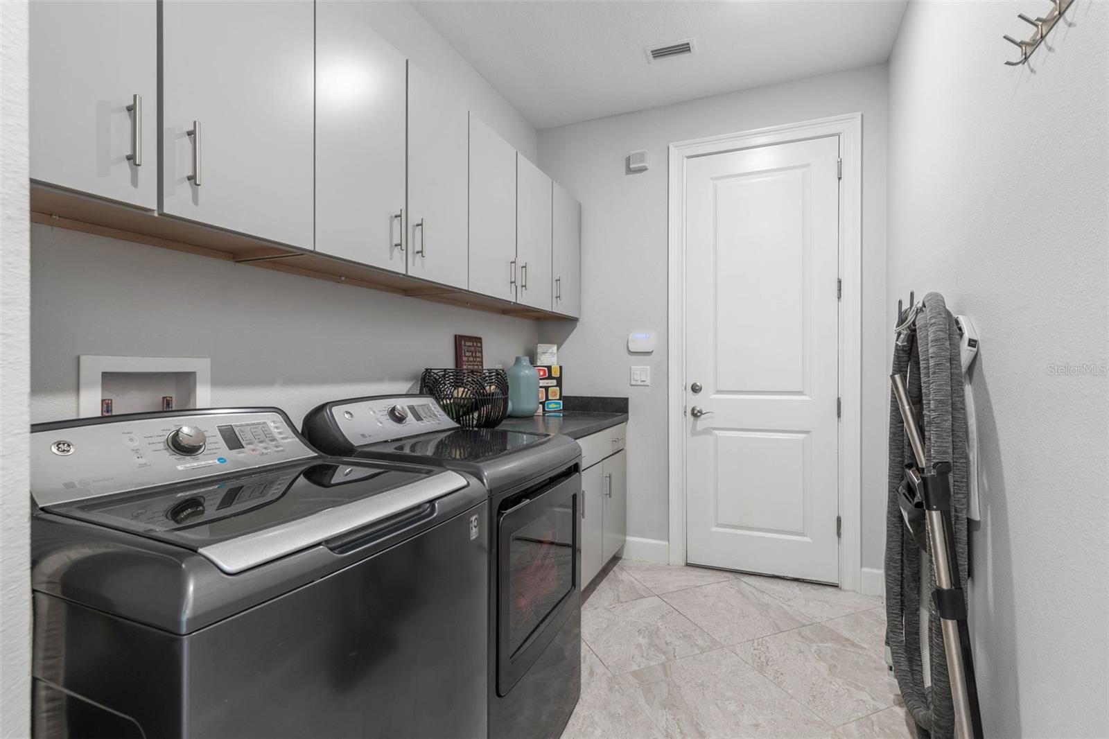 A side-entry three-car garage features decorative sealed flooring, central vacuum system for the entire house, overhead storage, and one of two washer/dryer sets. A second interior laundry room adds convenience and flexibility.