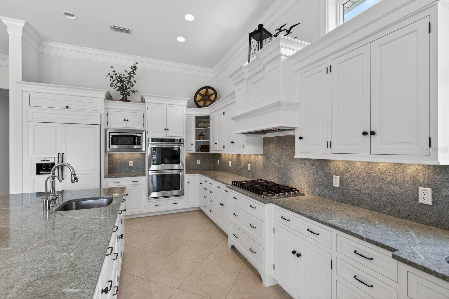 Enter through a grand foyer featuring elegant tongue-and-groove ceiling details, leading to a soaring great room, formal dining area, and gourmet chef's kitchen. The kitchen boasts premium stainless steel appliances, custom cabinetry, a spacious center island with breakfast bar, glass-front butler's pantry, and a large walk-in pantry.