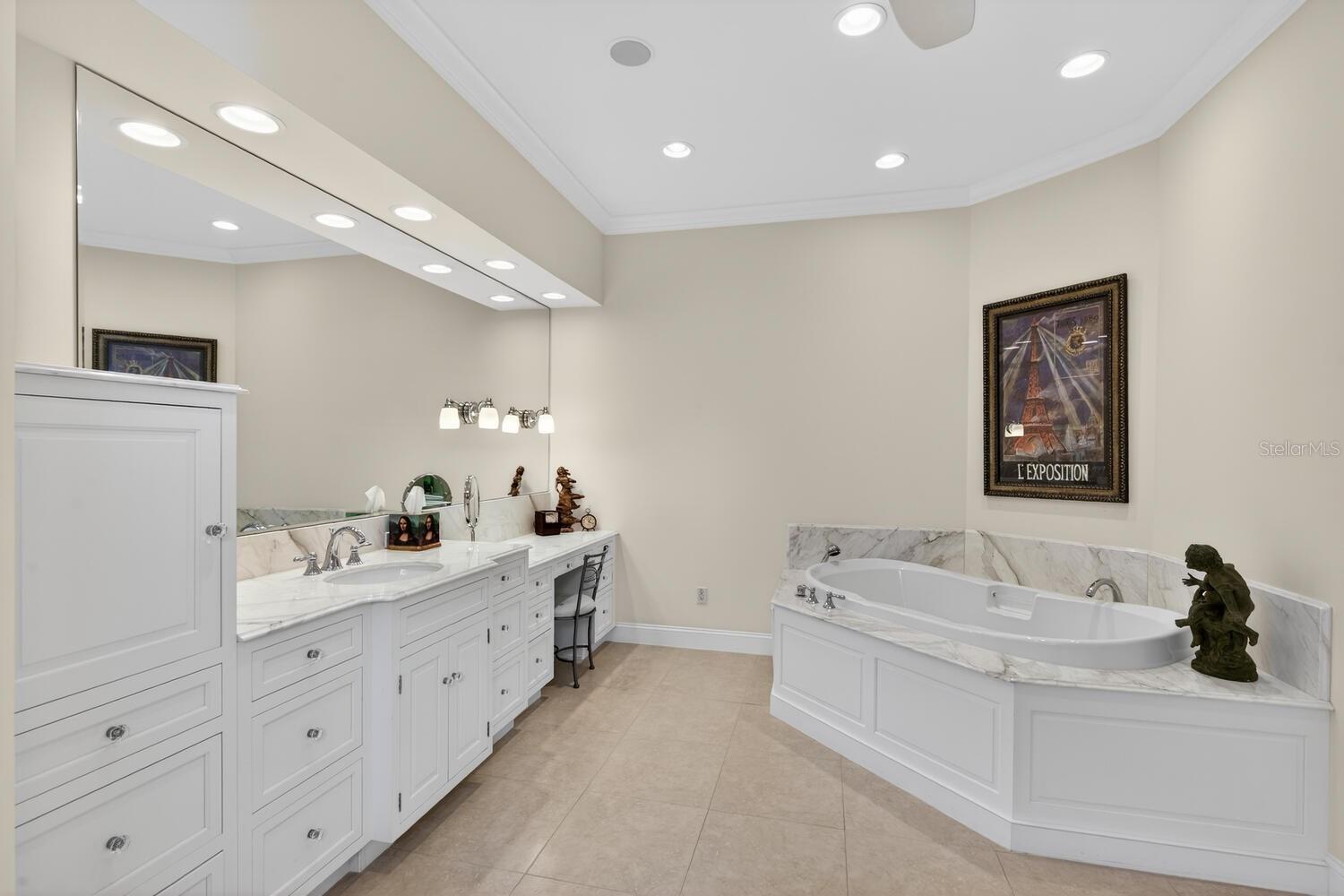 The serene primary suite offers a private retreat with water views, ample space, and a luxurious spa-inspired bath complete with soaking tub, oversized walk-in shower, and dual vanities. A dedicated home office with direct outdoor access provides a productive and inspiring environment. Additional spacious guest bedrooms and baths ensure comfort and privacy for family and guests.