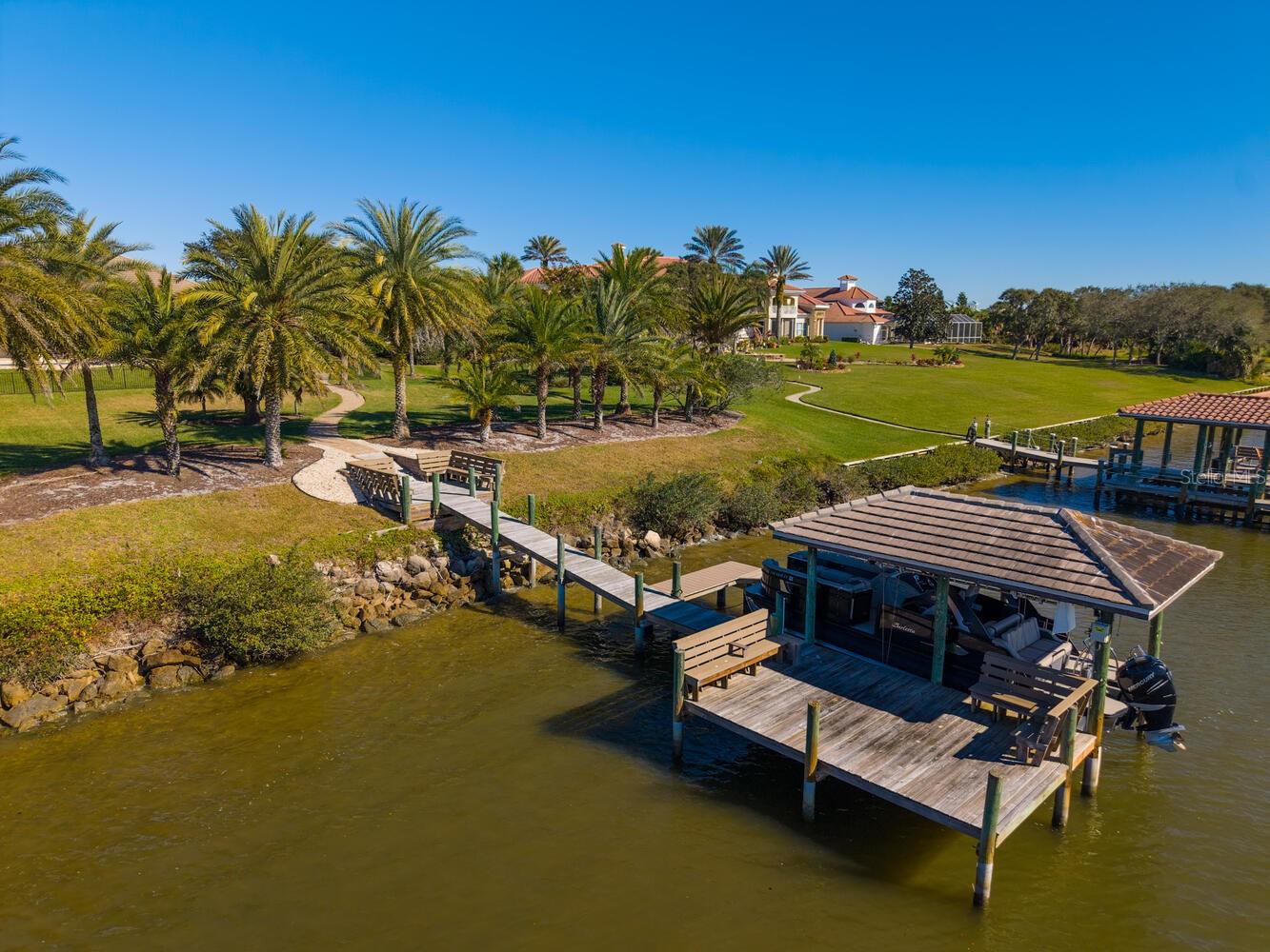 Unwind on the generous covered lanai, overlooking a sparkling pool, lush tropical landscaping with mature palms, and spectacular sunsets across the Intracoastal. Ideal for outdoor entertaining, al fresco dining, or relaxed lounging. The property includes a covered boat dock with a 6,000 lb lift, water, and power (boat available for separate purchase).
