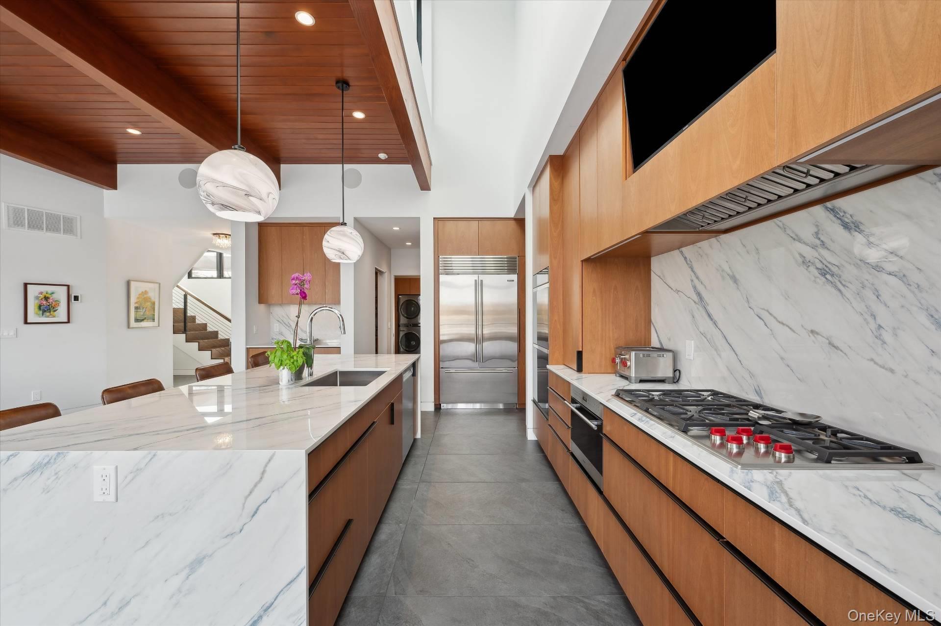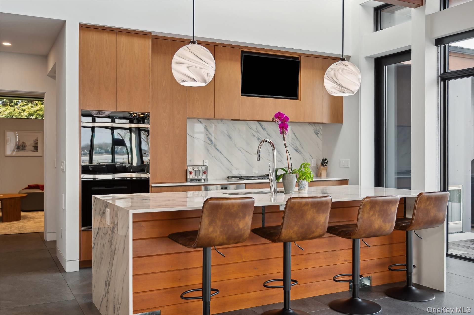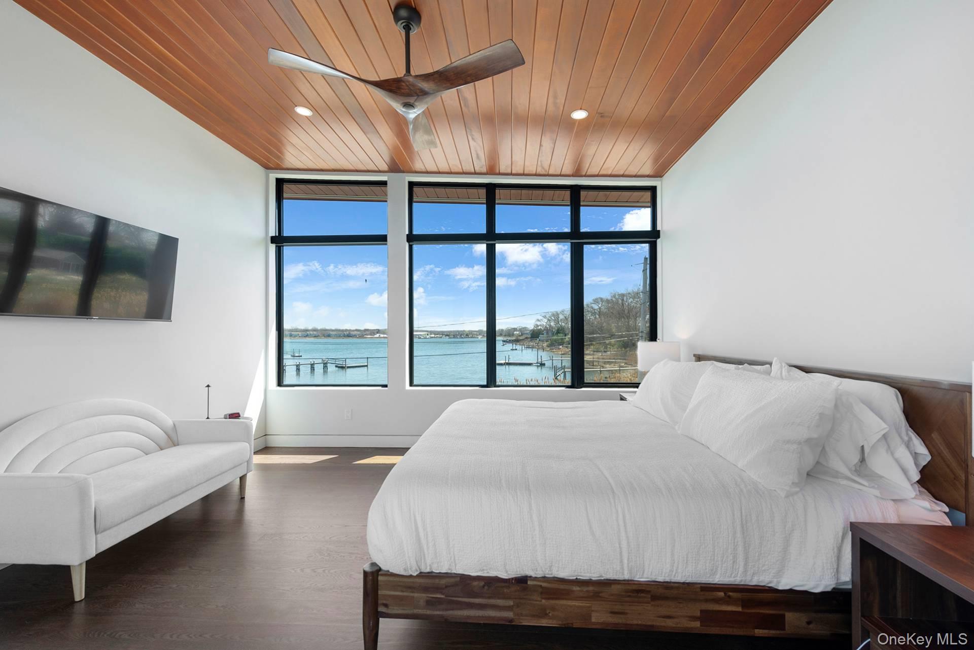 Sag Harbor Modern Waterfront This exquisite five-bedroom, five-and-a-half-bath residence, a creation by the esteemed Turkel Design, is meticulously crafted to leverage its prime location, offering breathtaking water views of Sag Harbor Cove from nearly every vantage point. A grand two-story foyer welcomes you into the open-concept living area, which seamlessly connects to the gourmet eat-in kitchen. This culinary space is appointed with marble waterfall countertops, bespoke cabinetry, a convenient butler's pantry, and top-of-the-line appliances, including dual Wolf wall ovens, a Subzero refrigerator, and a Bosch dishwasher. Floor-to-ceiling glass throughout the living areas captures expansive water vistas and provides direct access to the outdoor sanctuary. Your first floor also includes a Jr. primary with walk in closet, heated bathroom floors his home is replete with modern conveniences, including a 4-zone dual-hybrid heat pump propane furnace system, power window shades in the living and primary bedroom, a Ring camera system, pre-wiring for additional exterior video cameras, central vac, and a multizone irrigation system. Further enhancing its self-sufficiency are a 16kw solar panel system and a Generac 24kw generator. Practicality is key, with direct access from the garage to a generous laundry/mud room, and a powder bath. The attached two-car garage adds to the home's functionality. Upstairs, the primary bedroom suite offers an oversized walk-in closet, and a sleek freestanding tub set against a wall of glass, providing unparalleled views of Sag Harbor Cove. The second floor also hosts three additional en-suite bedrooms and a convenient second-floor laundry. The luxurious exterior features a free-form saltwater pool and spa, controlled by a Pentair system, all set within extensive teak decking. A charming wood-burning fireplace on the deck overlooks Sag Harbor Cove, complemented by indigenous landscaping, a new bulkhead, and dock. With direct water access, residents can easily explore the surrounding coves, bays, and waterfront restaurants on Shelter Island and the North Fork. This modern masterpiece presents an unparalleled opportunity to experience luxurious waterfront living in Sag Harbor.