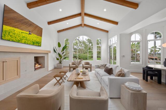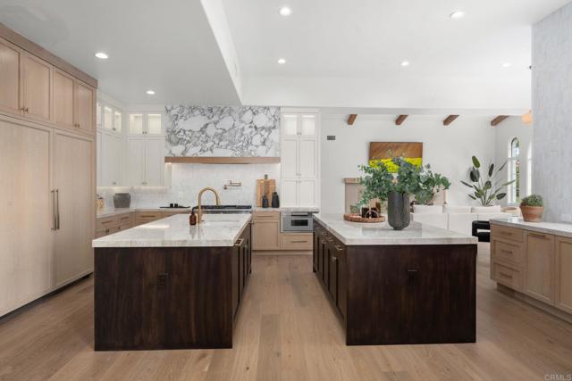 Positioned within the exclusive guard-gated enclave of Rancho Pacifica, 5146 Rancho Verde Trl presents a beautifully reimagined estate where classic architecture meets a crisp, modern refresh. Thoughtfully transformed throughout, the home pairs dramatic volume with refined finishes—soaring ceilings, elegant archways, and walls of windows that flood the interiors with natural light. Wide-plank white oak floors run seamlessly from room to room, setting a warm, elevated tone. The kitchen is the showpiece—fully redesigned for both function and style with custom white oak cabinetry, dual oversized islands, striking quartzite countertops, and a complete suite of new Thermador appliances. A sculptural marble hood detail anchors the space, while the open layout flows effortlessly into the bright family room and sunlit breakfast nook—perfect for casual mornings or hosting with ease. On the main level, the primary suite offers a true retreat, featuring a spa-caliber bath with an expansive wet room, dual shower heads, and two generous walk-in closets designed for everyday luxury. Additional guest bedrooms are spacious and private, each with its own en-suite bath—ideal for family and visitors alike. Set on just over half an acre, the grounds are designed for resort living with lush landscaping, multiple outdoor gathering areas, and a pool and spa that invite year-round enjoyment. Just minutes from Del Mar, premier schools, acclaimed golf clubs, and coastal access, this is a rare opportunity to own a turnkey home in one of the most coveted communities.