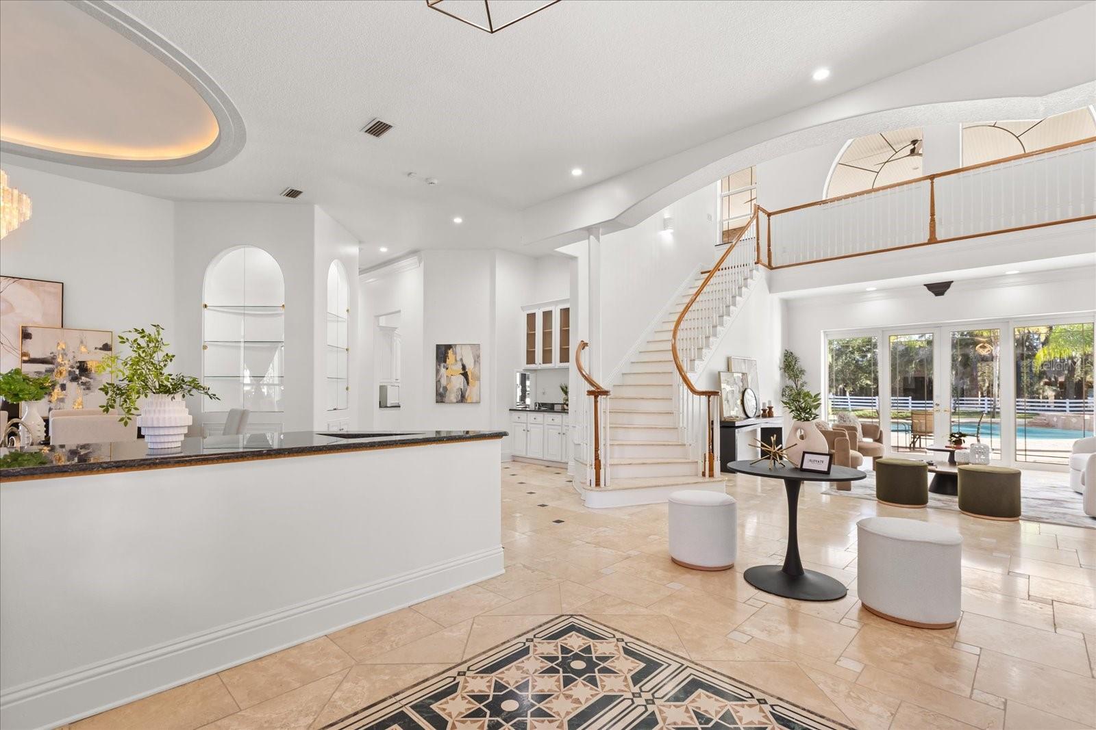 At the heart of the home, the gourmet kitchen features granite countertops, dual islands, premium appliances, and a butler’s pantry, flowing seamlessly into a spectacular family room with 24-foot ceilings and dramatic floor-to-ceiling glass. A covered porte-cochere introduces a stunning stained-glass entry, opening to a sun-filled foyer flanked by formal living and dining spaces.