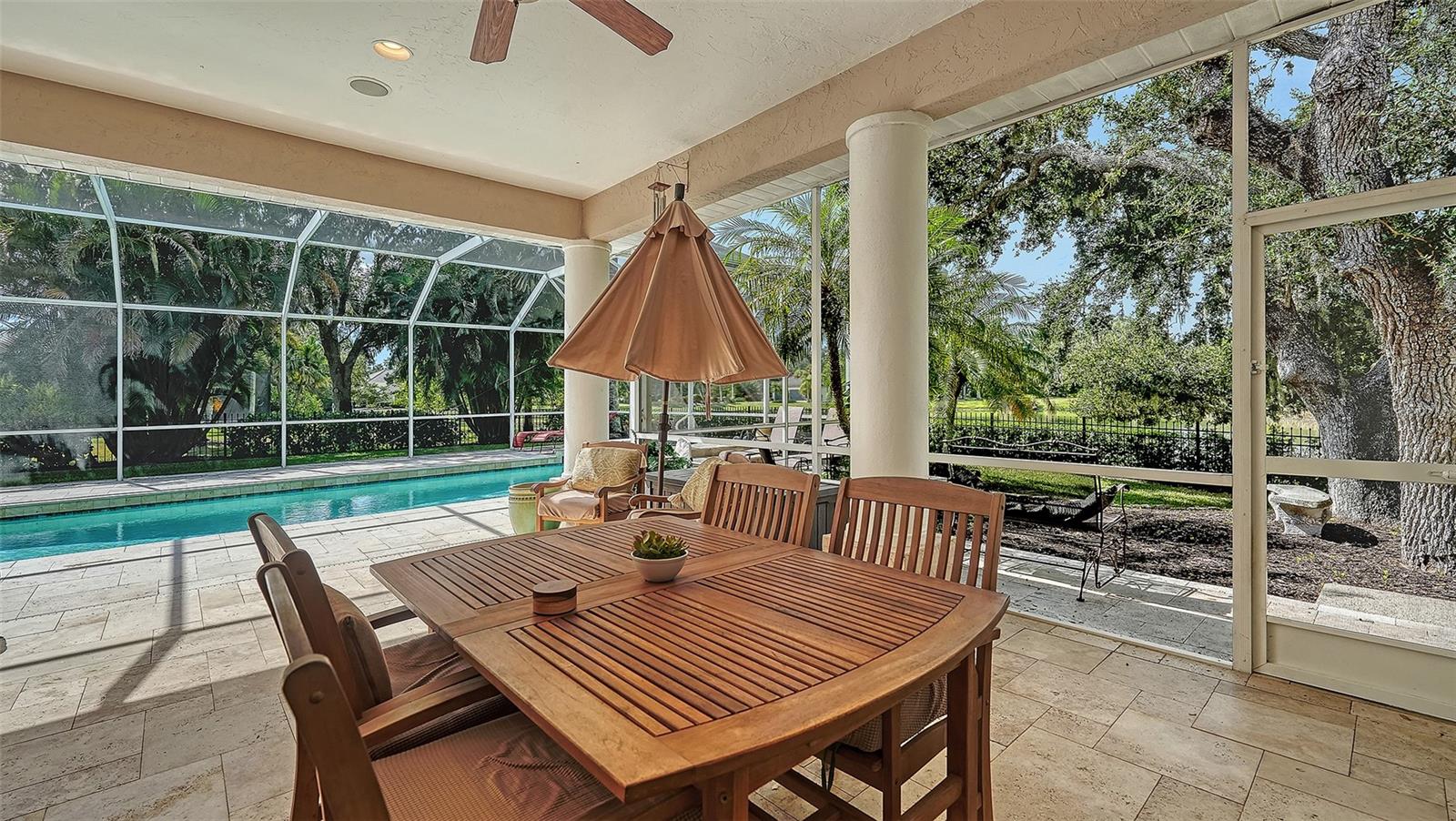 A long list of major improvements completed since 2021 brings lasting value and peace of mind. A new roof (2021), two HVAC systems, new hurricane-impact windows and sliders (2023), updated propane gas lines tied to a buried 250-gallon tank (serving the range and fireplace), a new backyard fence, a resurfaced pool, and a travertine pool deck elevate both efficiency and style. The expansive screened lanai—with a built-in grill, sink, and refrigerator—creates an inviting backdrop for year-round outdoor dining overlooking the private, park-like yard.