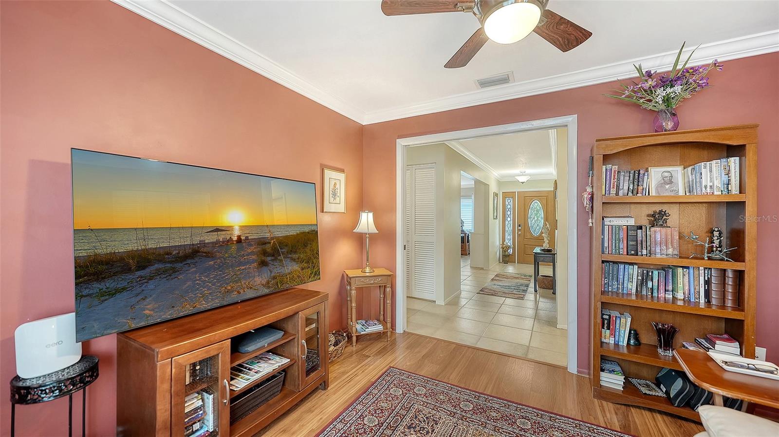 This exquisitely landscaped home showcases native plants, vibrant flowers, and stunning trees including a Flamboyant Royal Poinciana, Mature Mango tree, and striking Blue Hawaii Jacaranda, creating exceptional curb appeal and a warm welcome for residents and guests alike. The property also enjoys peaceful views of one of The Meadows’ golf courses, adding to the sense of openness and tranquility.