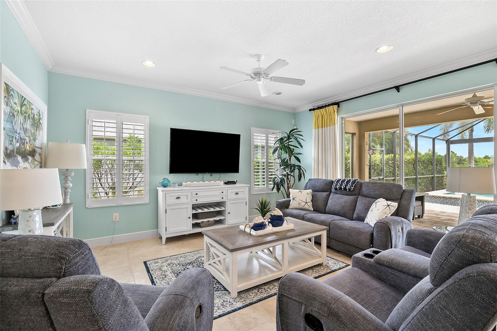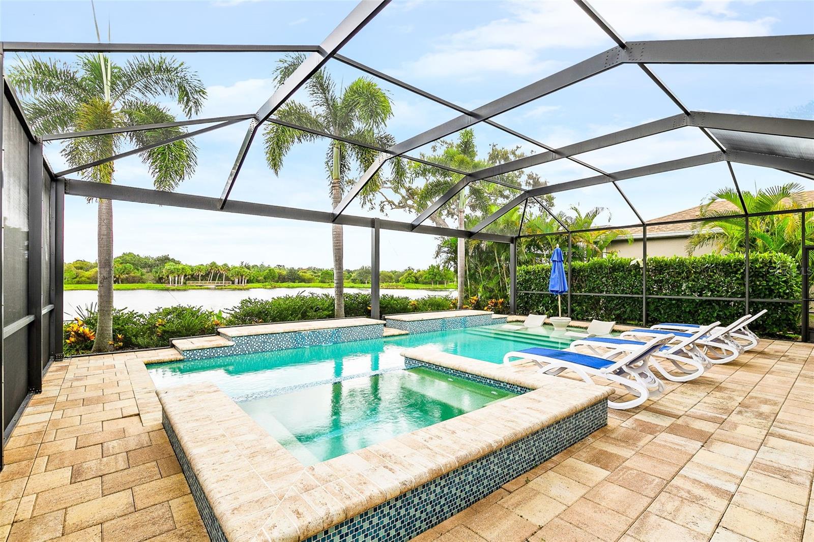 Escape to your own resort-style backyard, where a heated saltwater pool and spa beckon for year-round relaxation. The sun-soaked deck and covered lanai, framed by a serene pond and scenic walking trail, provide the perfect backdrop for entertaining or unwinding in tranquility. A clear view screen ensures unobstructed vistas of this peaceful setting.