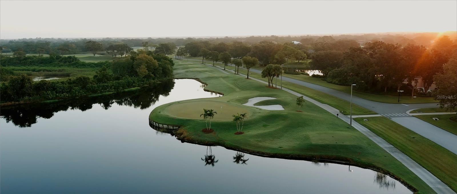A private winding drive and manicured landscaping introduce the stately façade, where double entry doors open to a grand foyer with high ceilings and walls of large windows that fill the interiors with natural light. The spacious living and dining areas feature custom built-ins and millwork, with expansive sliders framing sunset views of the sparkling pool and golf course beyond. Perfect for entertaining, the gourmet kitchen combines rich wood cabinetry with granite countertops, a large center island, double ovens, built-in refrigerator, wet bar area, and casual dining nook overlooking the fairway. The adjoining family room offers a warm gathering space anchored by solid wood built-ins and a gas fireplace, with seamless access to the screened lanai for alfresco living.