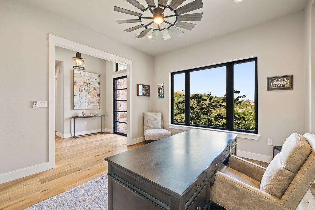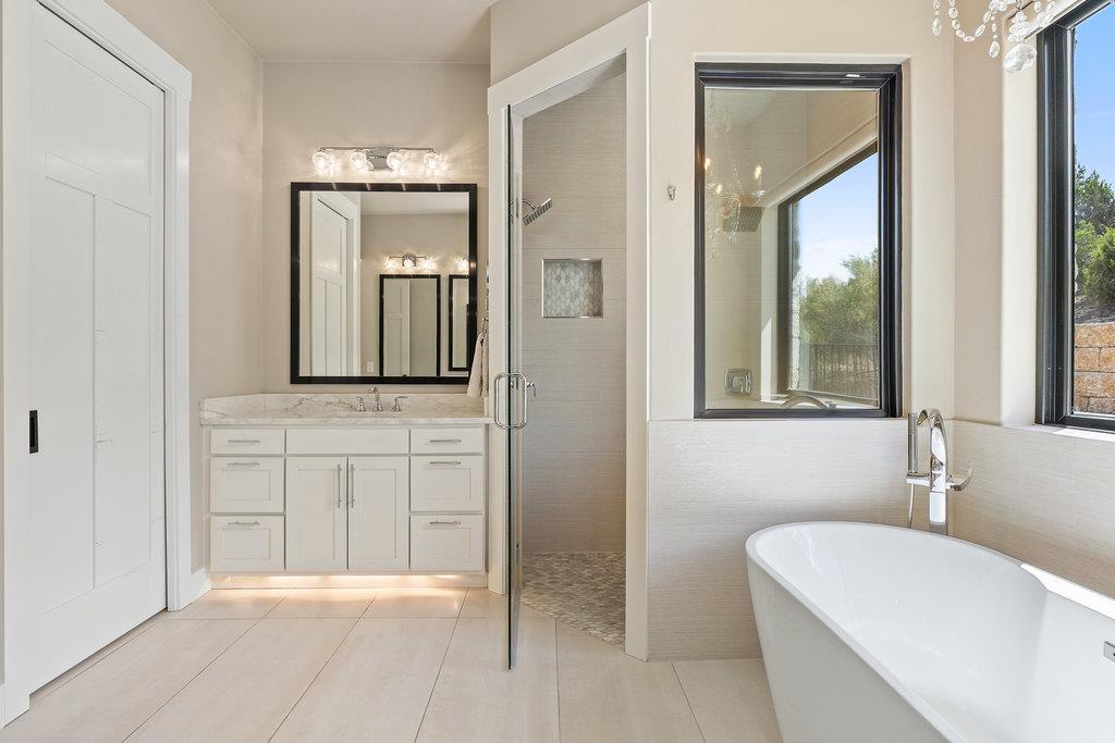Serene Luxury with Lake Travis Views – Experience the perfect blend of privacy, sophistication, and Hill Country charm in this custom home by County Line Custom Builders. Set on 1.54 beautifully landscaped acres in the coveted Tres Verde community, this gated estate offers 4,273 square feet of luxury living with 5 bedrooms and 5 full baths. Step inside to an open floor plan featuring hardwood floors, plantation shutters, designer lighting, and abundant natural light. The Chef’s Kitchen delights with Quartzite countertops, custom white cabinetry, a built-in wine fridge, and a butler’s pantry. The living room centers around a cozy fireplace, while expansive Marvin sliding glass doors frame views of the sparkling pool and spa. The thoughtful layout offers privacy and flexibility, with the primary suite and two guest rooms on the main level, plus two ensuite bedrooms upstairs. A dedicated home office and two inviting living areas complete the interior. Outdoors, enjoy multiple spaces for entertaining—from covered verandas and dining areas to a fire-pit lounge with panoramic Hill Country and Lake Travis views. The pool and spa create a private resort feel, enhanced by a hardwired camera system, extensive outdoor lighting, and built-in holiday illumination. Car enthusiasts will appreciate the oversized three-car garage with high ceilings and a car lift. The standing seam metal roof, limestone masonry, and stucco exterior showcase timeless Texas craftsmanship. Located within highly rated Lake Travis ISD, just 10 miles from the Hill Country Galleria and 25 miles from downtown Austin, this home combines tranquility and convenience. Nearby marinas, golf and tennis clubs, fitness centers, wineries, and live music venues complete the lifestyle—with low taxes and HOA fees. This serene Hill Country retreat offers the best of luxury living—a rare opportunity to own a private oasis with views, space, and style.
