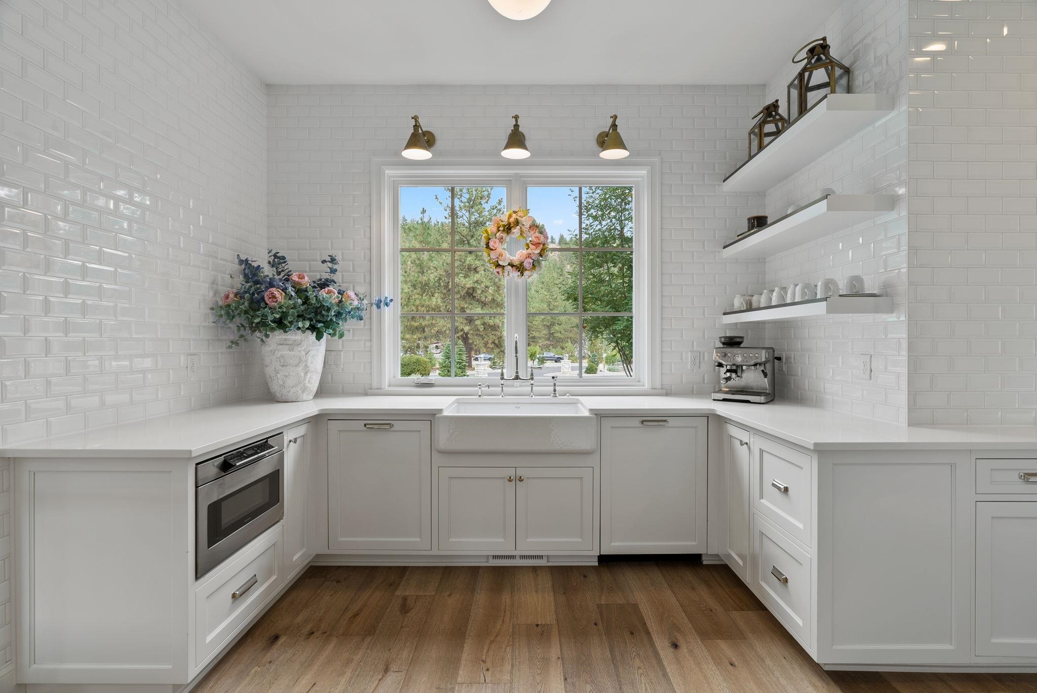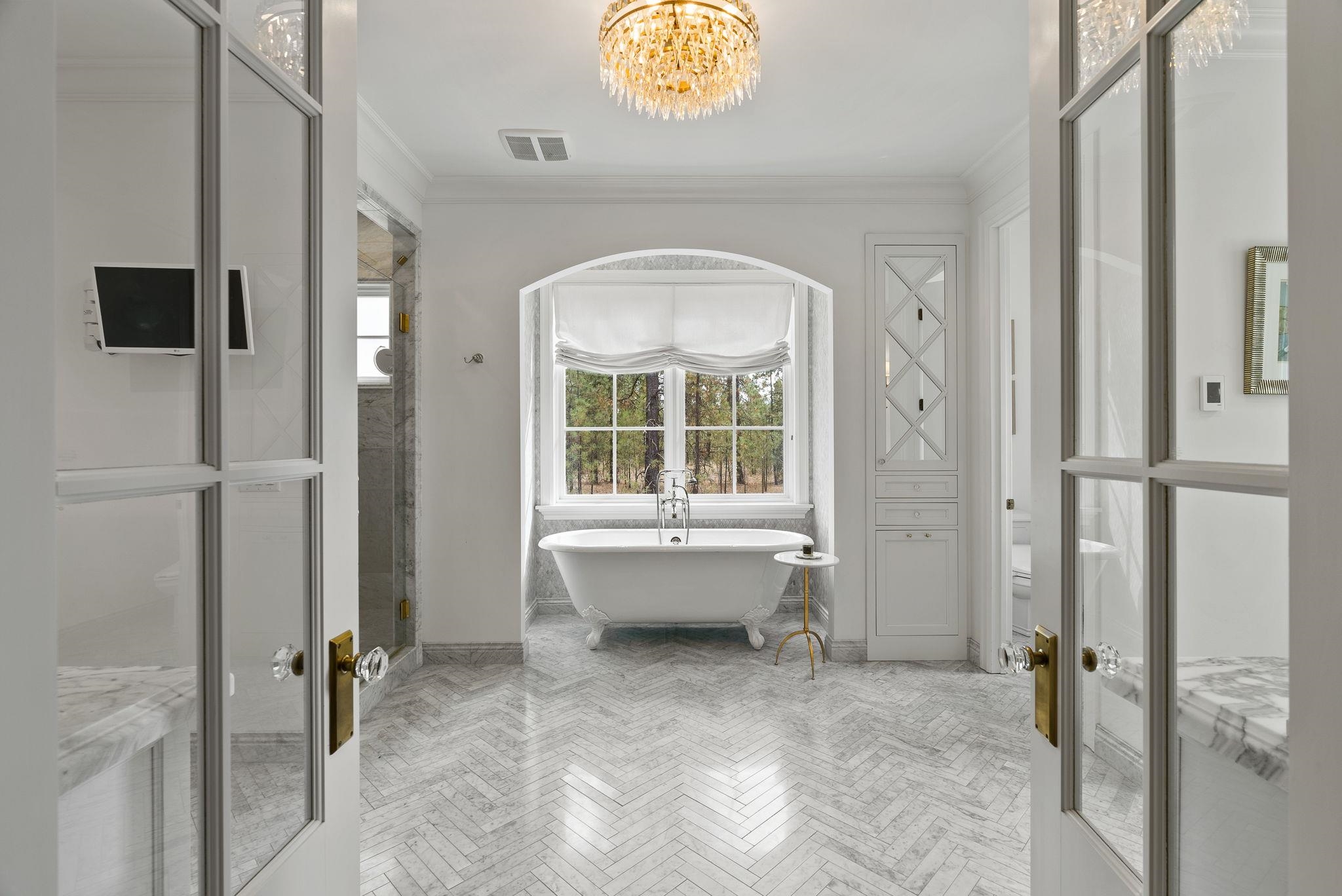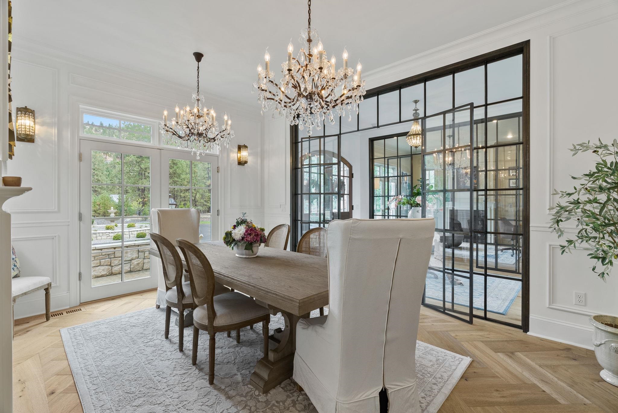 This luxurious French Country Estate is located in North Spokane's exclusive Riverbluff Estates. The custom-built, 2-story home showcases soaring ceilings, abundant natural light, a luxurious primary suite, and a gourmet chef's kitchen complete with a butler's pantry. The expansive outdoor space features a covered patio with an outdoor kitchen and wood-burning fireplace overlooking a resort-style in-ground pool. Professionally finished grounds include exquisite landscape, raised garden beds, and fruit trees. Additional amenities include a covered cabana with a gas fire pit, a finished shop with a home gym, dog wash station, a charming garden house, and fully appointed guest quarters w/ kitchen & laundry. Set on a private lane, this elegant estate is conveniently close to shopping, dining, the Kalispel Golf & Country Club, the Little Spokane River Natural Area, and the renowned St. George's School.
