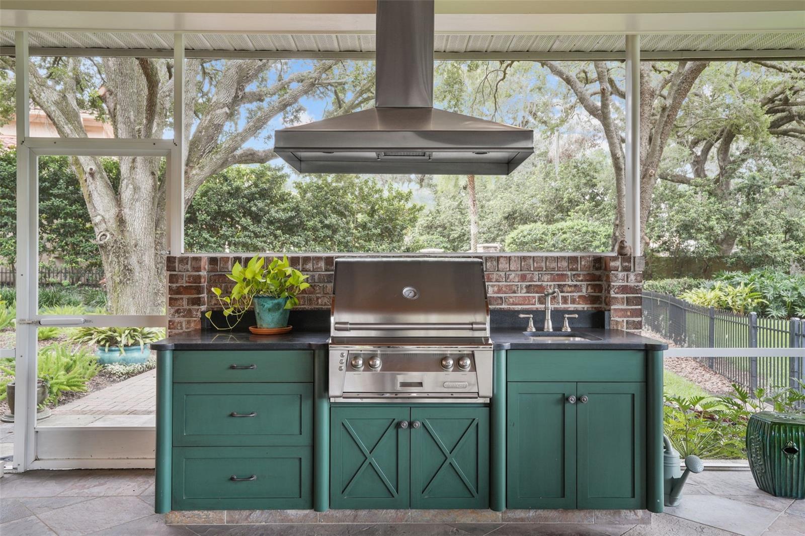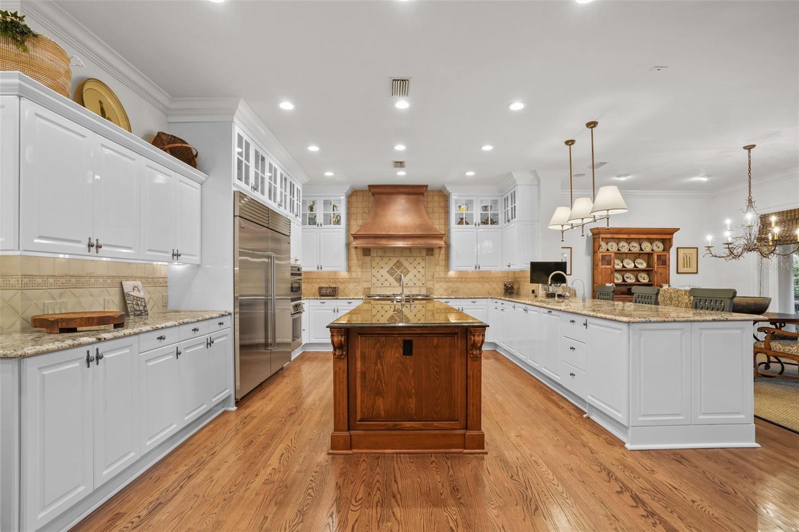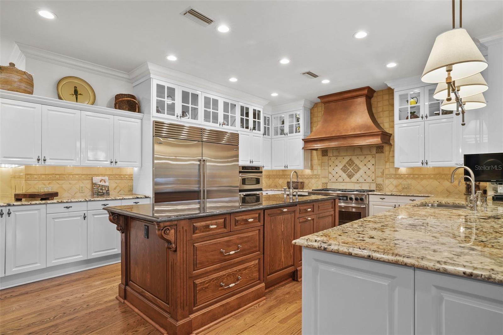 KITCHEN & DINETTE: Anchored by a statement copper range hood, the kitchen features an oversized center island, breakfast bar seating, vegetable sink, gas range with ovens, built-in wall oven and microwave, 2 Bosch dishwashers, and a Sub-Zero refrigerator. The spacious dinette overlooks the vaulted screened patio and enhanced landscaping, offering a private and comfortable setting for everyday meals.