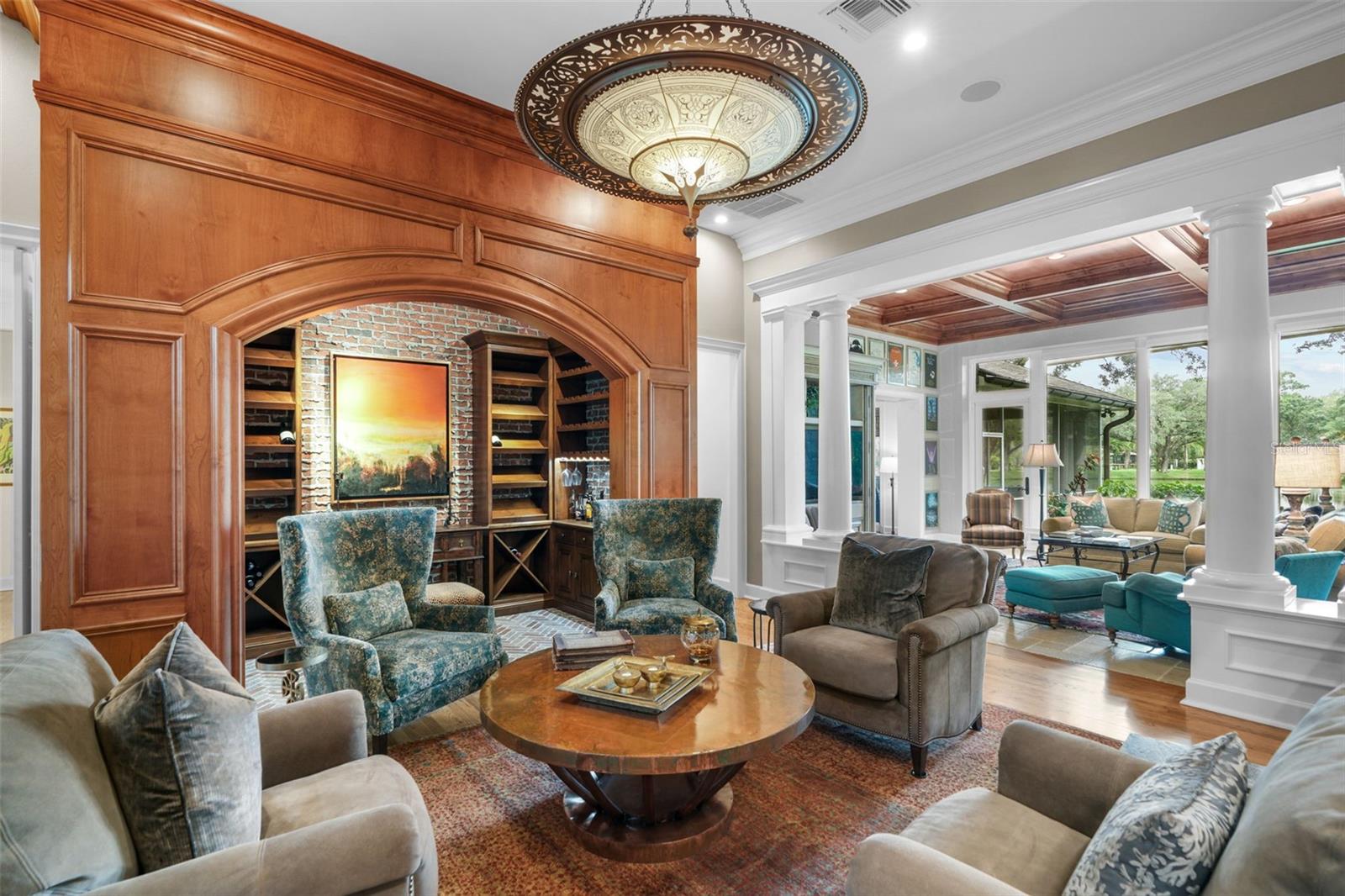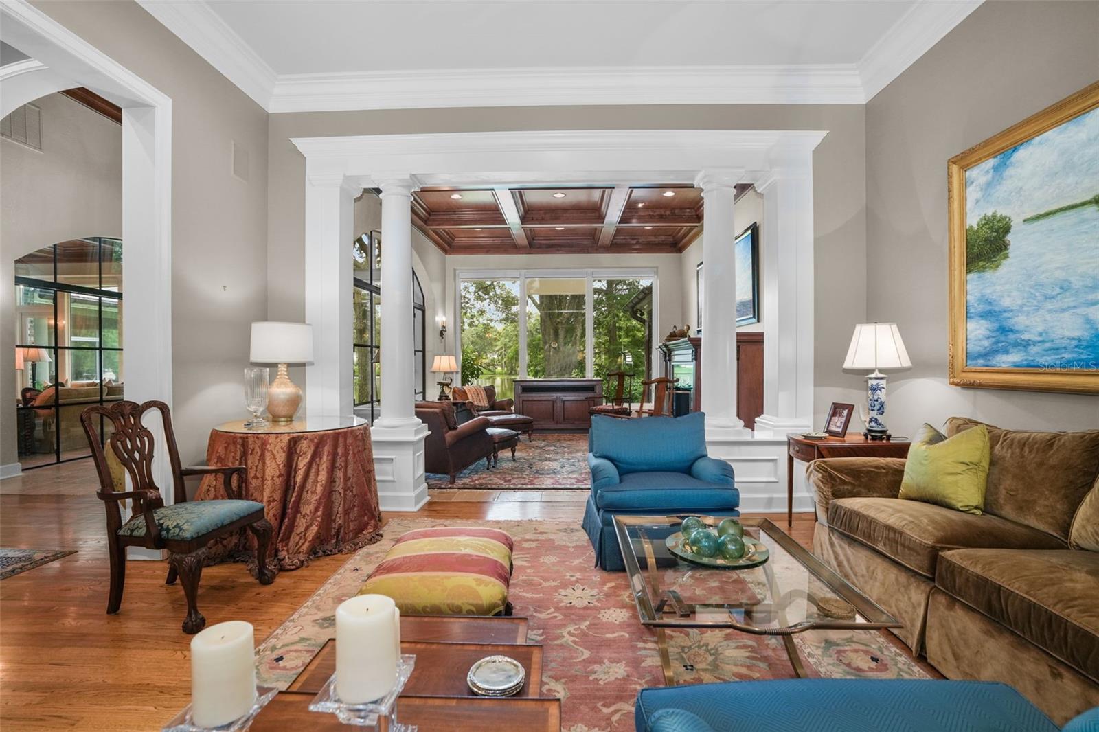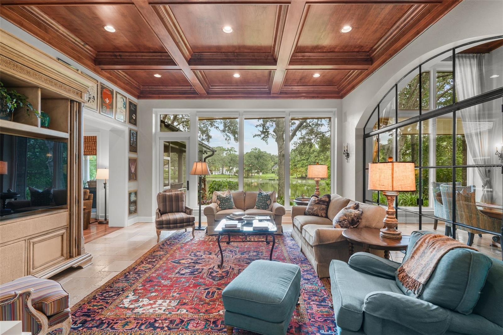 LIVING & ENTERTAINING AREAS: The formal living room provides an elegant setting for entertaining. The family room serves as a welcoming gathering space highlighted by a custom wood coffered ceiling and tranquil pond views. A separate fireplace room also features a custom wood ceiling, creating a warm and inviting retreat.