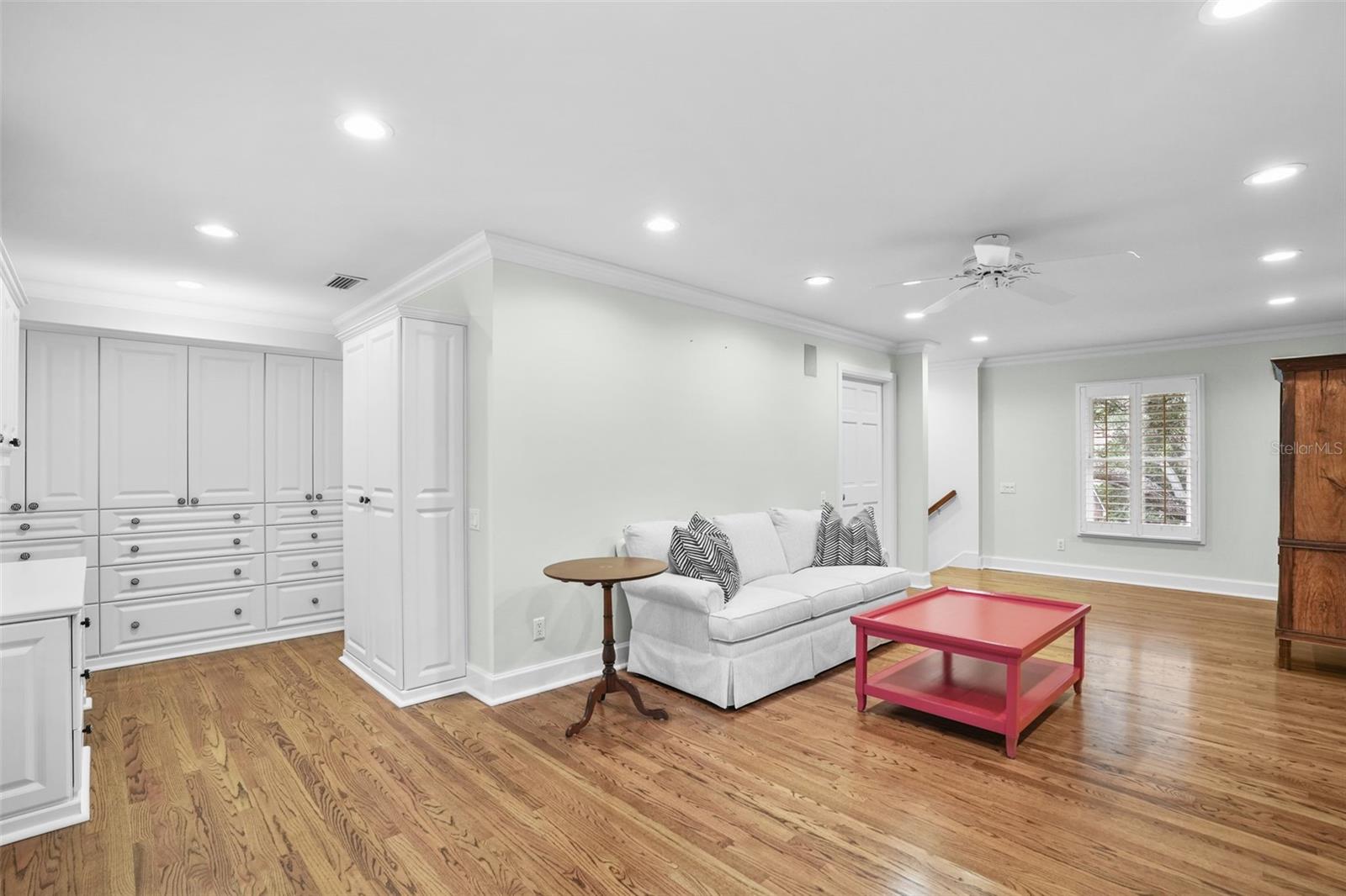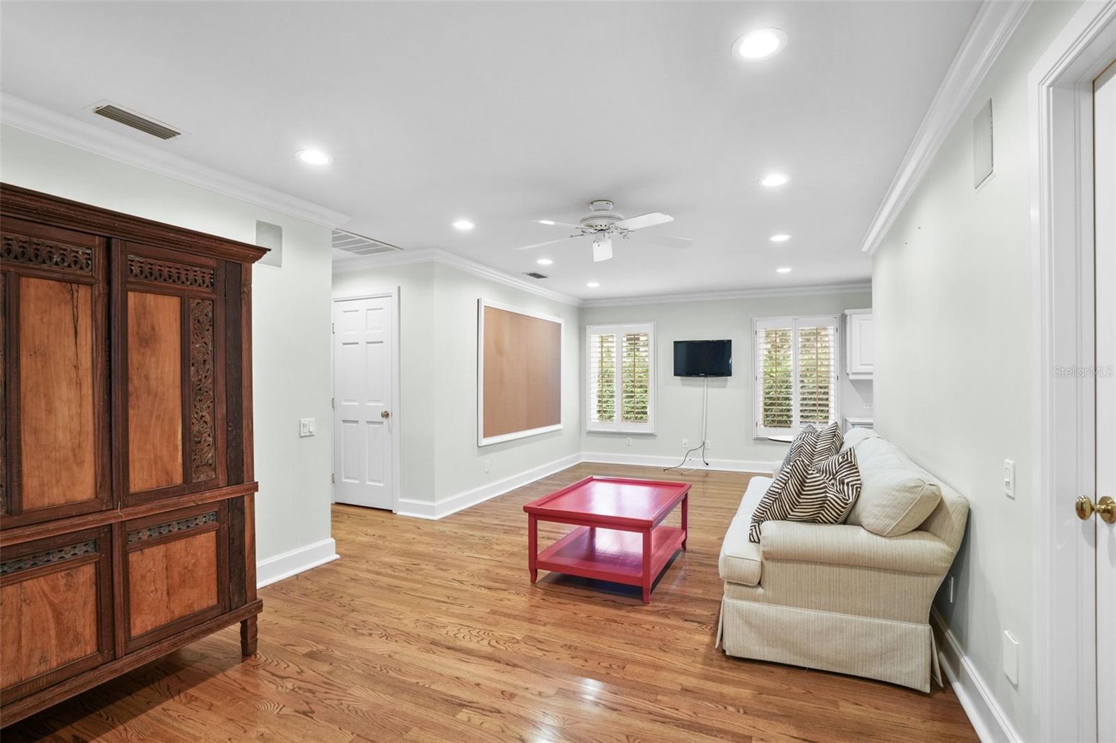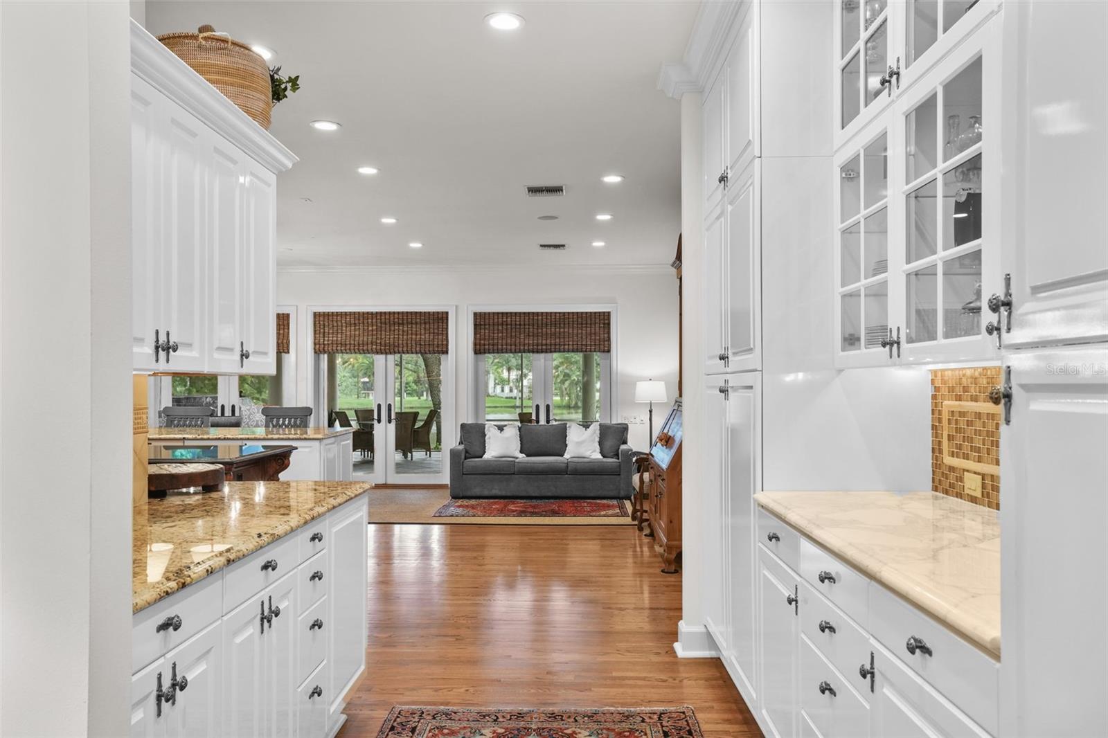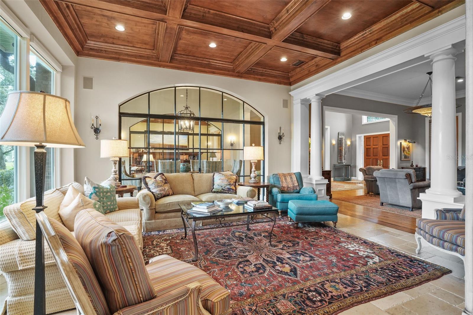 LIVING & ENTERTAINING AREAS: The formal living room provides an elegant setting for entertaining. The family room serves as a welcoming gathering space highlighted by a custom wood coffered ceiling and tranquil pond views. A separate fireplace room also features a custom wood ceiling, creating a warm and inviting retreat.