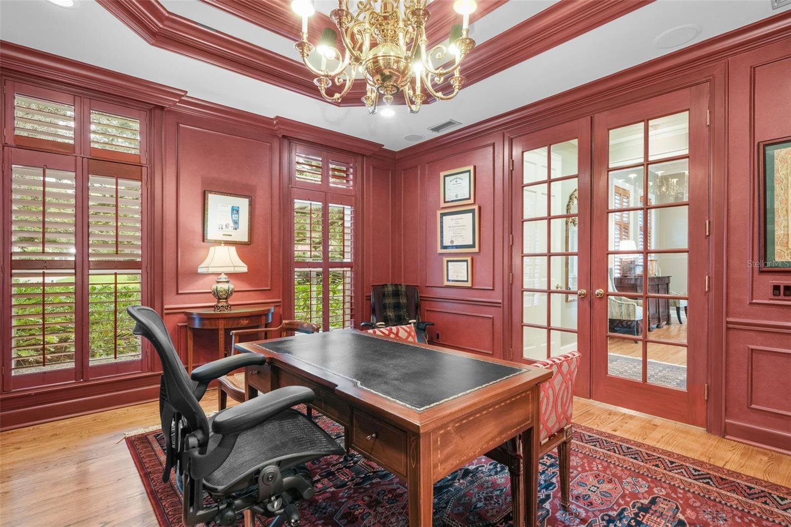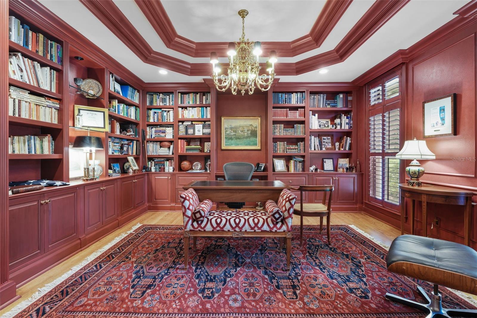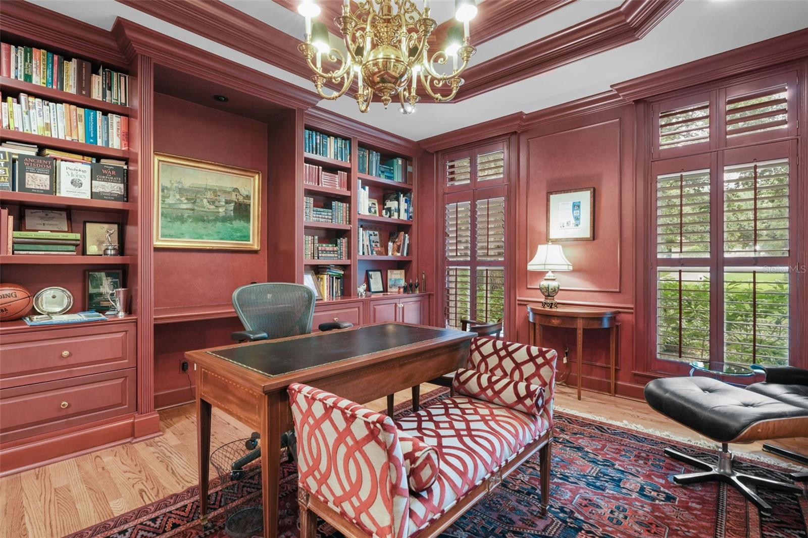 DEDICATED STUDY: A beautifully appointed study features rich built-in bookcases, custom ceiling detail, plantation shutters, and an elegant chandelier.